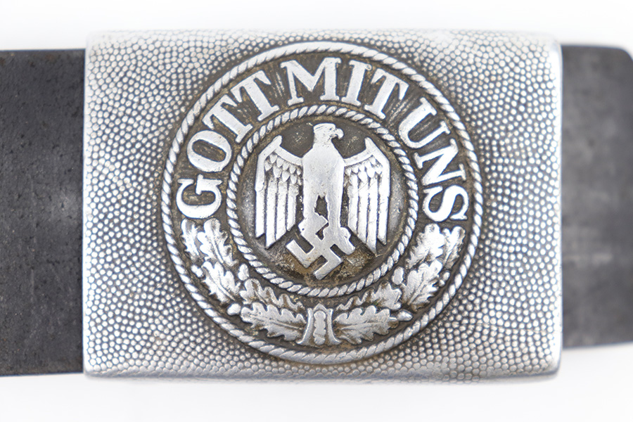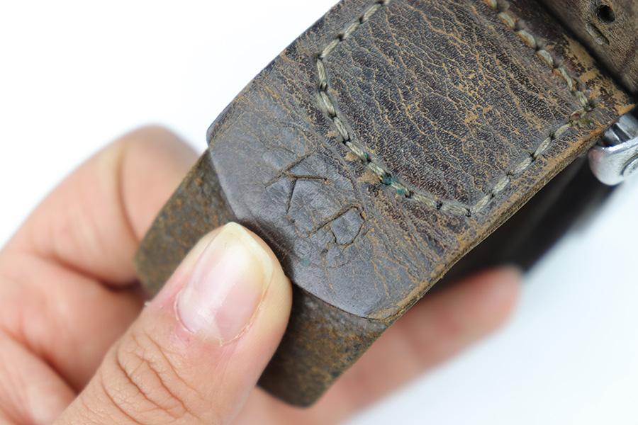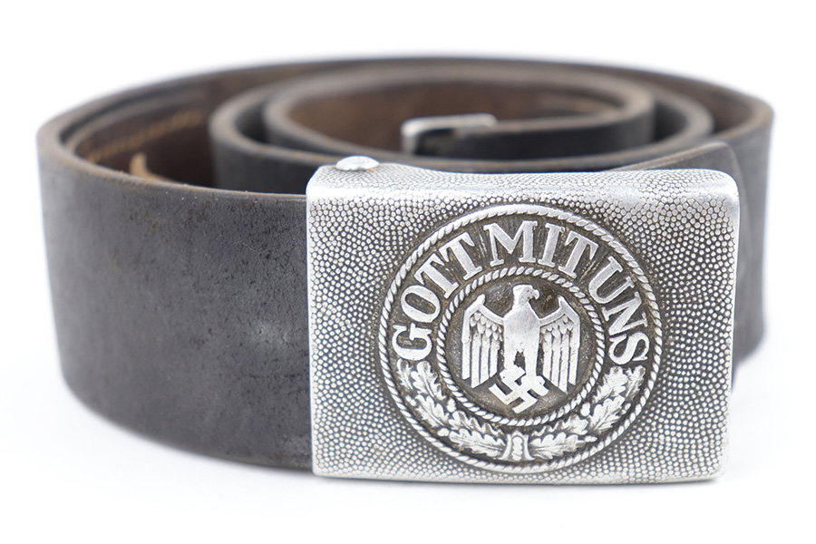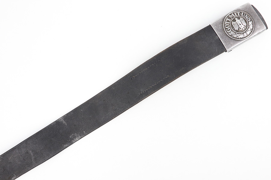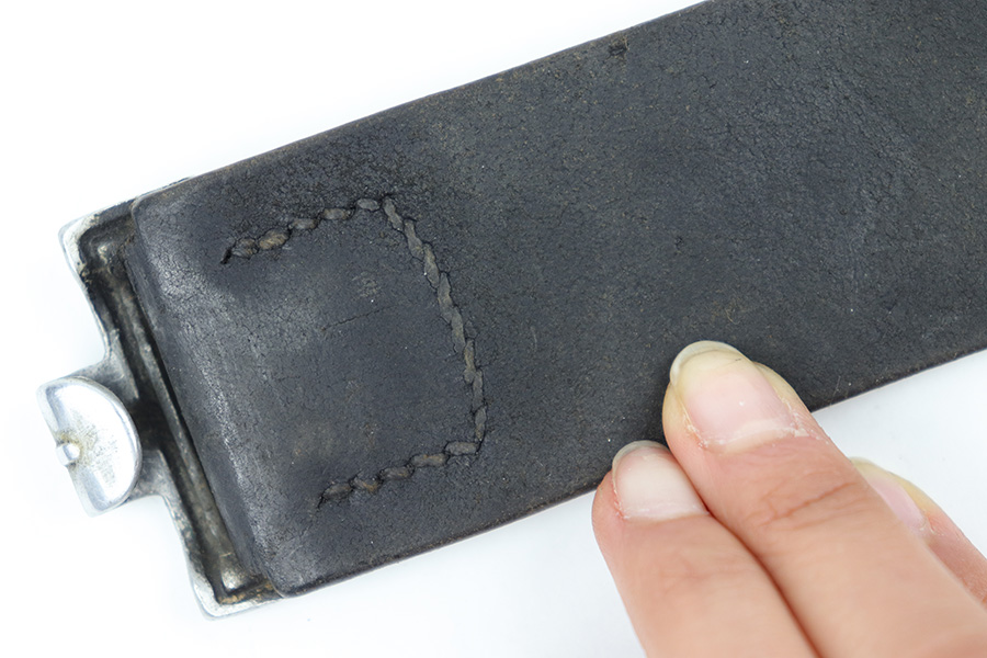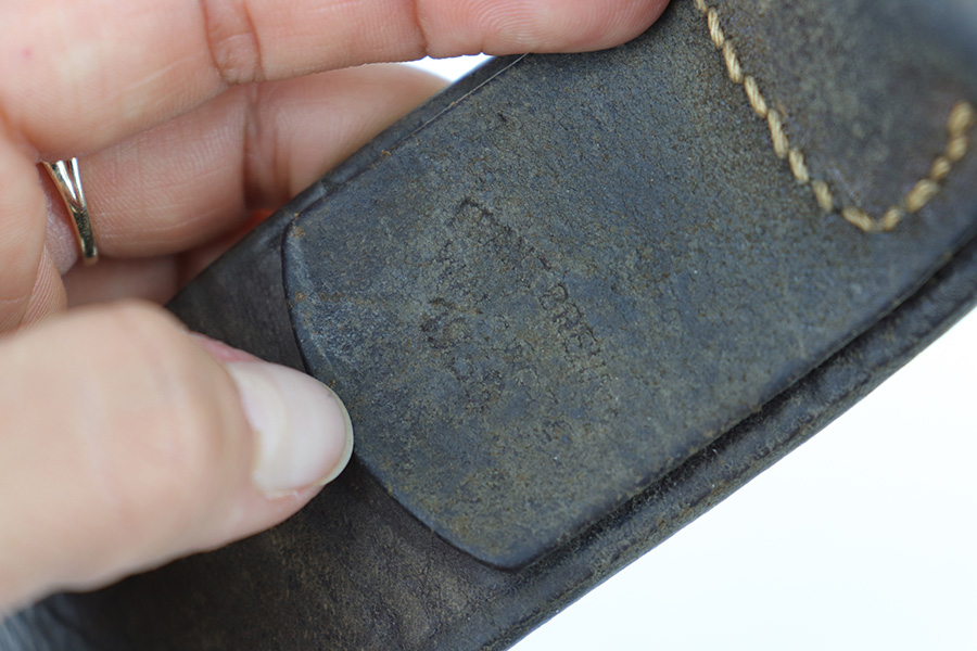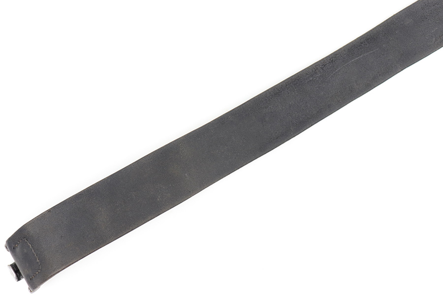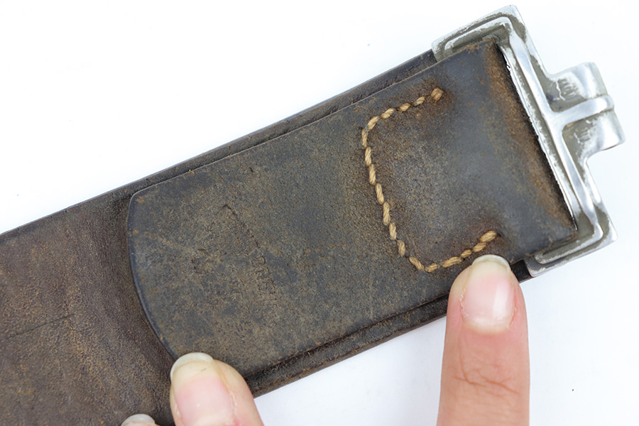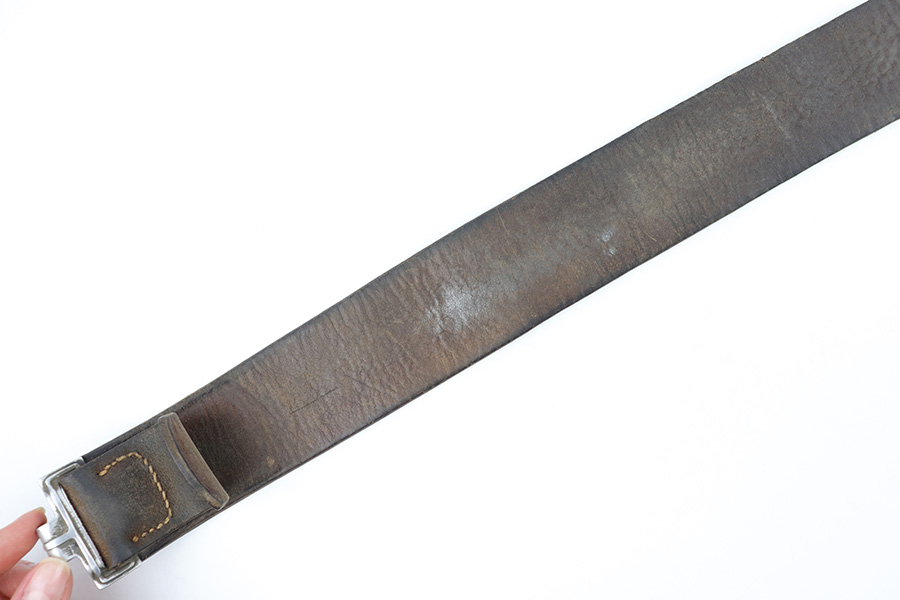 3/24/23 – This is an original WW2 production German Army belt and buckle. The aluminum buckle is in good condition with typical surface patina throughout and high edge wear. The pebble-grain pattern has some smoothness in areas from use and aging. Unmarked on the interior. The leather tab is maker stamped, but the stamp is too faint to read and the initials K.P. are scratched over this marking. The leather belt also has a faint maker and date stamp, but this date is at least visible as 1939. The belt is in great overall condition with some mild wear but no cracking or significant issues.