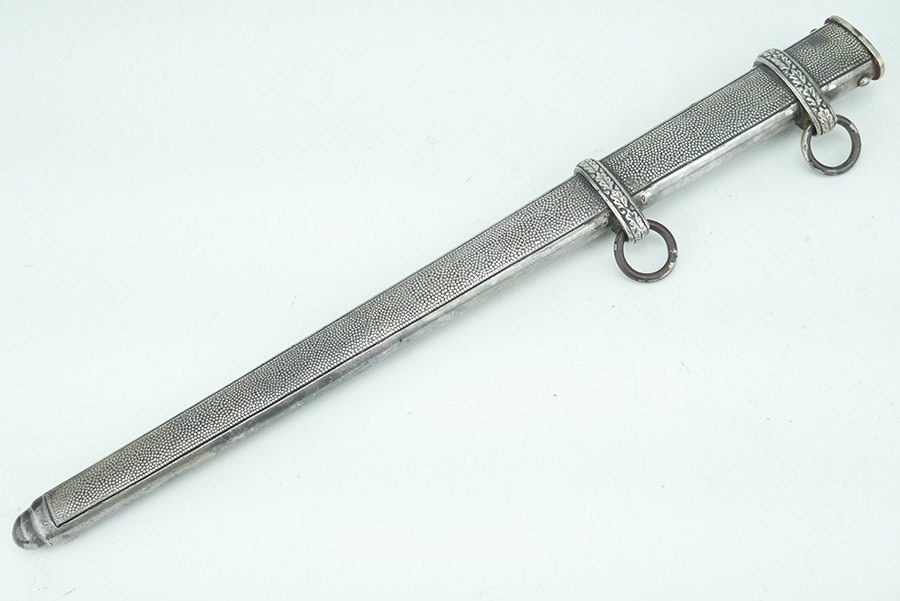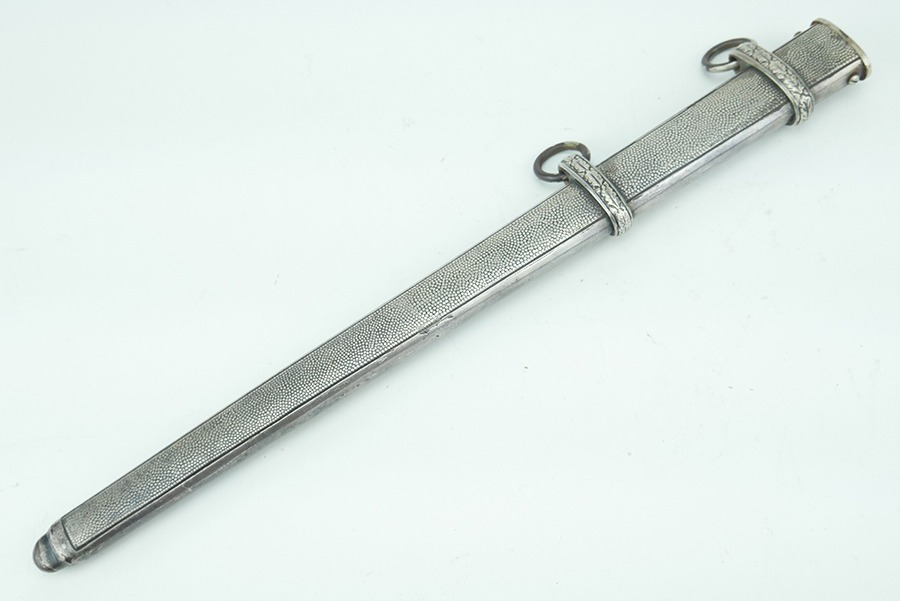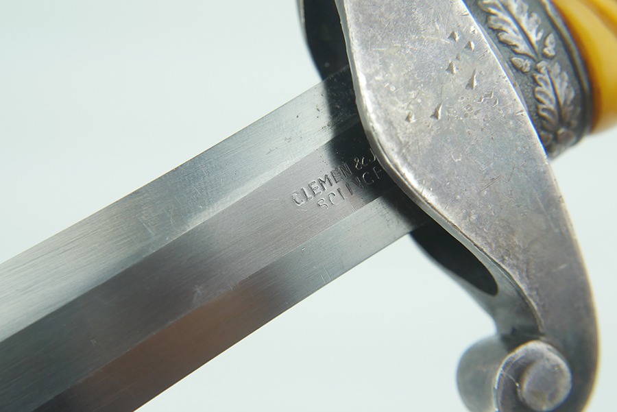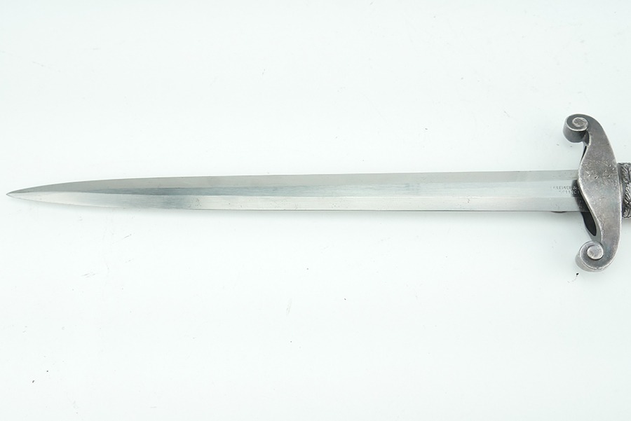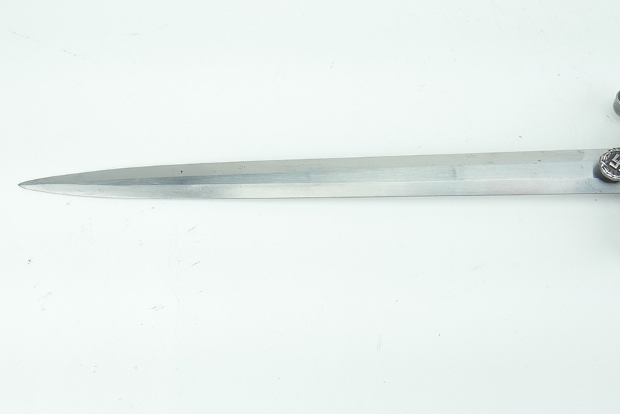 11/13/24 – This is very good example of a WW2 German Army Dagger, by Clemen & Jung. The dagger has some minor wear and a few spots of discoloration. The blade is in very good shape but has some signs of scabbard wear. The blade is maker marked on both sides of the blade as is common with Clemen & Jung. The handle has no cracks or chips. The scabbard has no dents or major issues as well. The eagle on the cross guard appears to have been repaired at some point. This break is common and not unheard of as this dagger is missing the leather buffer. When this buffer is missing the scabbard can close far enough to wedge the swastika up and cause it to break.