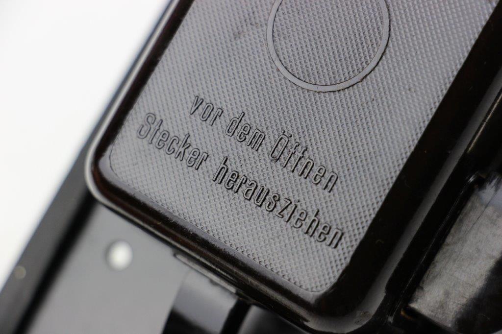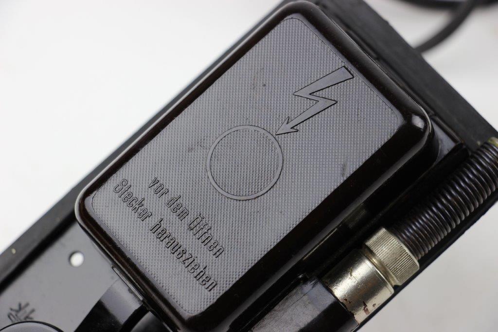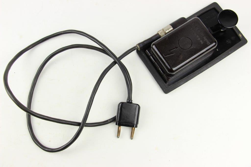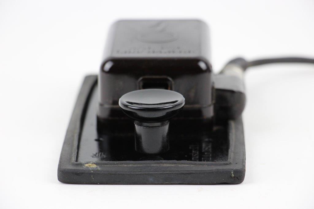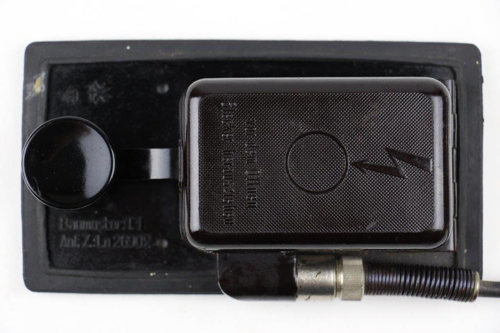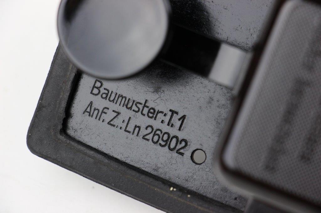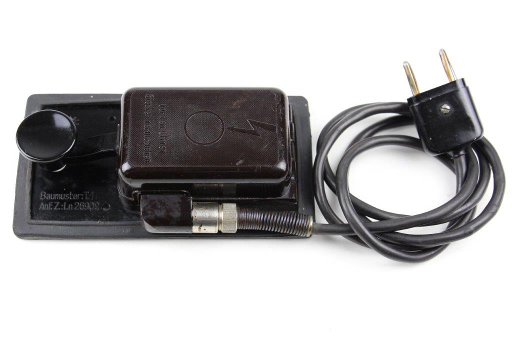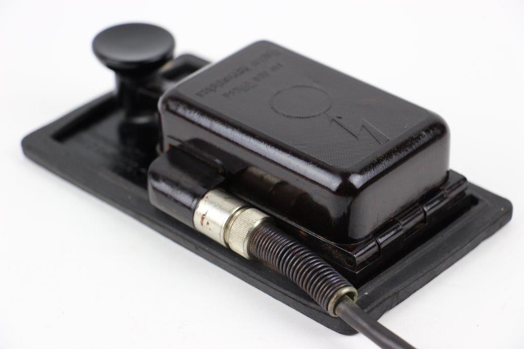 9/26/24 – This is an excellent condition WW2 German Morse Code Telegraph Key. Labeled as the Baumuster T1 Anf. Z.: Ln 26902 on the base, along with a maker stamp as shown. This model dates back to 1934 and was used on Luftwaffe aircraft in conjunction with a FuG10 radio. The base has the original rubber edge and base cover (rare), and also includes the original wiring and radio plug, all of which are in minty condition. The base measures approximately 15cm long and 8.5cm wide. The key functions with a satisfying “click” when compressed, and the black bakelite cover moves smoothly on its’ hinge to open and close with ease. Clean internals with all screws and springs intact. The bakelite has no cracks or chips and is in beautiful condition. We’ve never seen a nicer example offered!