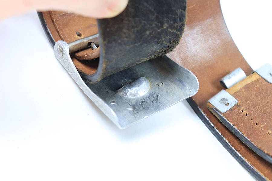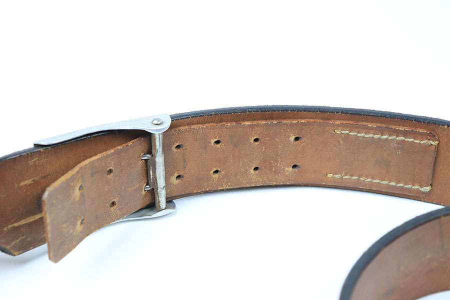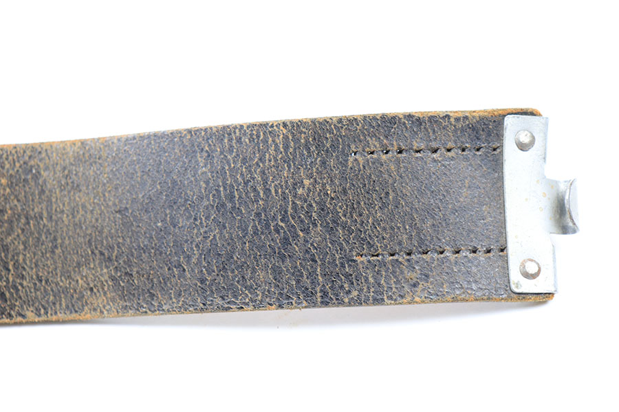 8/12/21 – This is a WW2 Aluminum Gott Mit Uns German military belt buckle with a black leather belt. The belt is in good condition with some surface wear and signs of previous use / aging. There’s mostly minor surface wear, and no deep scratches or cracks in leather. The metal hooked end of the belt is missing the stitching. The buckle is a later wartime example and in great condition. No maker markings or stamps.