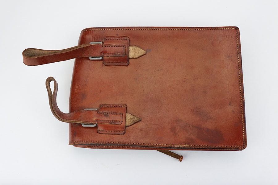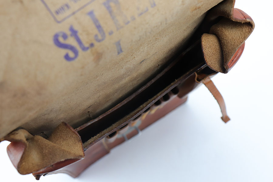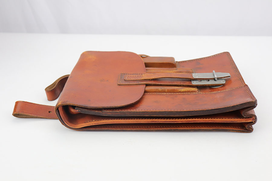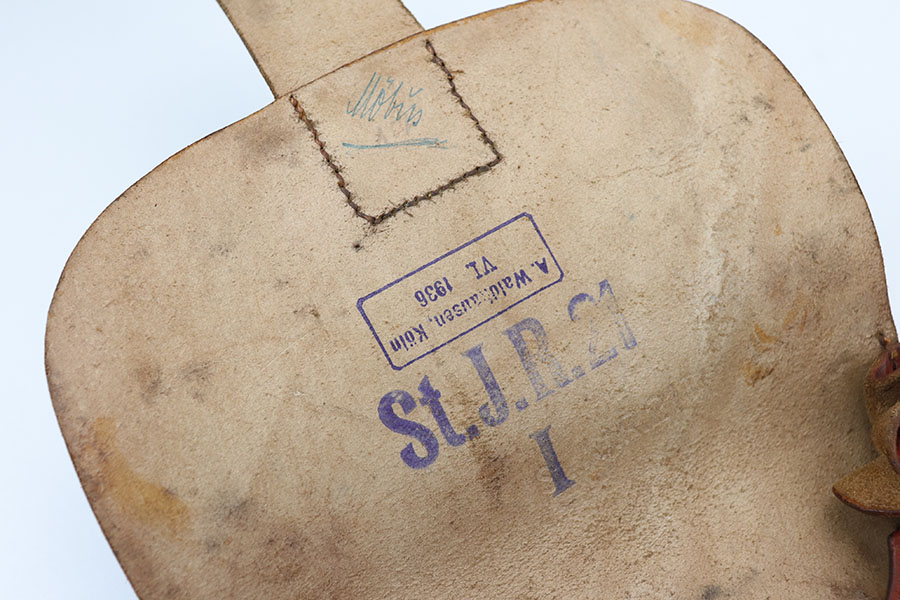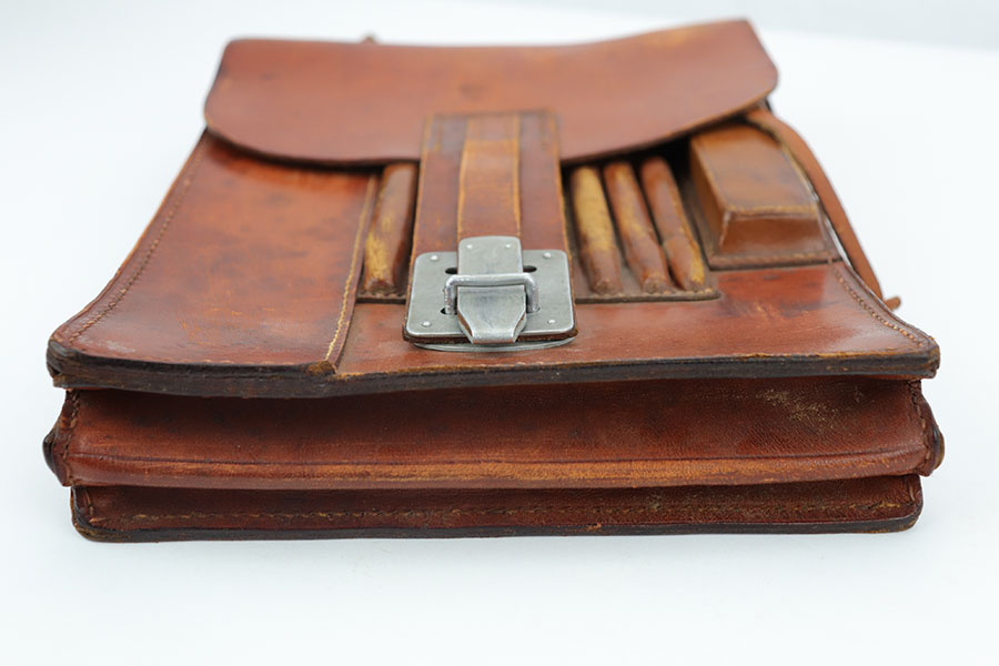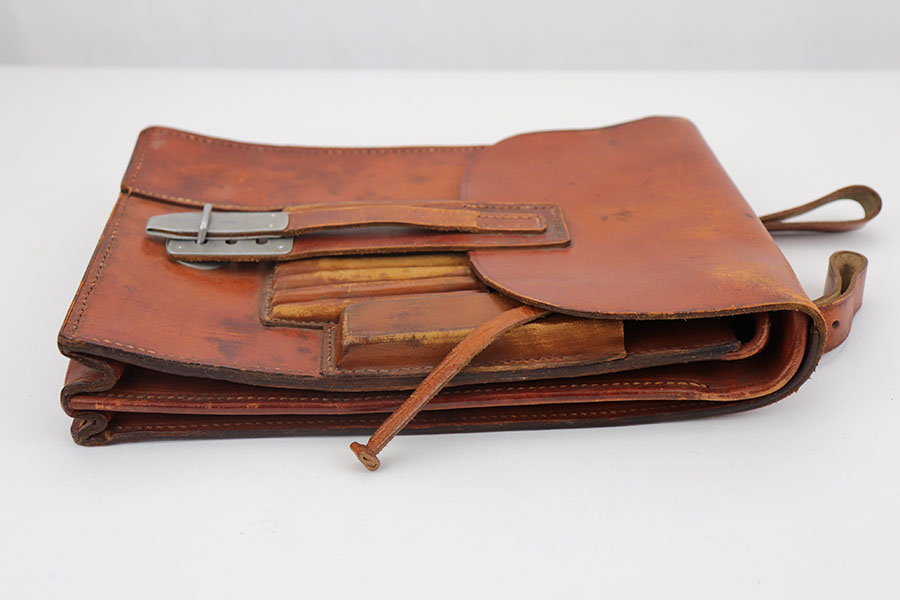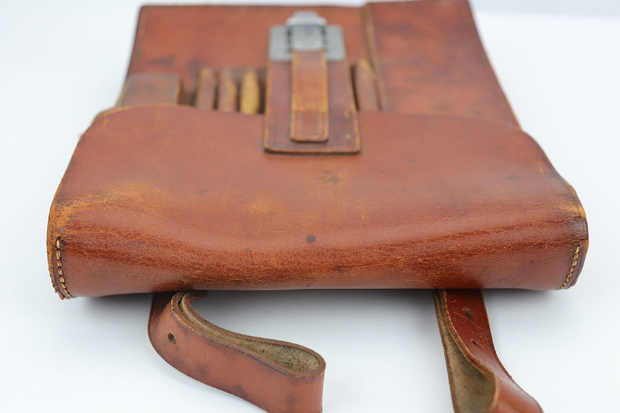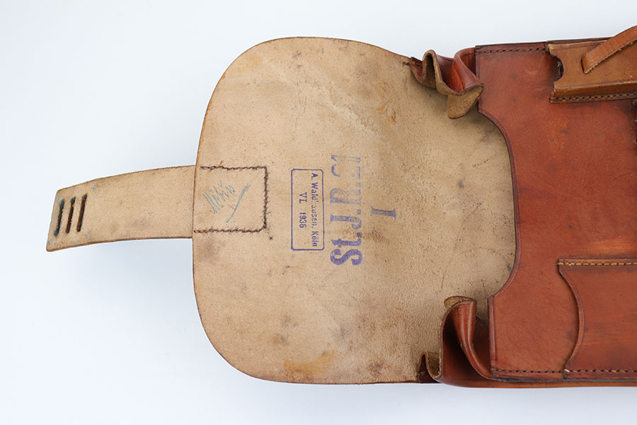 9/6/19 – This is an original WW2 era German leather map / documents pouch. These pouches were often worn by German officers during WW2 who carried important war documents such as orders, plans, maps, and positions. The interior leather has two ink stamps. One reads “A. Waldkausen, Koln VI 1936” and the other is “St. J.R. 21” There is another “St. /J.R.21 T” stamped on the interior leather (not in ink). There are no other markings. The leather is very strong and minty with a crisp, clean interior. The stitching is all original and completely in tact. There are pouches for pencils and erasers (with a lift strap). All original guaranteed. Beautiful collector condition.