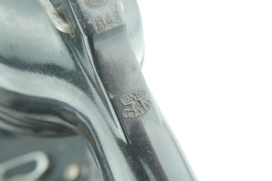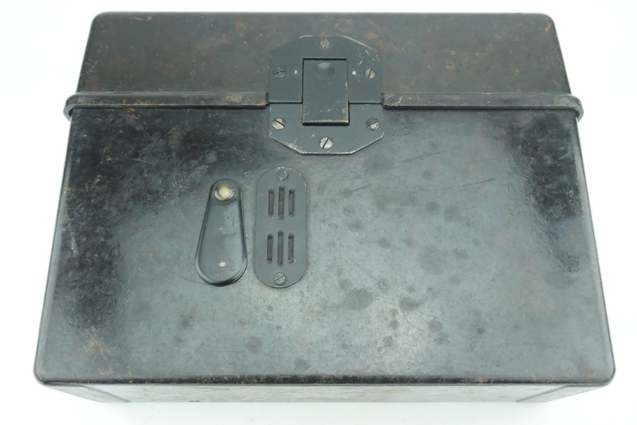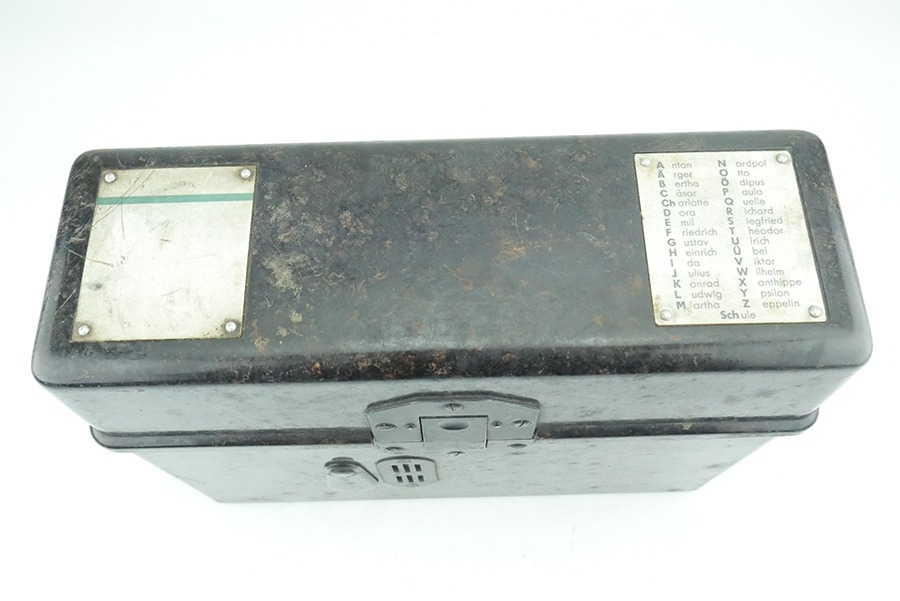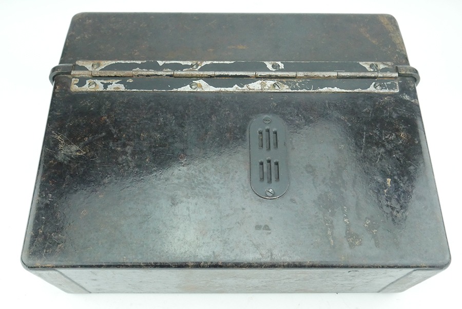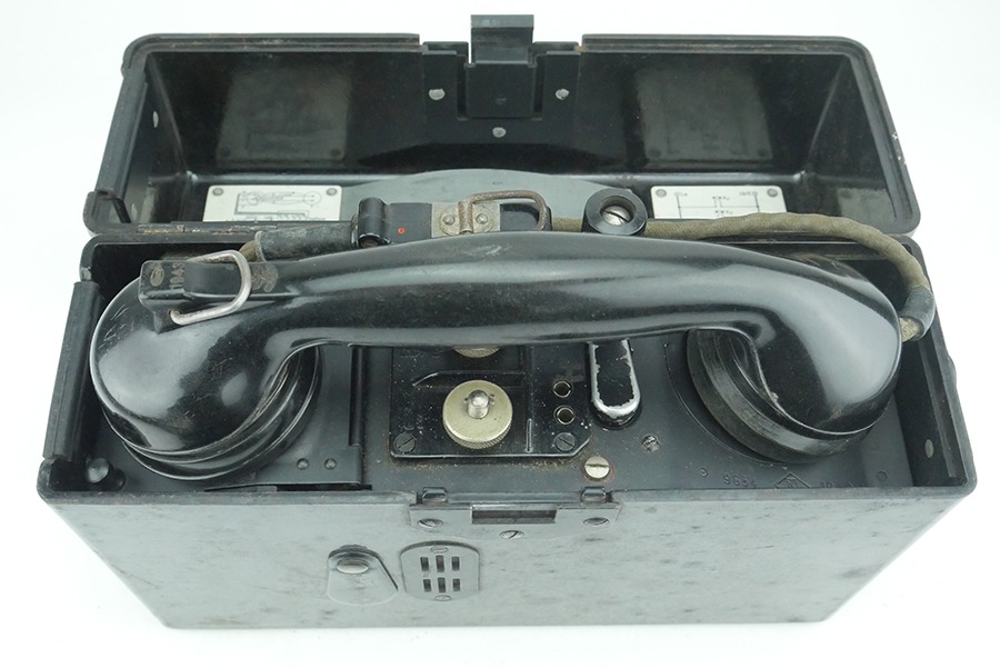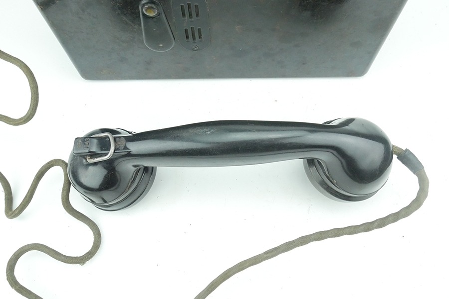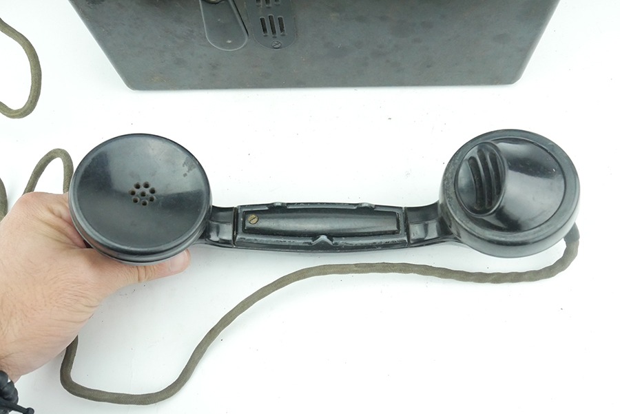 11/5/24 – This is an excellent example of a 1942 German Feldfernsprecher 33 or FF33 Field Phone. This phone is hand cranked and comes with it’s original bakelite case. The case on this example does have some scratches and wear, but no major cracks or chips. This example has the original handset and crank. The internal unit is waffen stamped as well as the handset. The unit has not seized up and the crank appears to be working still.