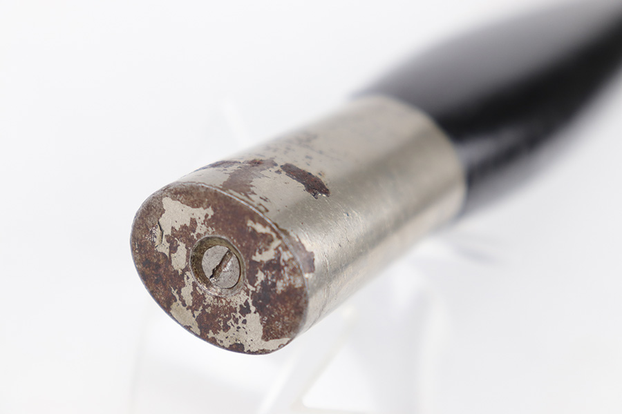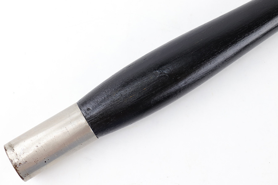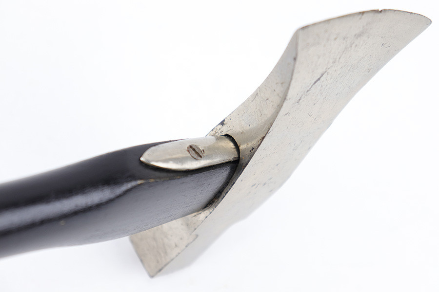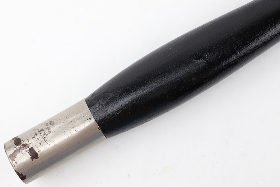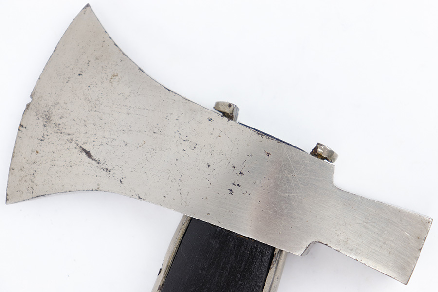 7/5/23 – This is a WW2 German Fireman’s Dress / Parade Axe. The Axe measures approximately 14 inches long and the head is approximately 5.5 inches wide. The steel head of the axe has some mild surface oxidation and speckling patina throughout. There’s a small chip in the edge as well. The wood handle is painted black and in great condition. The toe / base of the axe handle has mild patina and discoloration from age. There are no markings or stamps.