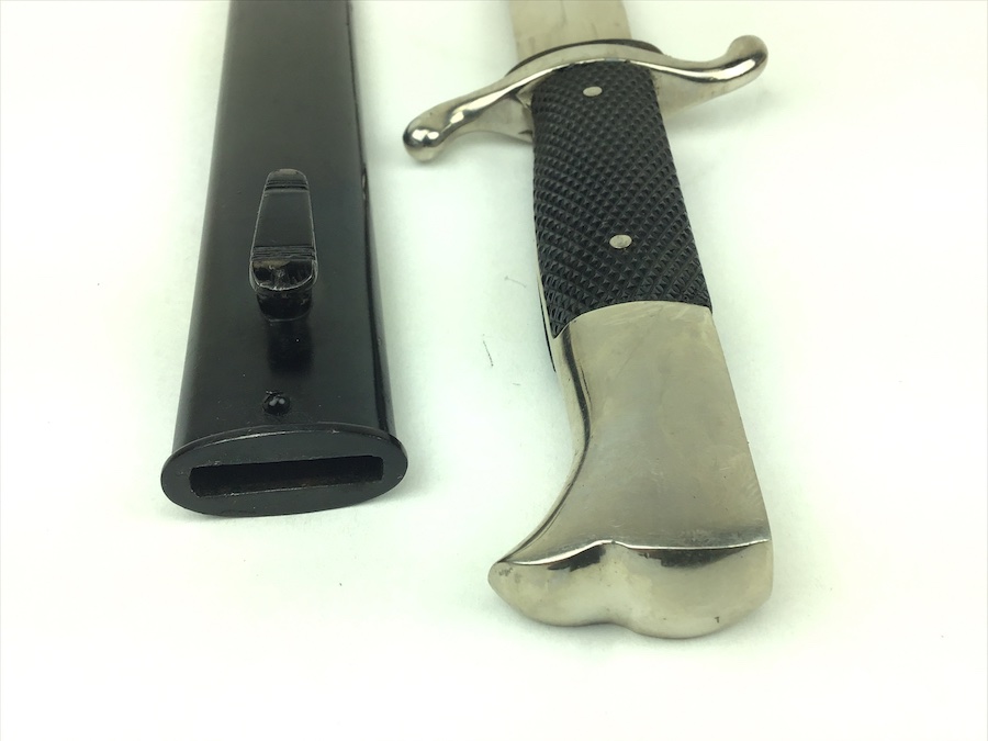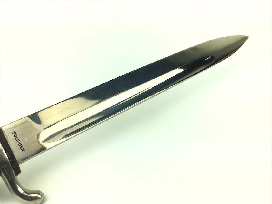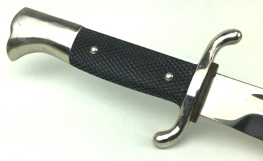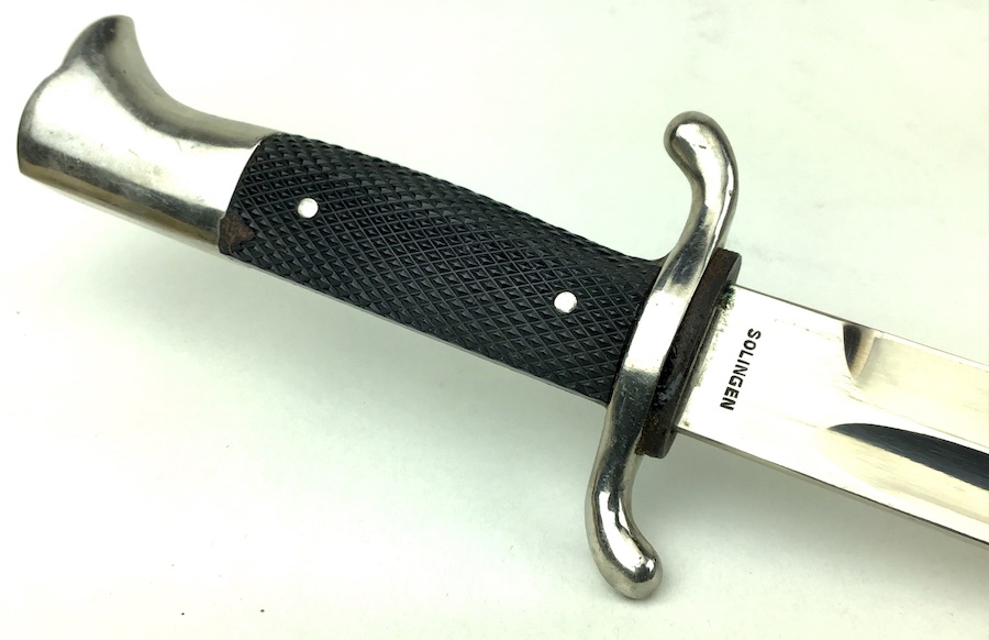 4/9/20 – Original and excellent condition, WWII German Fireman’s’ Dress Bayonet with Scabbard. Note, there is no release button or slot for a rifle lug. Dress bayonet for ceremonial wear by a fireman with his “walking out” or evening dress uniform. All German government officials wore a sidearm with their dress uniform. Nickel plating in excellent shape with a minor area of spotting near one of the blade tips. Very little scabbard wear. Scabbard is excellent as well with no dents. 15-½” total length, 14-½” without scabbard, blade measures 9-¾ inches. Beautiful grips. Nice piece.