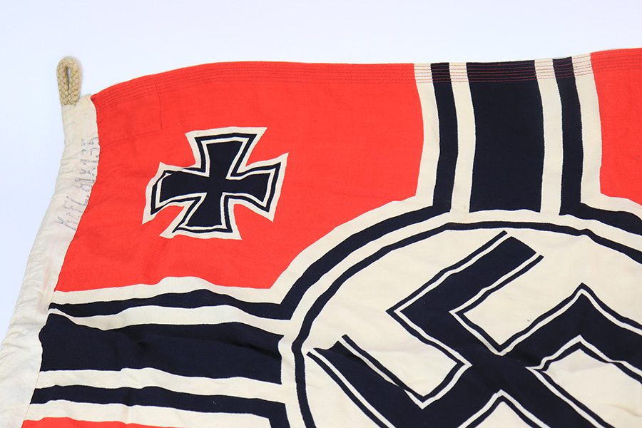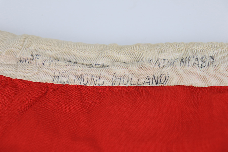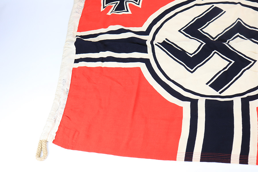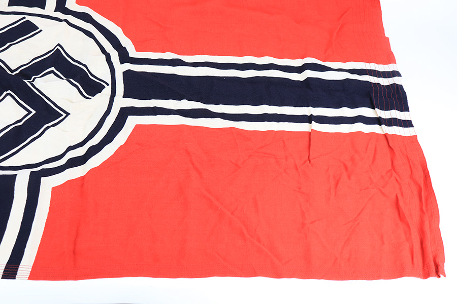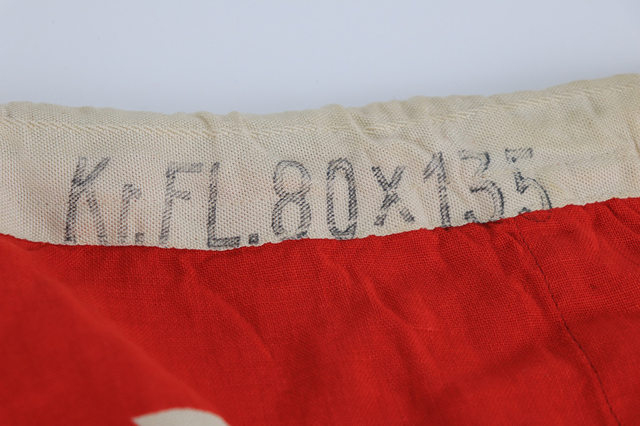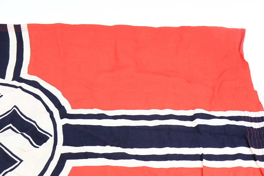 3/16/22 – This is an original WW2 production Nazi flag. The flag, according to the ink stamp near the attachment rope, was made in Holland during the war. Great overall condition with minimal staining and no notable rips or tears. The flag is 80×135 cm which is about 47 x 28 inches. Double sided with excellent stitching throughout and the original rope attached.