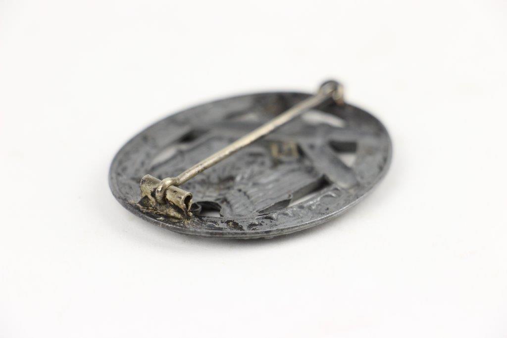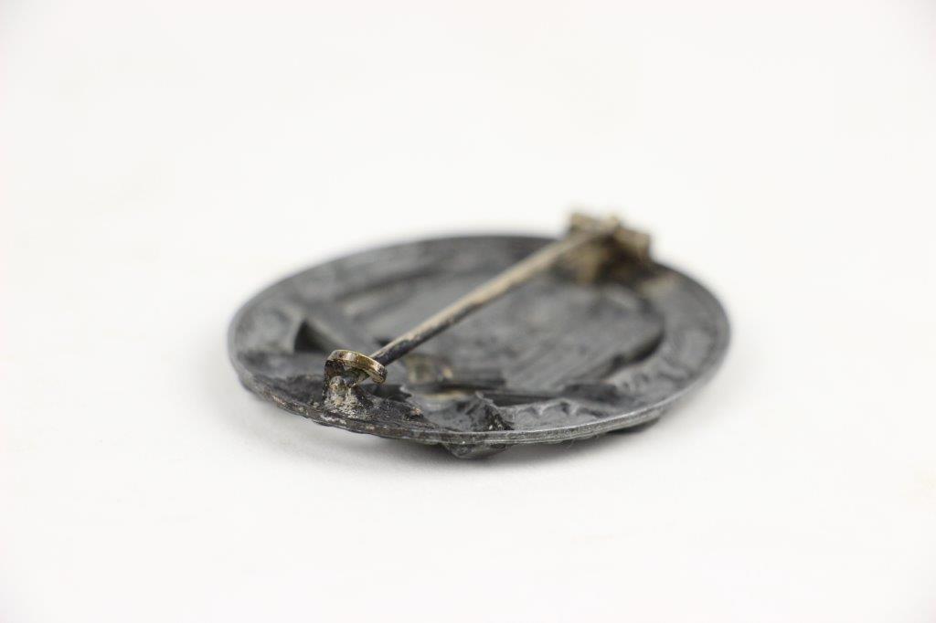 7/5/24 – This is a WW2 German General Assault Badge. The badge measures ~42mm wide and ~52mm tall. The badge is made from silvered zinc with a hollowed interior. The badge exterior has natural age patina and high edge wear throughout, but great visible details. The reverse shows slight discoloration and a barrel hinge pin. The pin hook is bent, so not currently functional, and the dark stains near the hinge and hook indicate this was likely repaired. Price reduced accordingly.