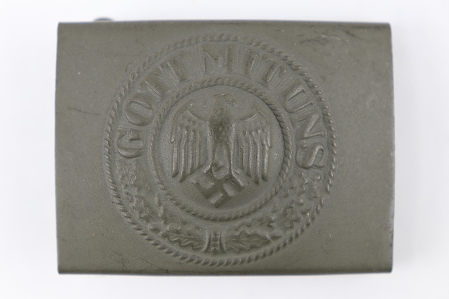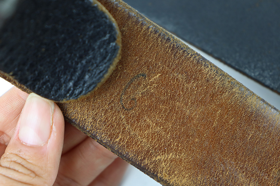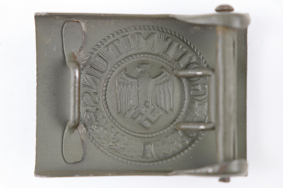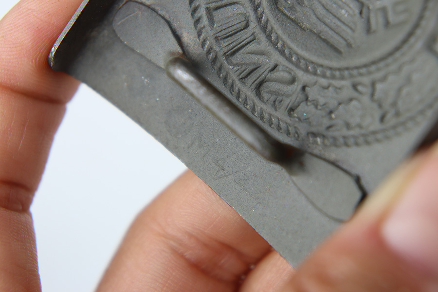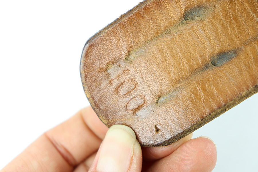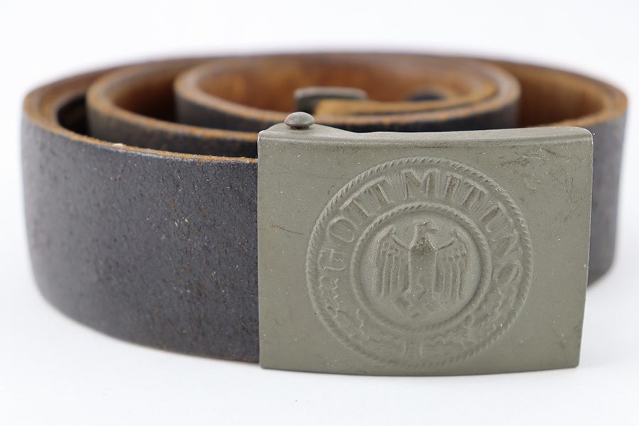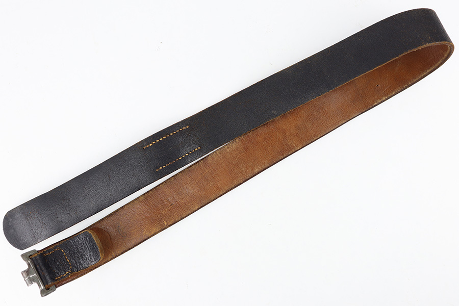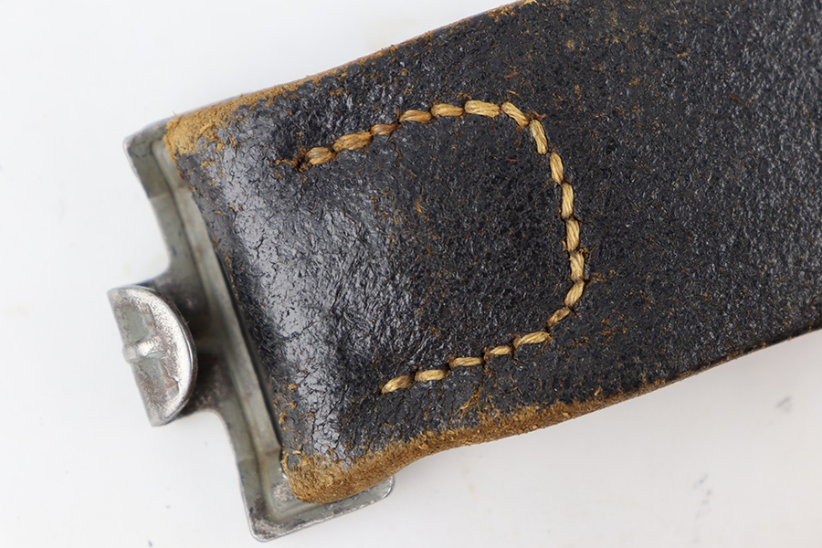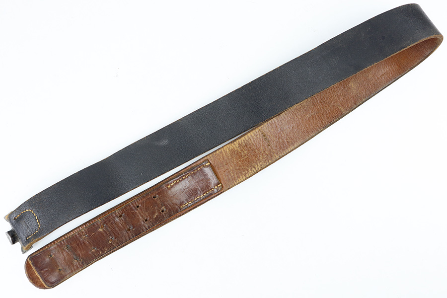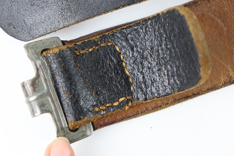 8/22/23 – This is an original WW2 production German Heer Army belt and buckle. The buckle is in great condition with some very mild surface scuffs but excellent painted finish throughout. The interior of the buckle is stamped RZM m4/44, for Paul Cramer. This manufacturer is fairly scarce as they are known to have made a small number of German Army buckles stamped with the RZM maker code during WW2. The buckle comes with an original leather belt with a black dyed exterior and brown interior leather. The size-adjusting end of the belt is size stamped “100”. The opposite, hooked end of the belt has a faint remnant of a circular maker stamp in the leather, but it’s no longer legible. The leather has some typical, mild surface wear throughout but no cracking or major issues.
