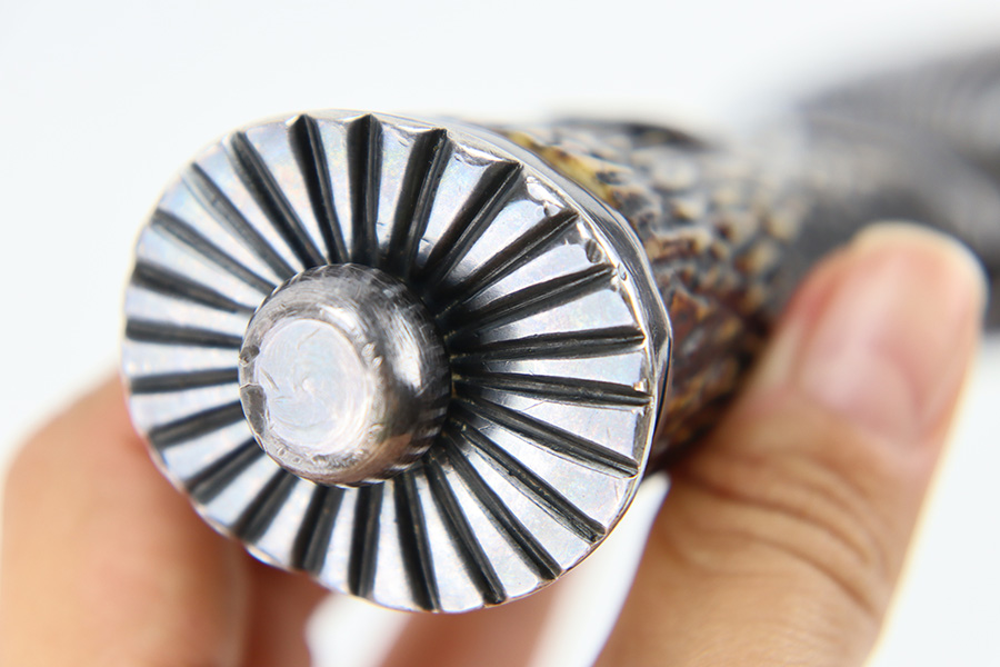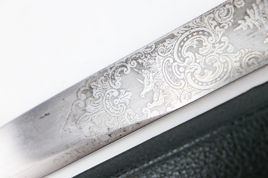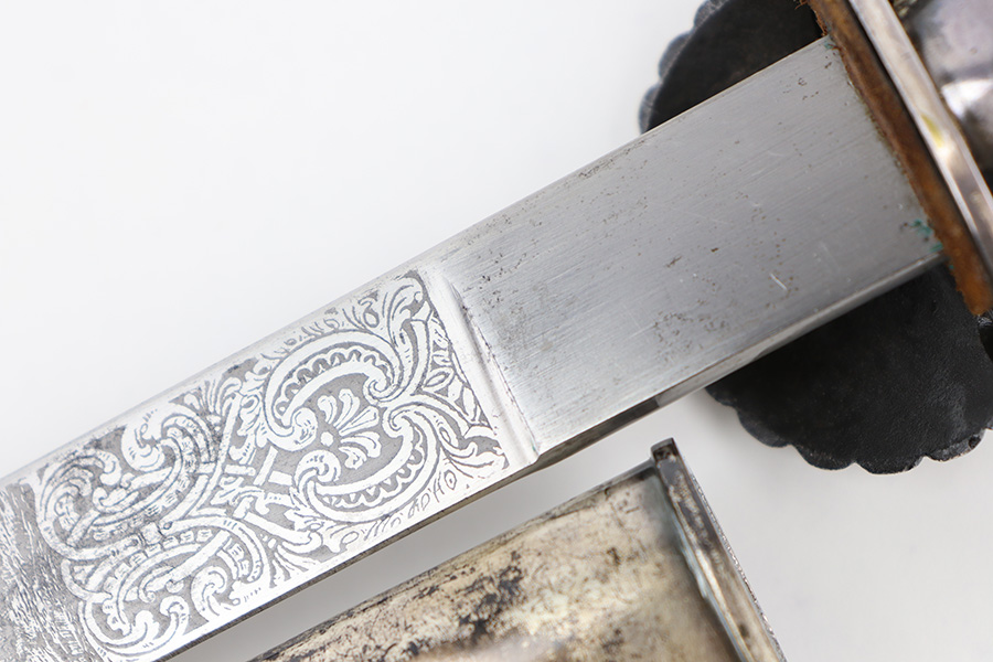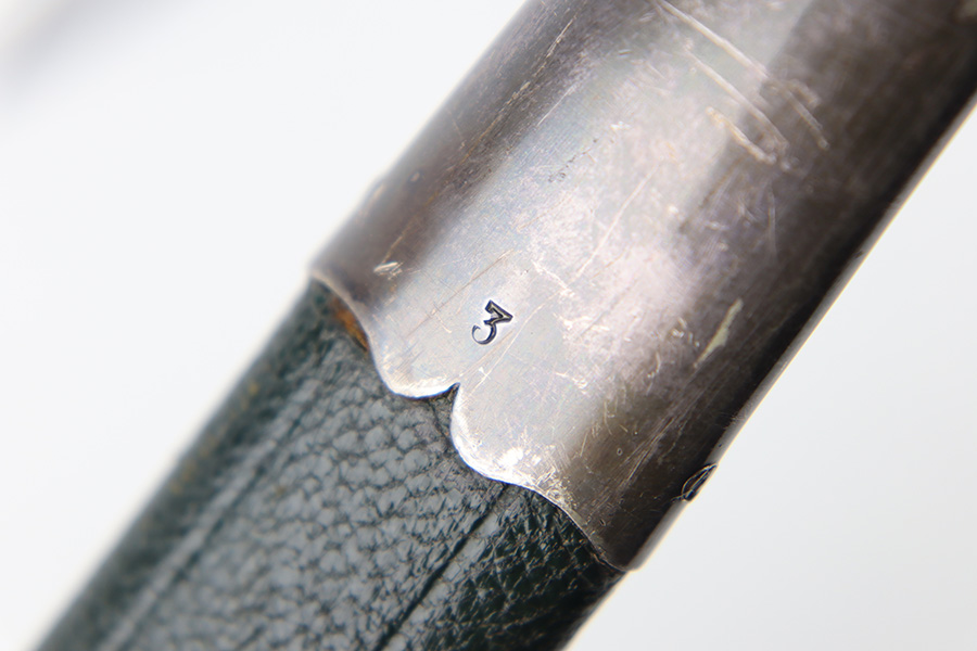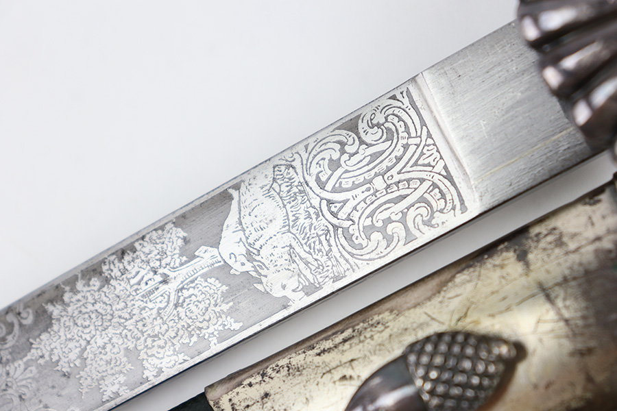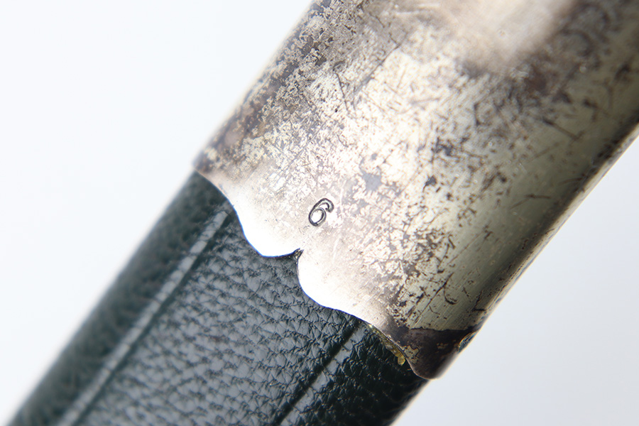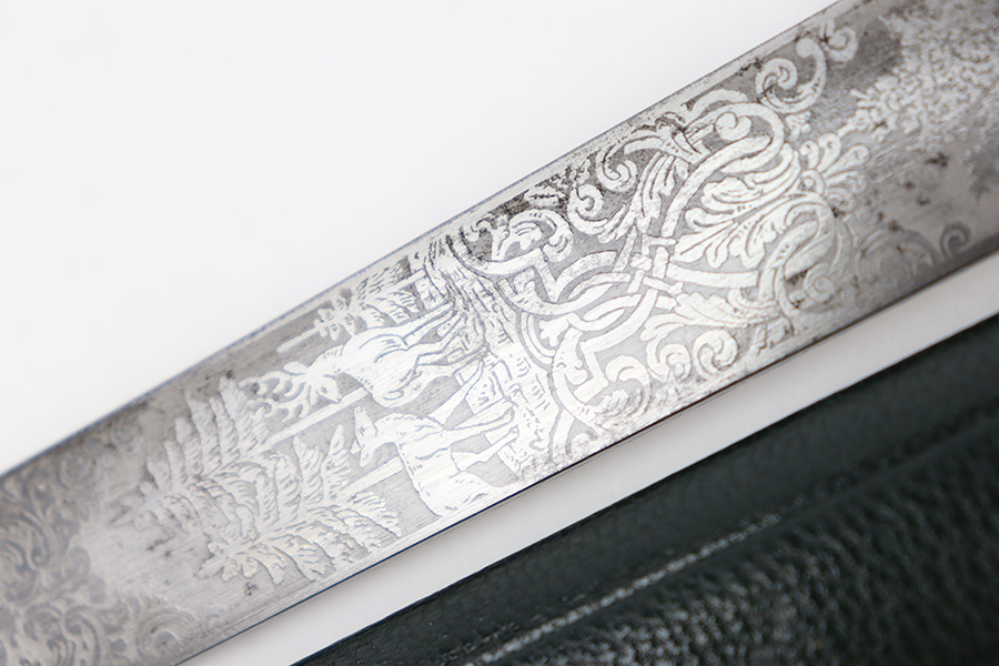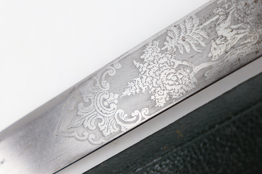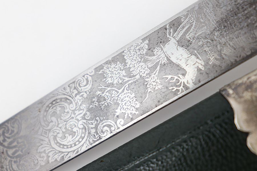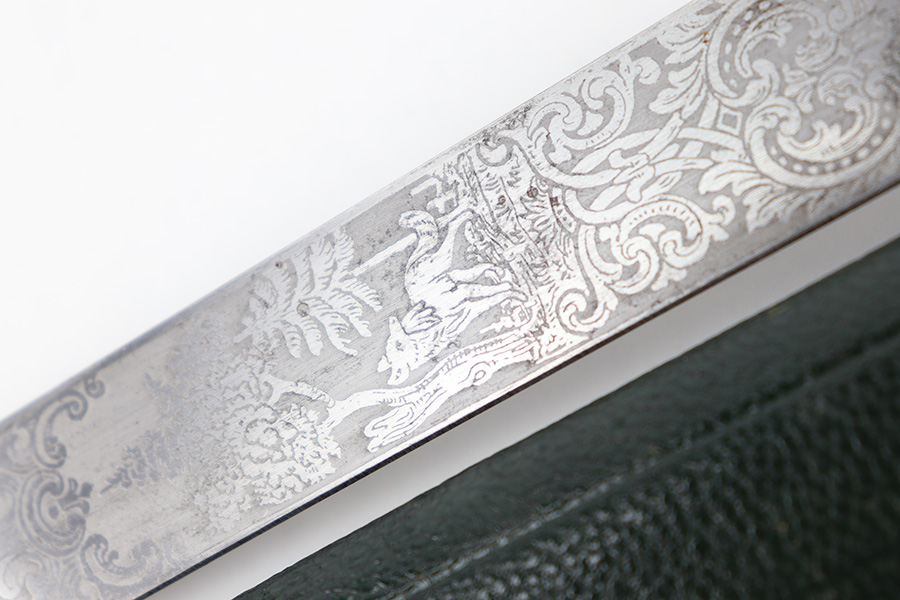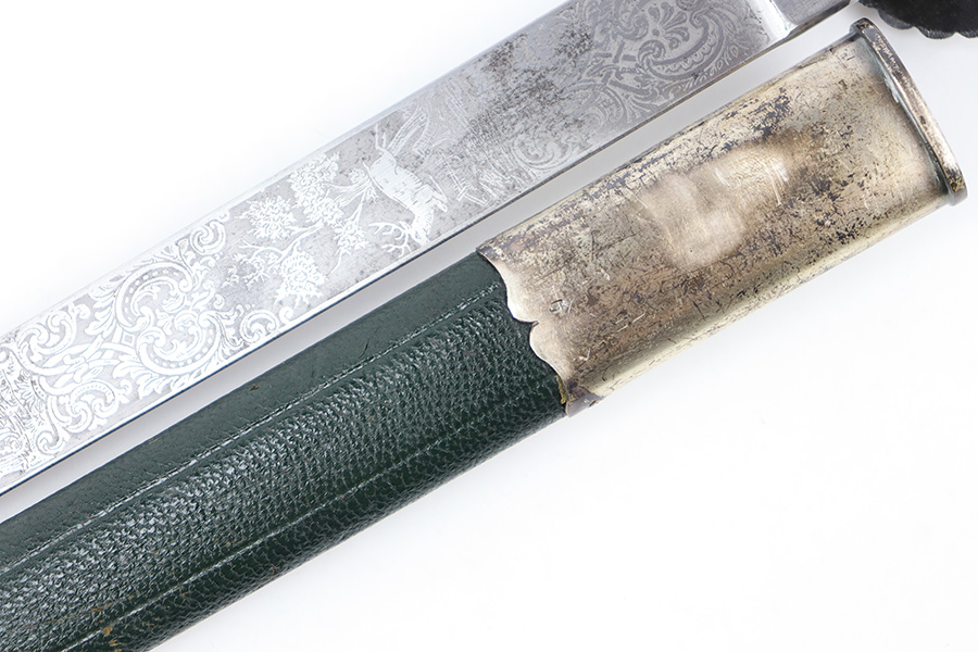 9/5/23 – This is an original WW2 German Hunting Association Dagger with a triple etched blade and original scabbard. The blade is etched on each side with different hunting scenes and animals. Excellent detail and crisp etchings make the scenes clearly visible. There’s some dark patina and surface oxidation mixed within the etchings as well as some wear near the tip of the blade. The spine of the blade has a standard leaf pattern etching, and the edge is unsharpened. Original leather stopper is intact and excellent. The cross guard shows two detailed stag hooves, and traces of the original finish remain. Similar finish traces and surface wear is found on the pommel. The stag handle has no cracks or chips and is pinned with a stag and swastika logo of the WW2 era Hunting Assn. The scabbard has mild surface patina throughout the metal portions, but the original green leather body is excellent. Overall length of the blade (without the scabbard) is 46cm. Blade length is 33cm.
