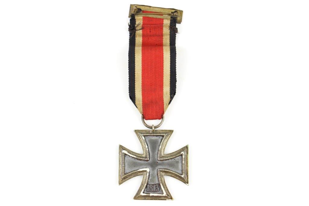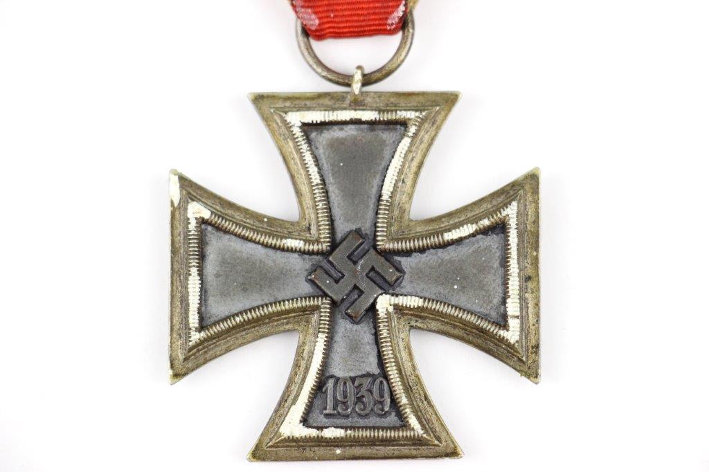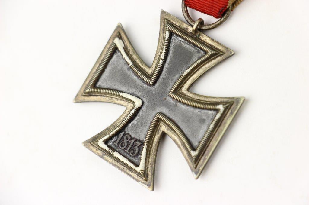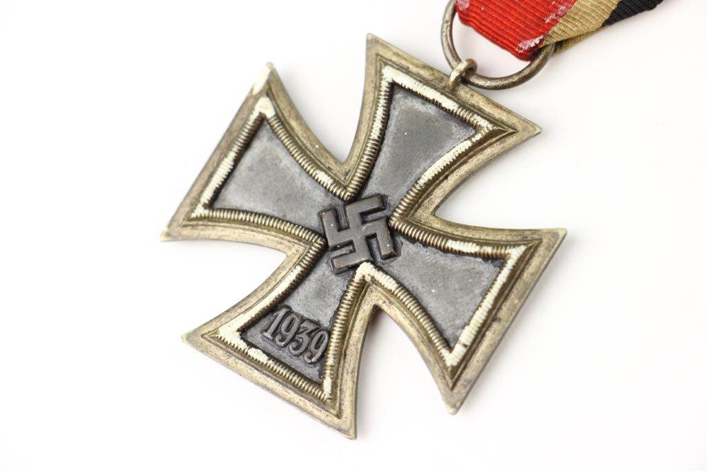 7/7/24 – This is a WW2 original German Iron Cross 2nd Class medal. The medal has a magnetic steel core and shows honest patina and natural wear throughout the central black cross. Some white paint along the edging of the cross as shown. Despite this natural wear, the original ribbon is still attached. The ribbon shows repair / stitching holding it together at the top, affixed just below the brass pin.