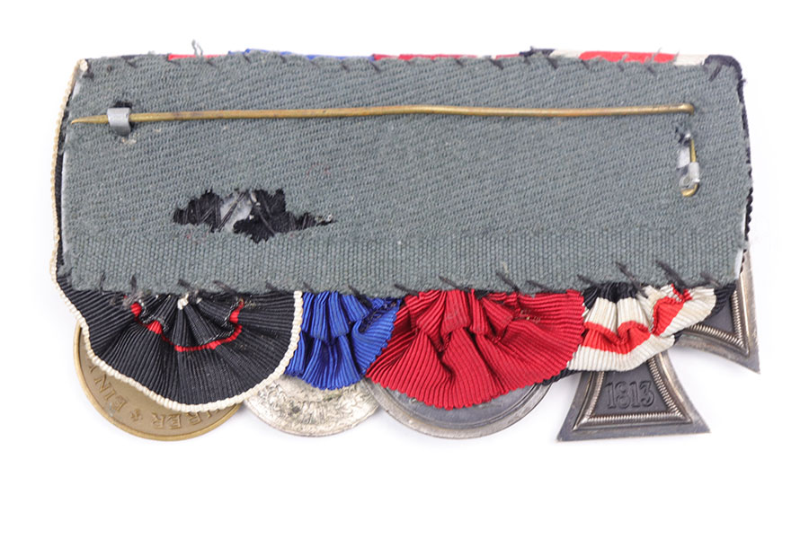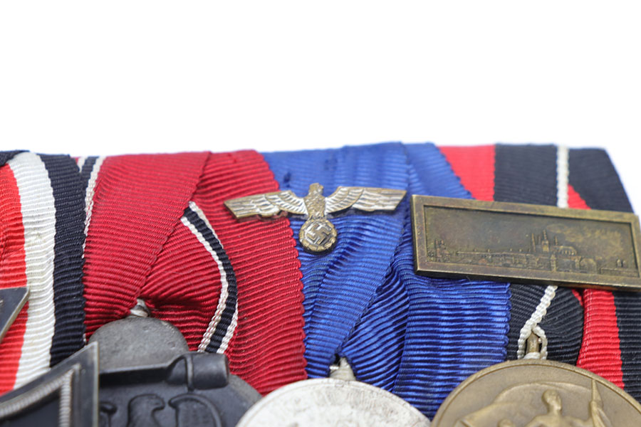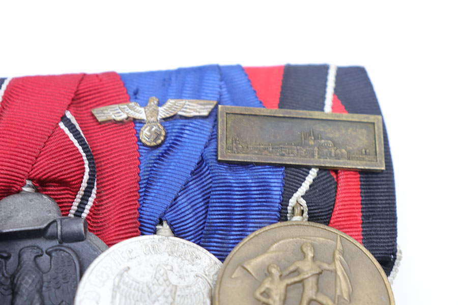 10/28/20 – This is an original grouping of WW2 German medals as part of a uniform bar, as shown in photos. The medals are all original and include their original ribbons. There is an Iron Cross service medal, Russian Front medal, 4 Year Service Medal, and a Sudetenland Medal with Prague Castle Bar. See photos – all are in great condition.