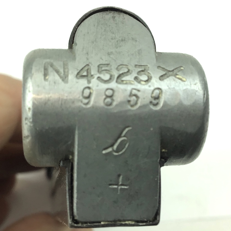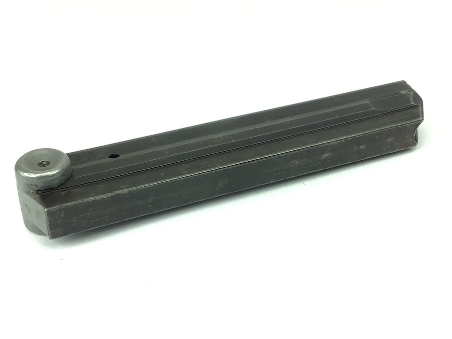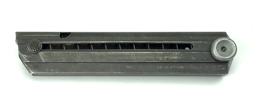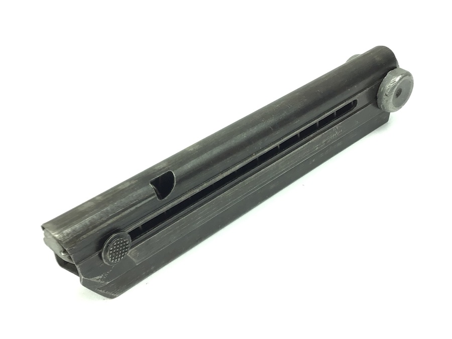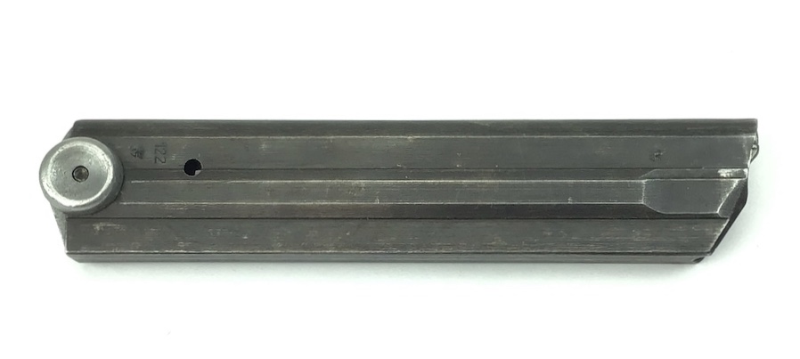 1/13/21 – This is an original WW2 production Navy Luger magazine. The magazine is in excellent condition with a strong spring and no rust or pitting. The base of the magazine is aluminum and serial numbered 9859. There is also a Navy property stamp on the base “N 4523 x”. The magazine tube is blued with 122 code and two Eagle 37 proof stamps. Guaranteed original and authentic.