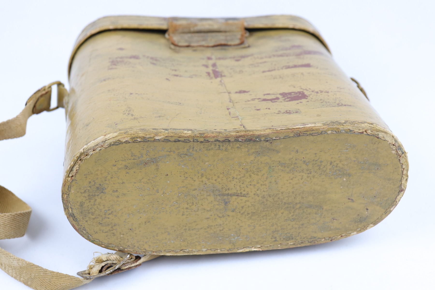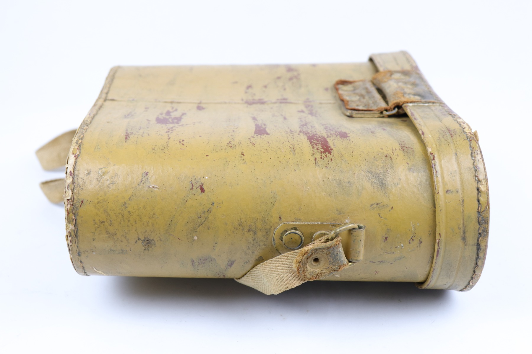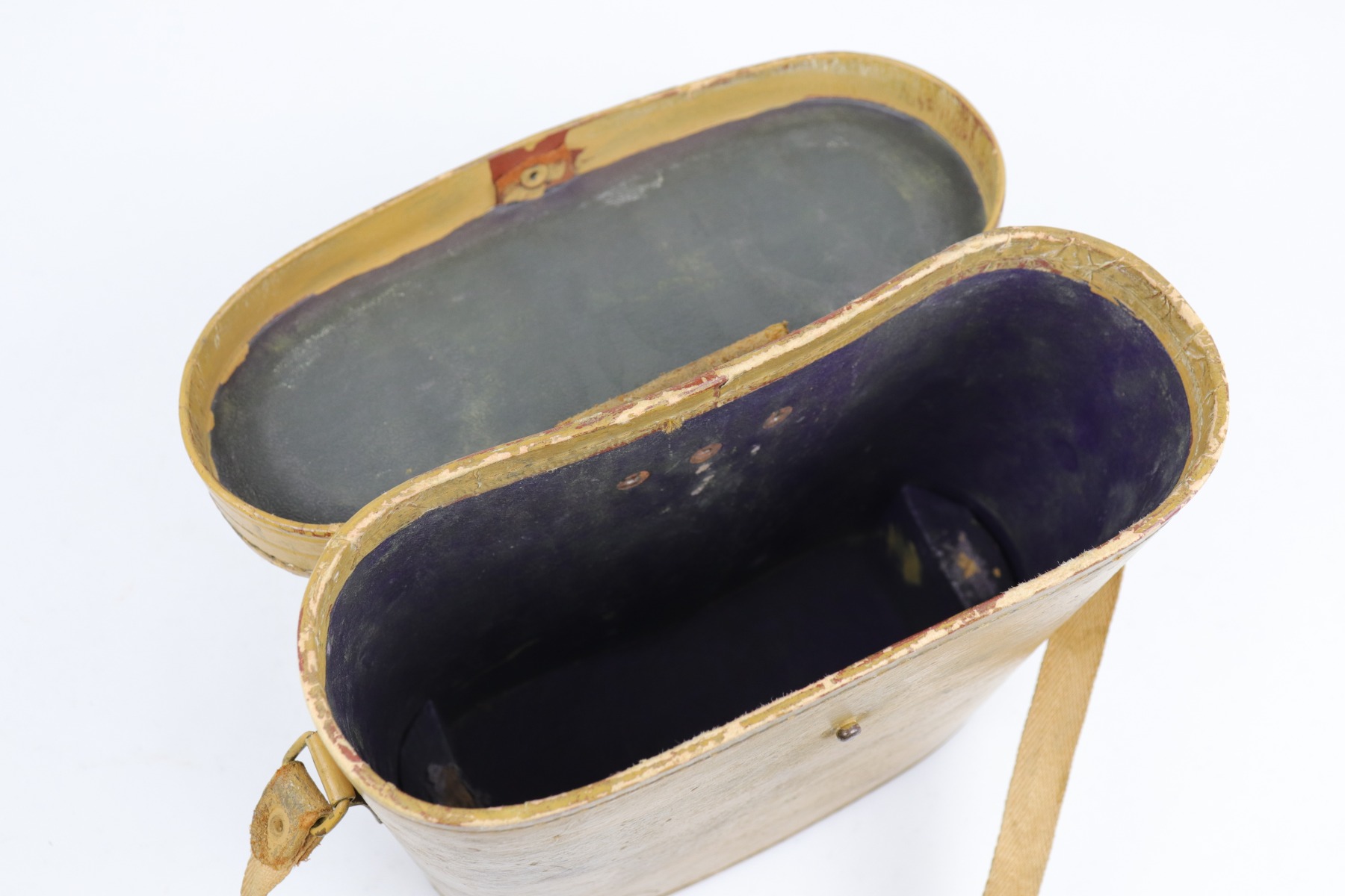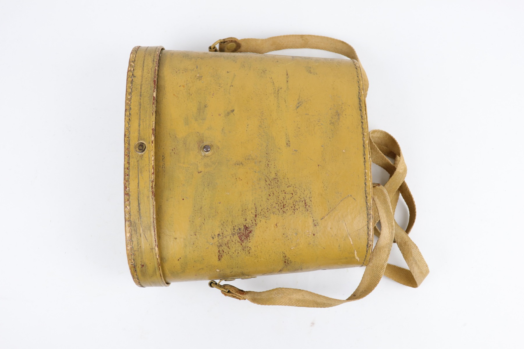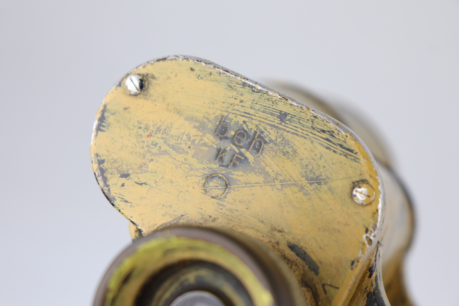 4/28/20 – As featured in out Youtube video (see link below), this is a set of authentic Nazi Afrika Korp Binoculars. They could, however, also been used later in the war on the Western Front of Europe as this color pattern was also used at that time period. A binocular collector said that the paint is original on the glasses and the case. The case has an original tan-colored strap. The original black strap on the glasses is broken but included. The optics are clear but there is some debris in the optics. Meter markings and receptacle markings in tact. The maker is BEH and KF. The power is 10×50.