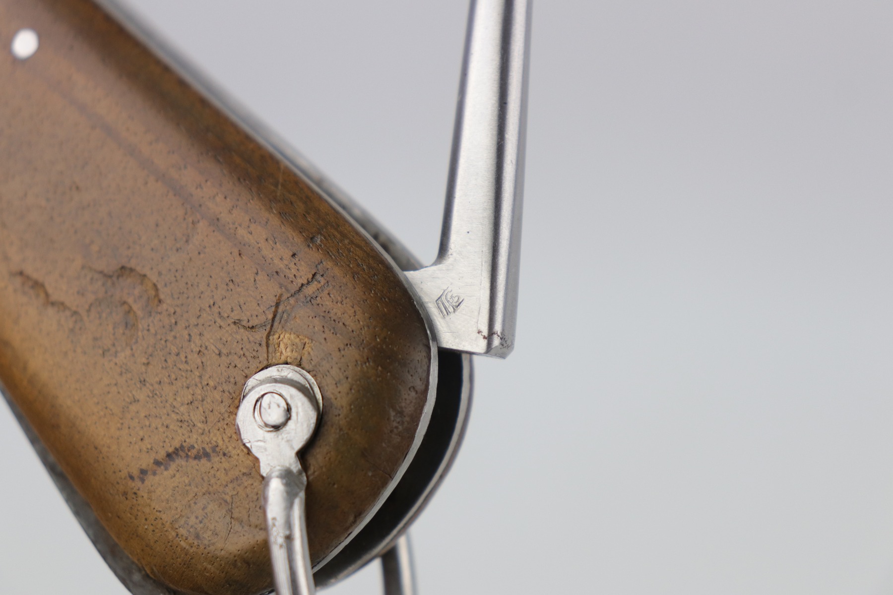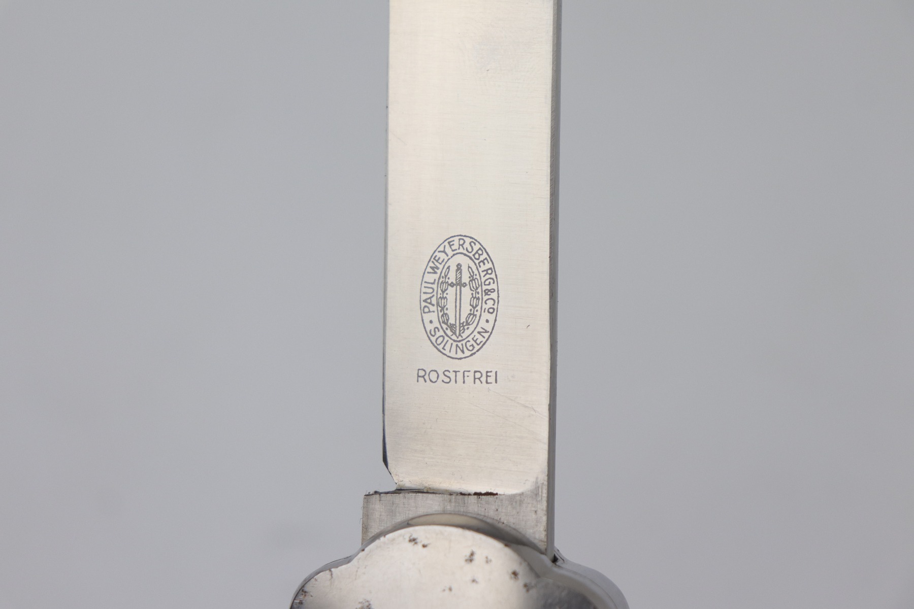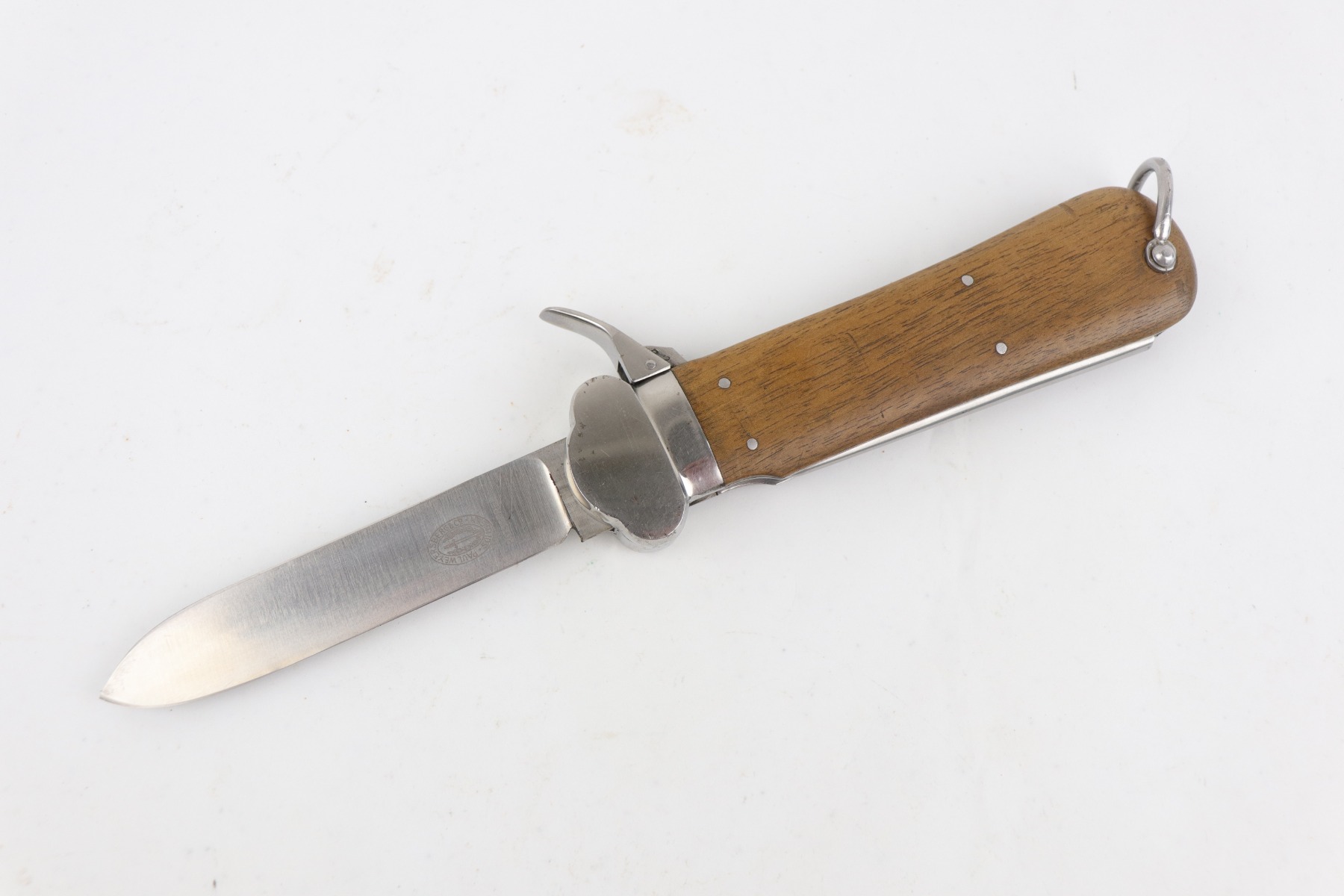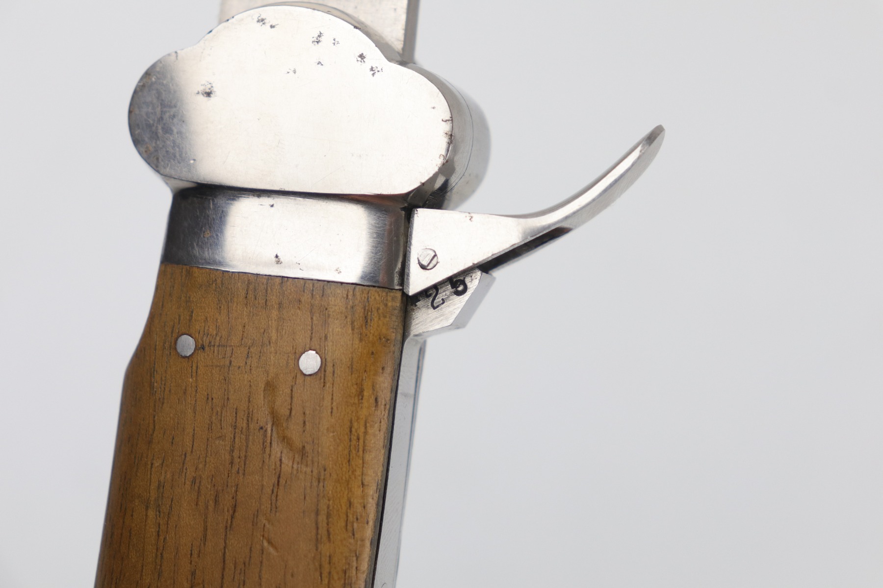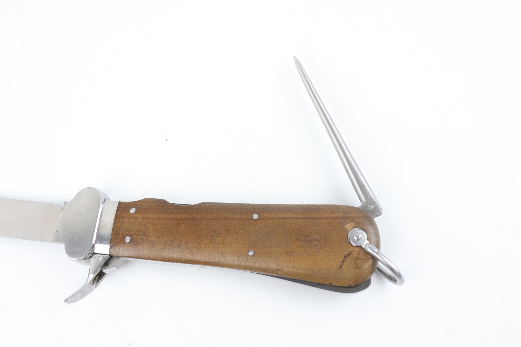 7/28/20 – This item is a near-mint World War Two German Paratrooper gravity knife. The maker’s logo is visible indicating it was manufactured by Paul Weyersberg & Co. Solingen. There is excellent cross-graining on the blade as well as the German word “Rostfrei”- literally translated as “rust free”, although the more practical translation is “stainless steel”. Parts show assembly number 25. There is also a flip-open spike tool engraved with a German eagle acceptance mark.