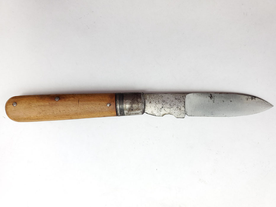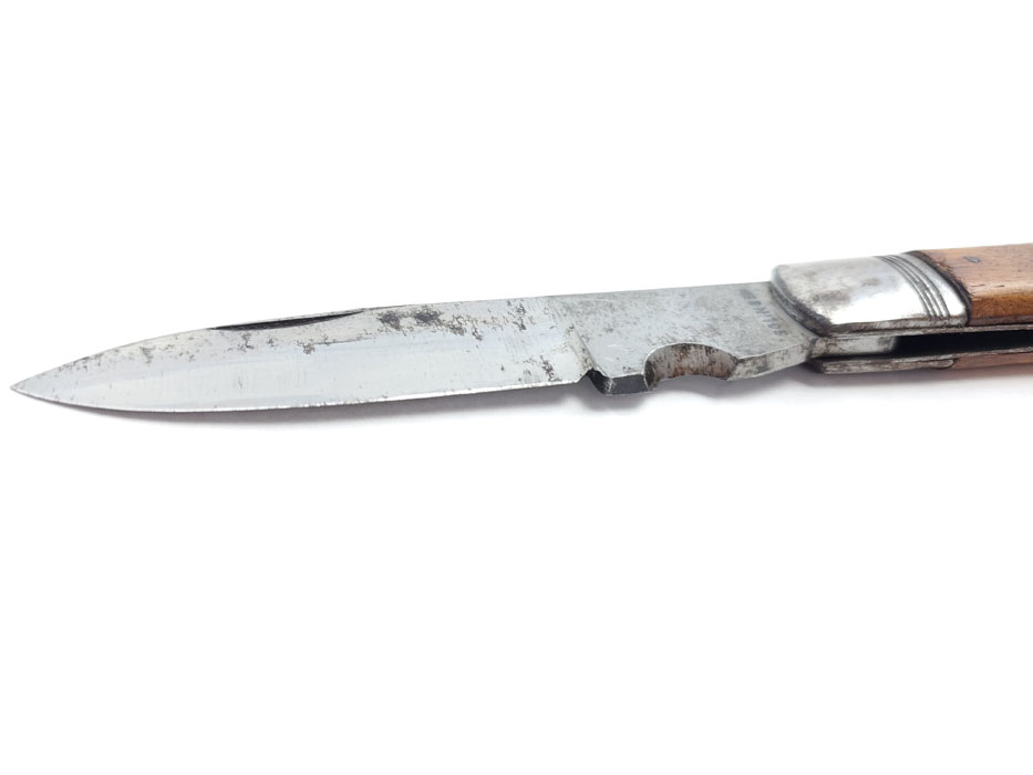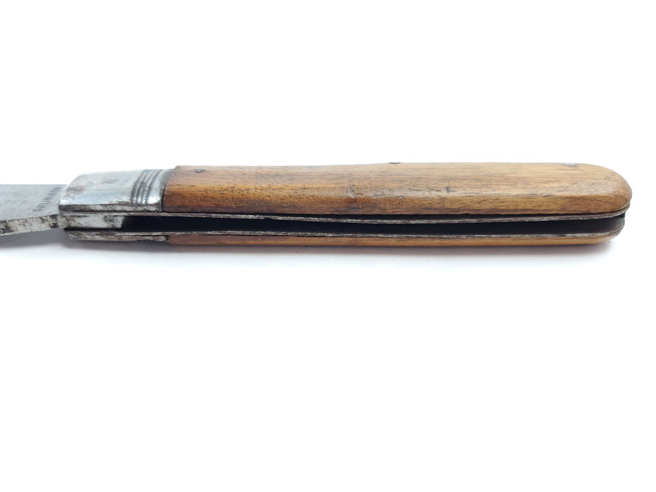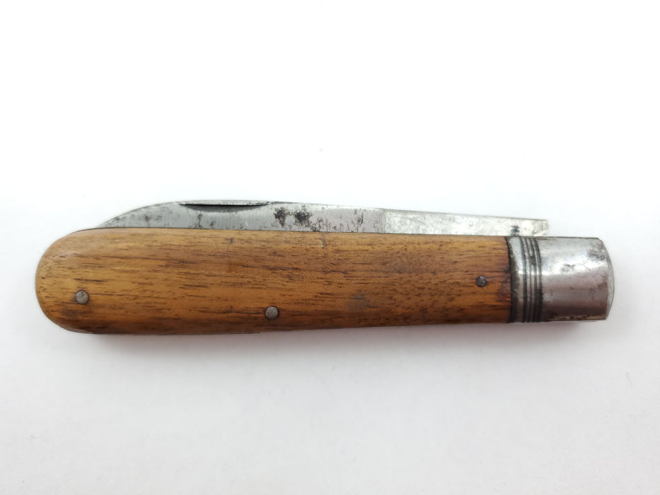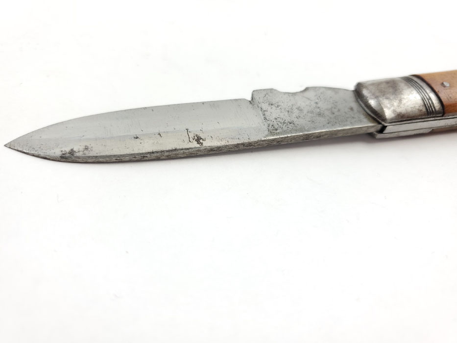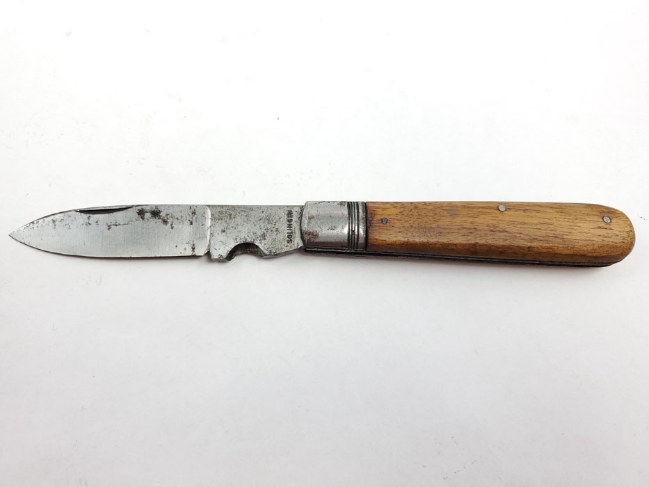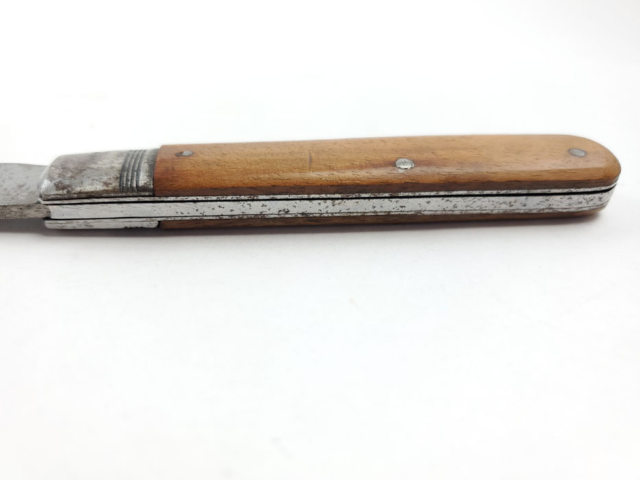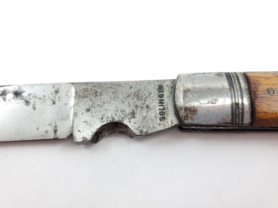 3/31/20 – We believe this is a WW2 era German pocket knife. The blade shows aging and is stamped “SOLINGEN”, which is commonly found on WW2 dress daggers, comparable to our word “patent”. There are no other markings. The action is VERY tight on this knife, and takes some effort to open, but still locks and functions well along the hinge. The wood handle has no cracks or chips and appears all original. Blade is about 2.5 inches. 4.25 inches when closed.