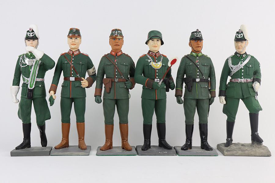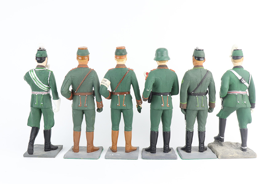 6/11/21 – This lot of 9″ figurines feature variations of WW2 Nazi police. We are uncertain of where or when they were manufactured. Some of the figures have a chip or broken pieces but most are in great shape.