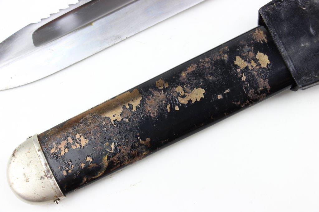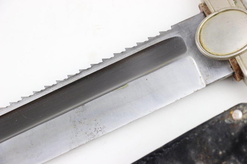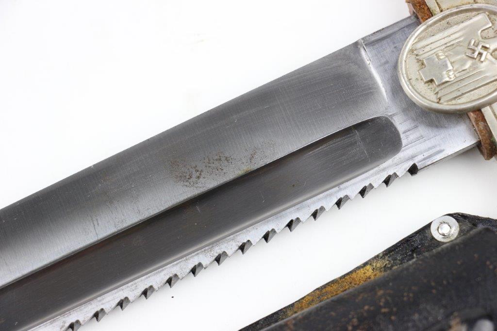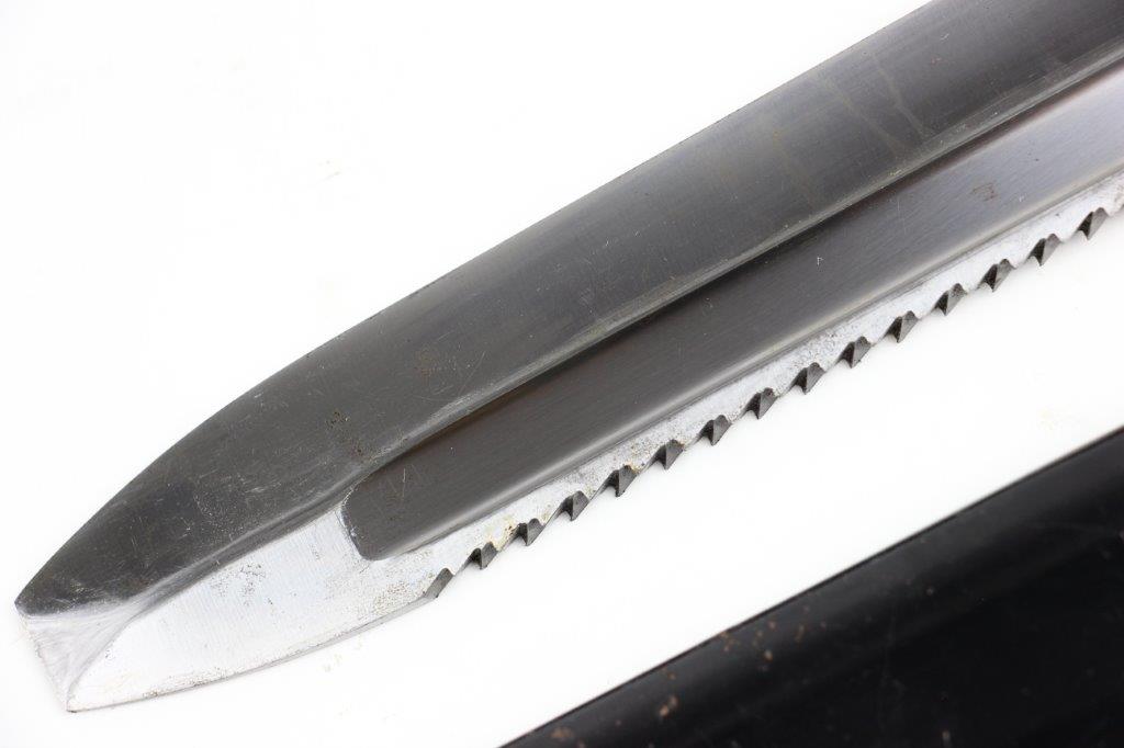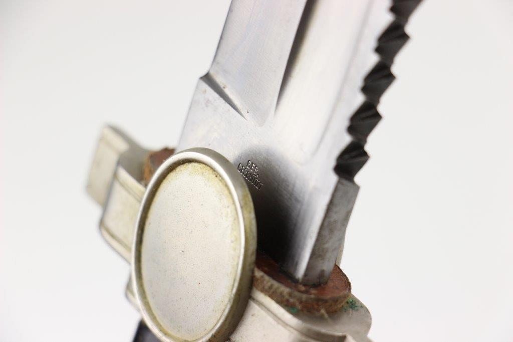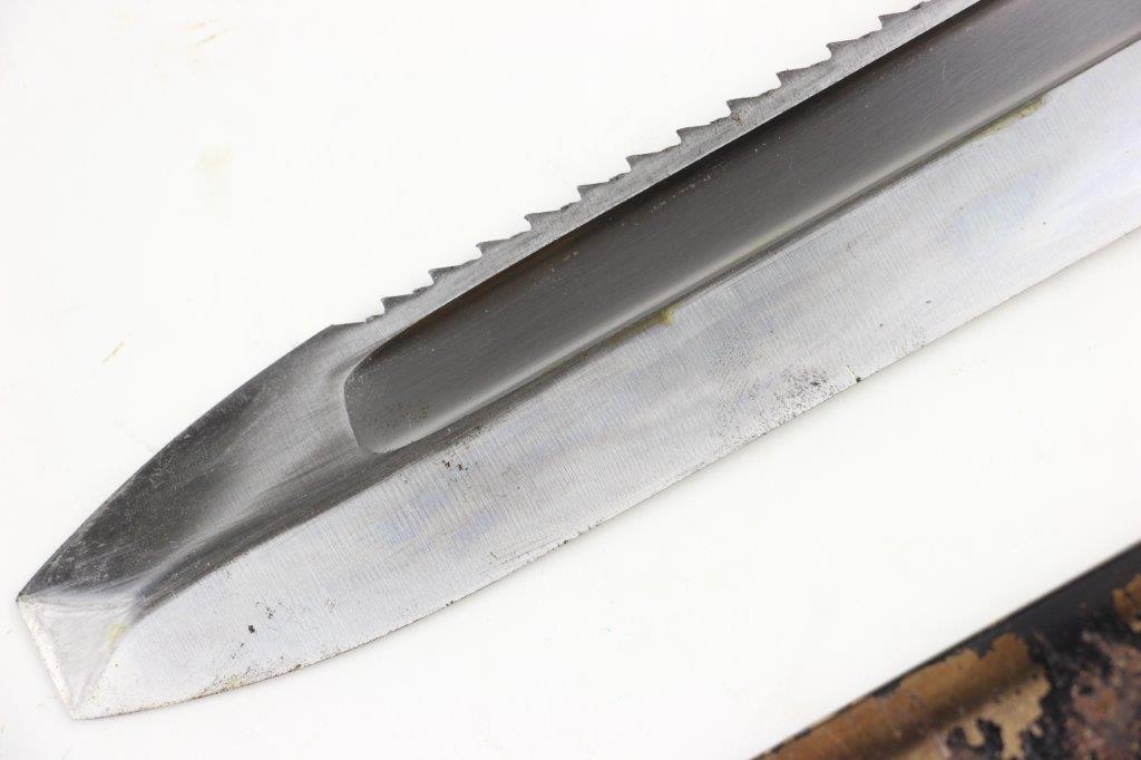 5/28/24 – This is a WW2 German Red Cross Medical Hewer. The dagger features a bright blade that’s in excellent condition. Also comes with an original scabbard and leather frog. The blade has some light scabbard rub wear throughout as well as a few small areas of speckling patina and light surface oxidation. Clean, unsharpened edge with a sawback style spine. The base of the blade is marked “Ges. Geschutzt” on the reverse. NO other maker markings or stamps. The original leather stopper is still intact and in great shape. The handle is original with a diamond pattern on the front and smooth “slab side” on the back panel. Natural patina throughout the hand guard and pommel. Great detail on the Red Cross Eagle logo. The scabbard has paint chipping and dark patina, especially on the backside as shown in photos. The paint is still flaking slightly in some areas so handle with care. The leather frog is excellent and unmarked.