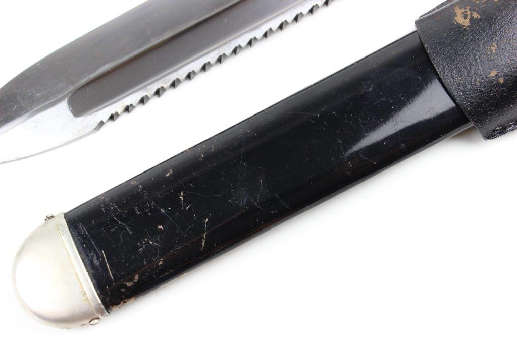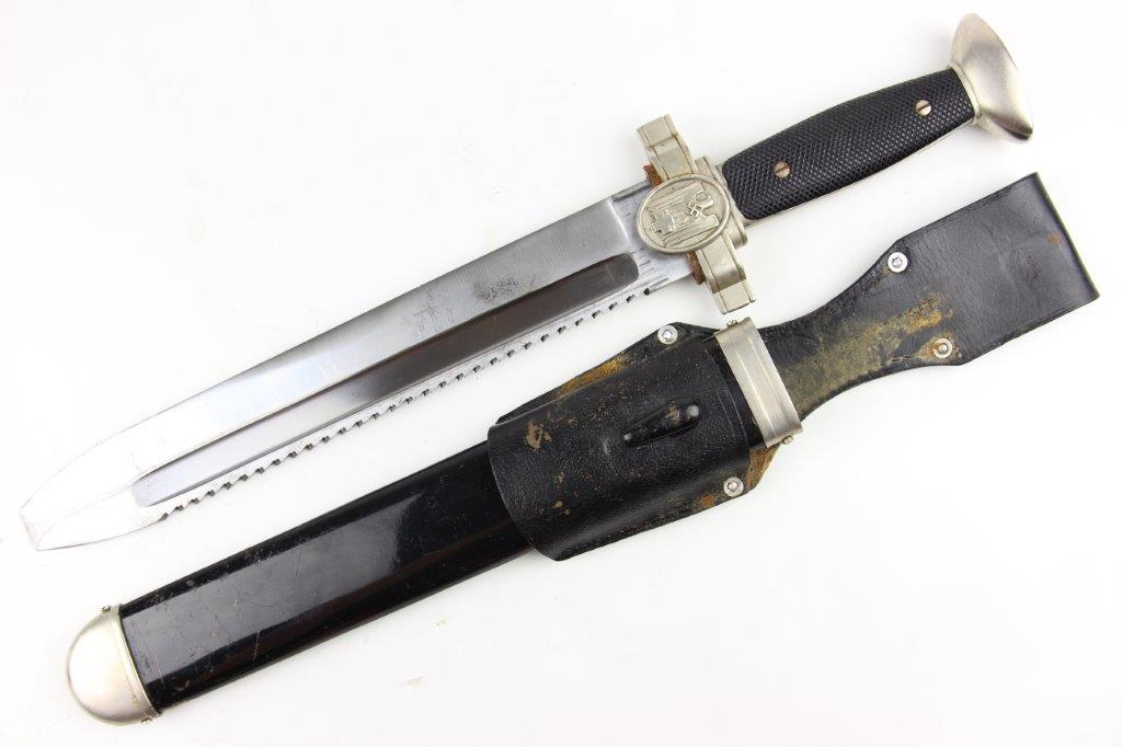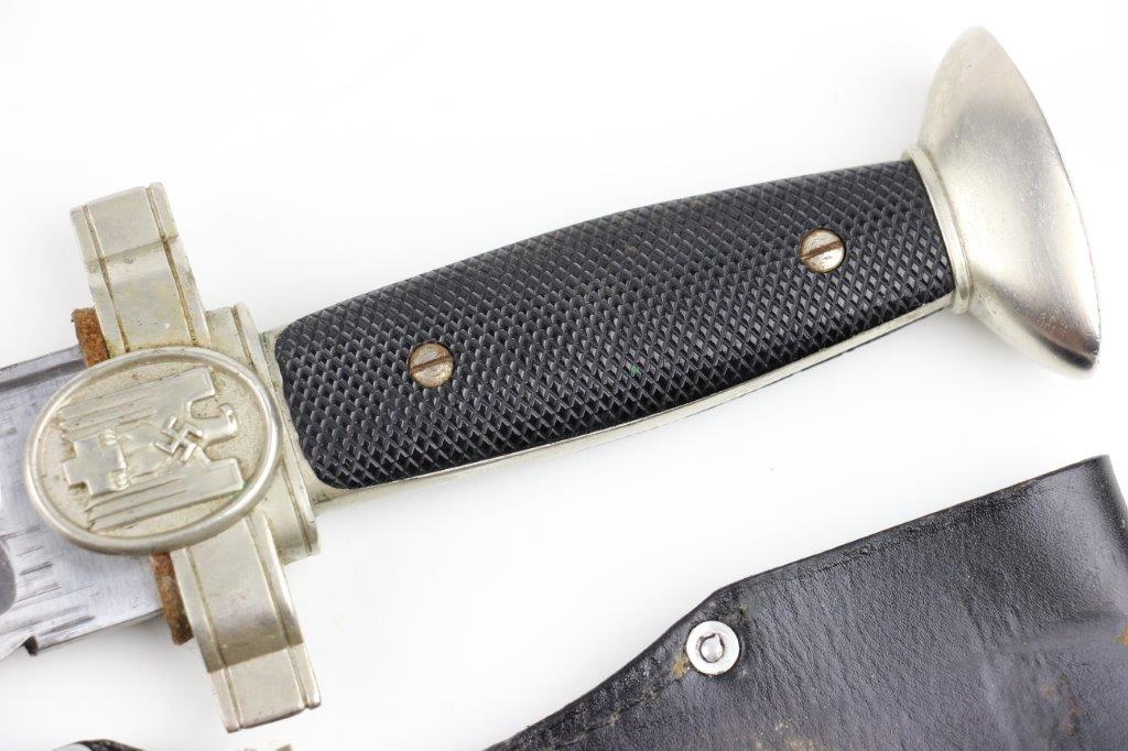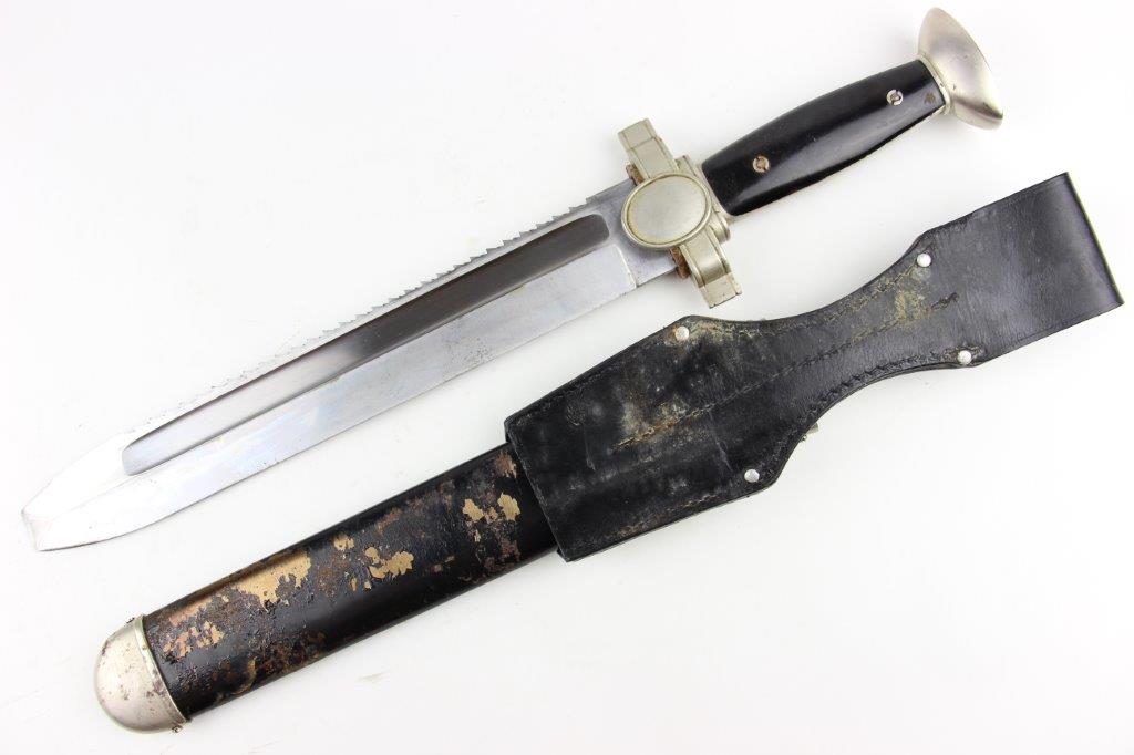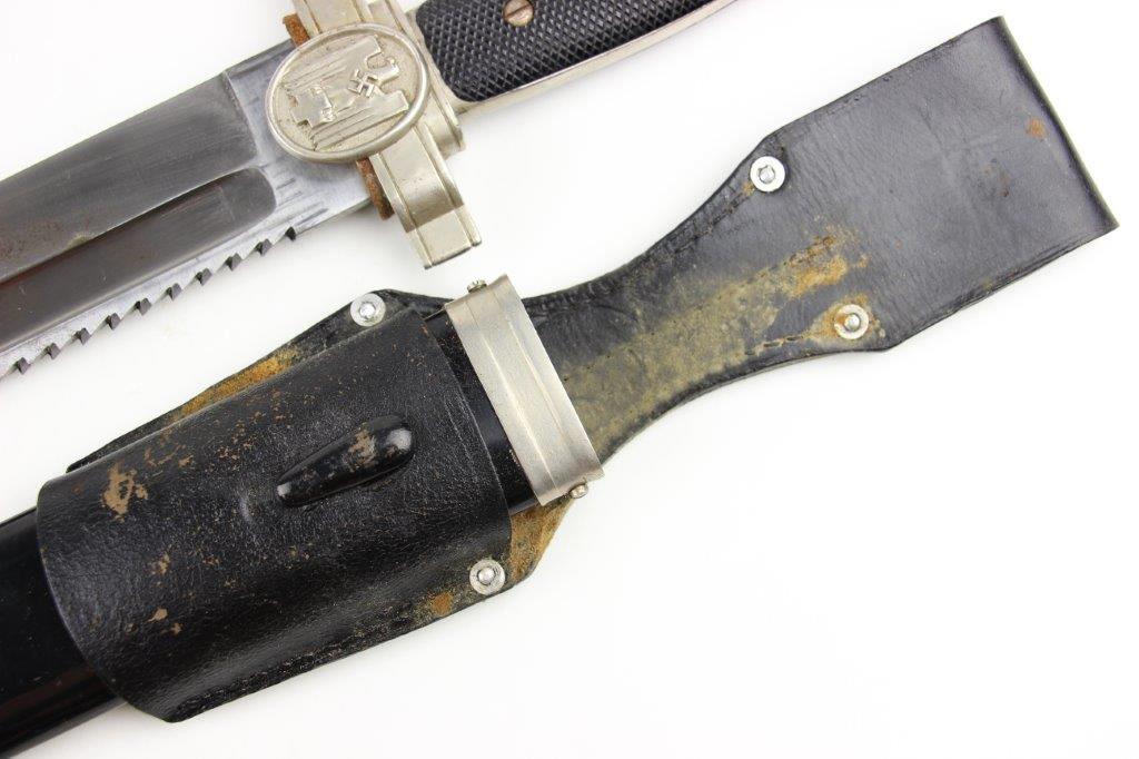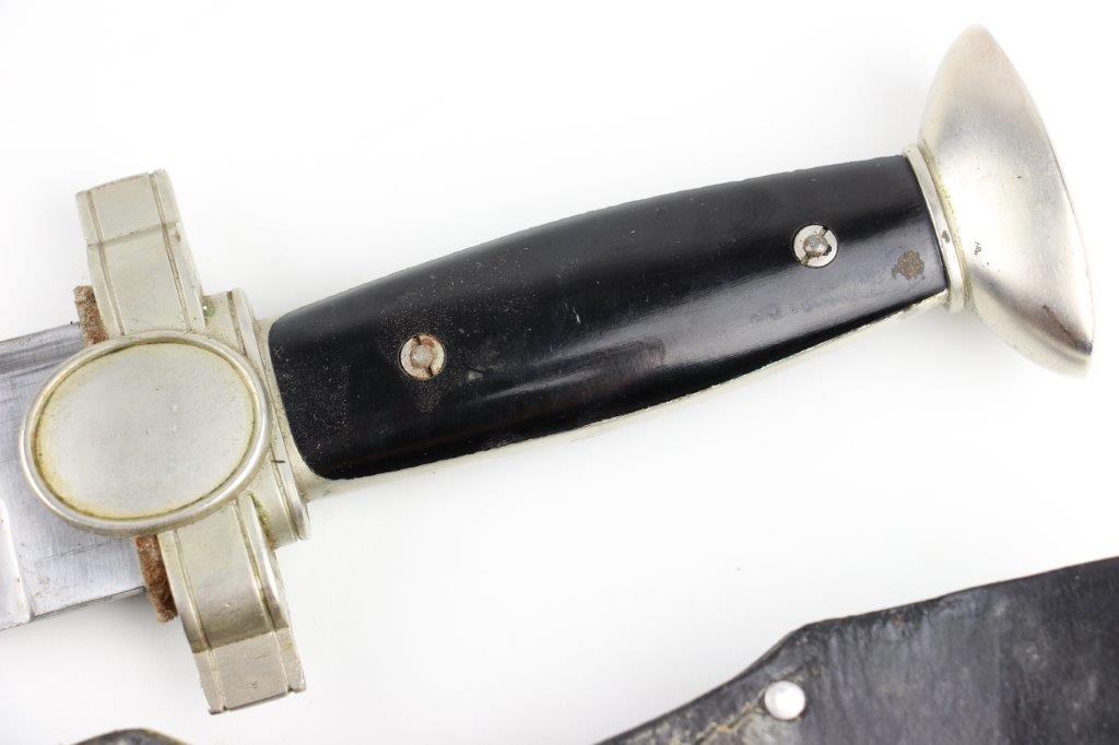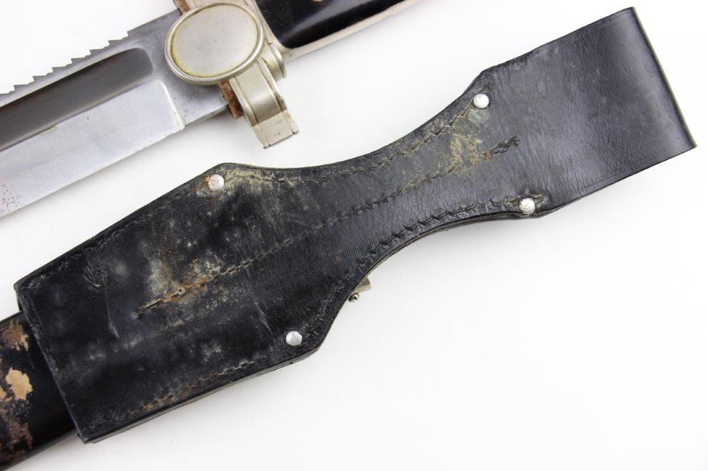 5/28/24 – This is a WW2 German Red Cross Medical Hewer. The dagger features a bright blade that’s in excellent condition. Also comes with an original scabbard and leather frog. The blade has some light scabbard rub wear throughout as well as a few small areas of speckling patina and light surface oxidation. Clean, unsharpened edge with a sawback style spine. The base of the blade is marked “Ges. Geschutzt” on the reverse. NO other maker markings or stamps. The original leather stopper is still intact and in great shape. The handle is original with a diamond pattern on the front and smooth “slab side” on the back panel. Natural patina throughout the hand guard and pommel. Great detail on the Red Cross Eagle logo. The scabbard has paint chipping and dark patina, especially on the backside as shown in photos. The paint is still flaking slightly in some areas so handle with care. The leather frog is excellent and unmarked.