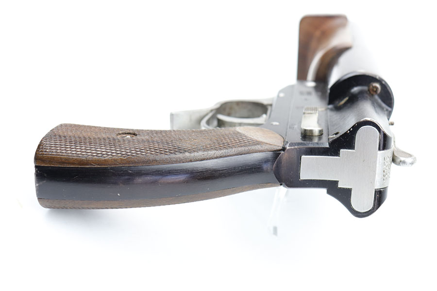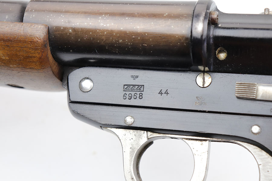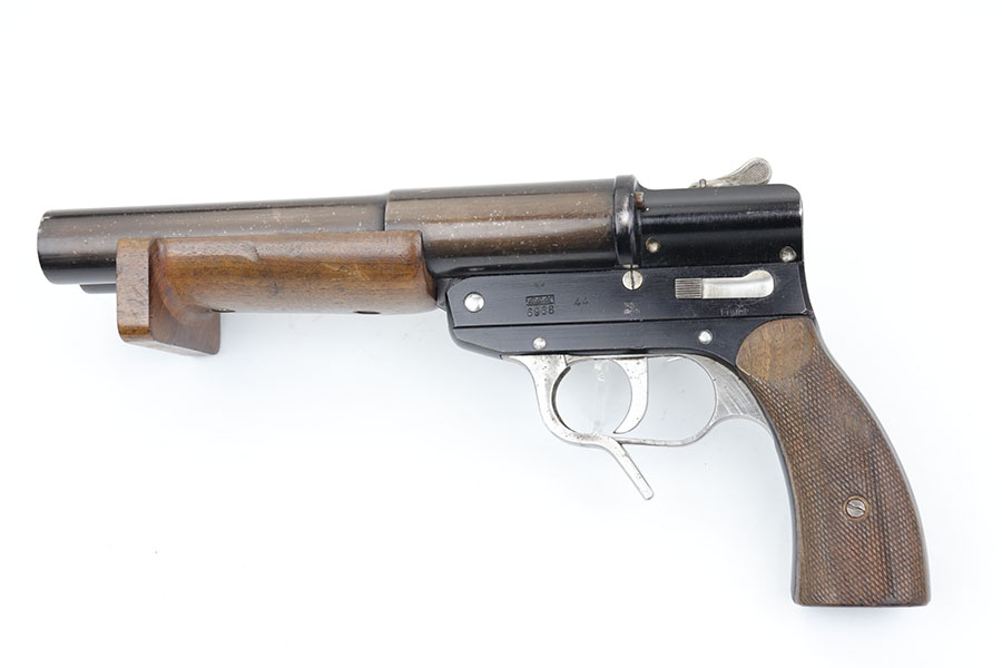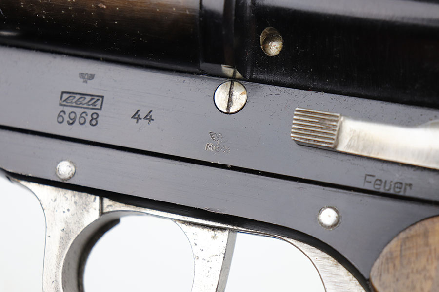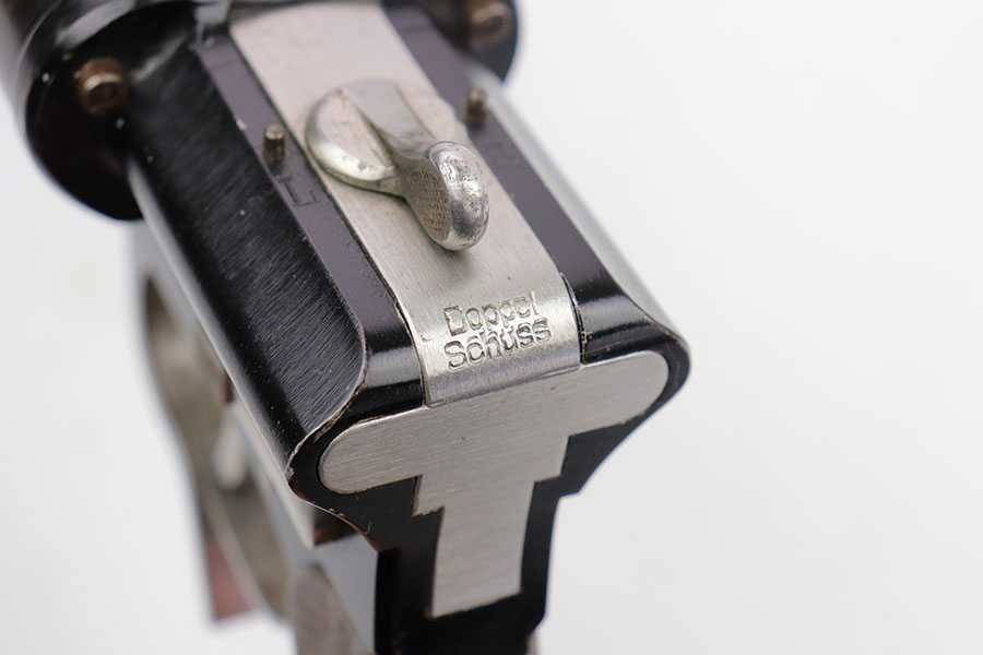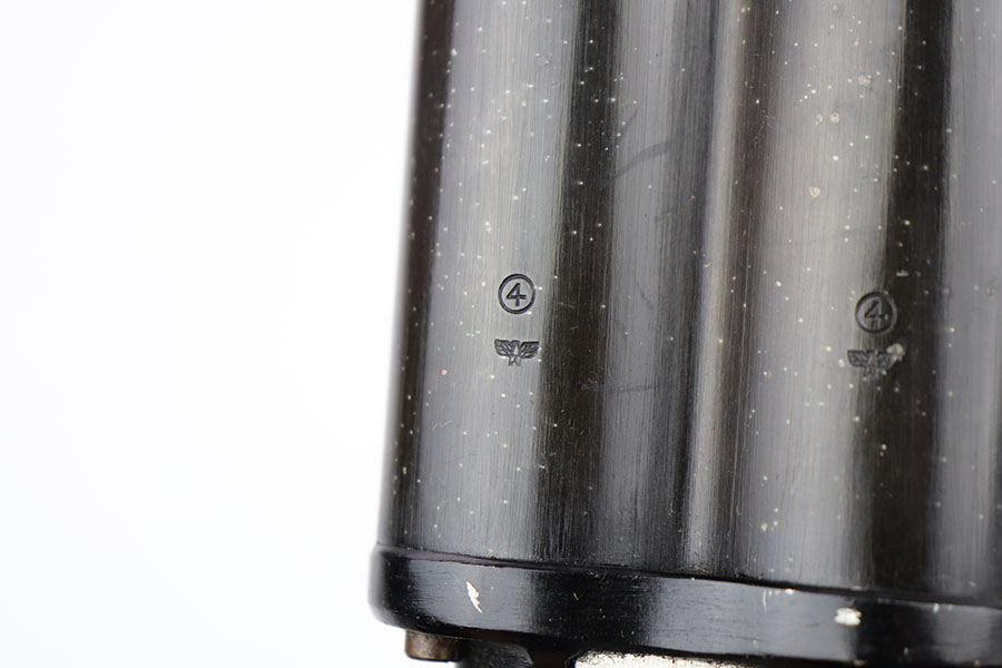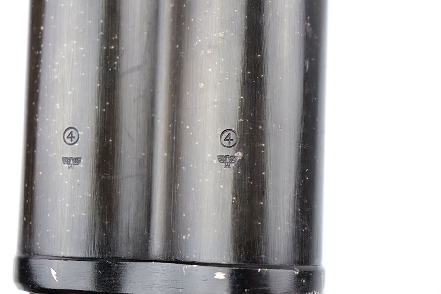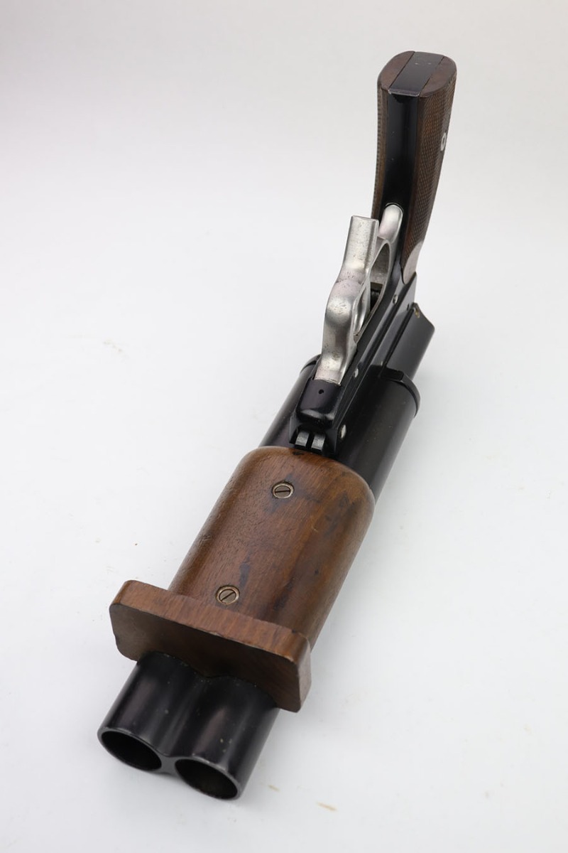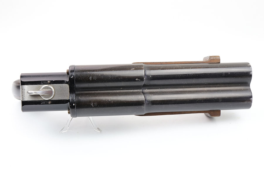 04/28/20 – This is an original WW2 U-Boat Kriegsmarine scarce model SLD – Signal und Leucht Doppelschussmodelce (literally ”signal & light double shot model). The pistol has a pair of 9 1/4” barrels and a 4 3/4” wooden fore-end to give the user a more secure grip when the pistol was fired. This double barrel flare pistol was manufactured in 4 bore and accepted 27mm flares with a variety of signaling and lighting purposes. The left side of frame is waffenamt and has the “eeu” makers mark. It also has an “Eagle M” marking. Both barrels have a “4” in a circle and are waffentamt. This particular example is in excellent condition and is fully functional. The gun has retained most of its original finish. There is some thinning in the finish along the sides of the barrels. There are also very small white dots throughout the barrels. We assume this is a reaction of the aluminum with the salt air. There are small dots of discoloration on the trigger/trigger guard. The wood parts are excellent – just a few light handling marks. The bore is excellent. There is just some very minor freckling near the front on the right barrel.