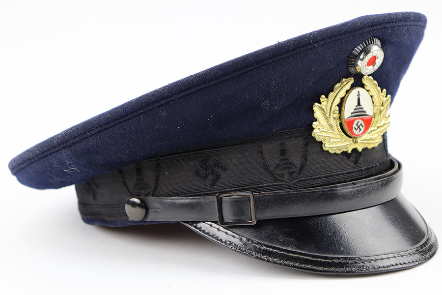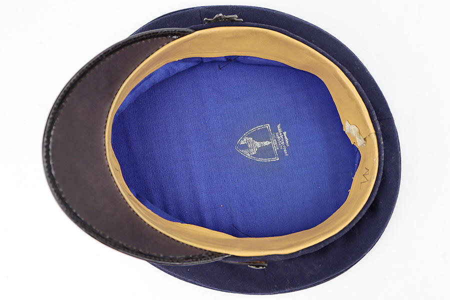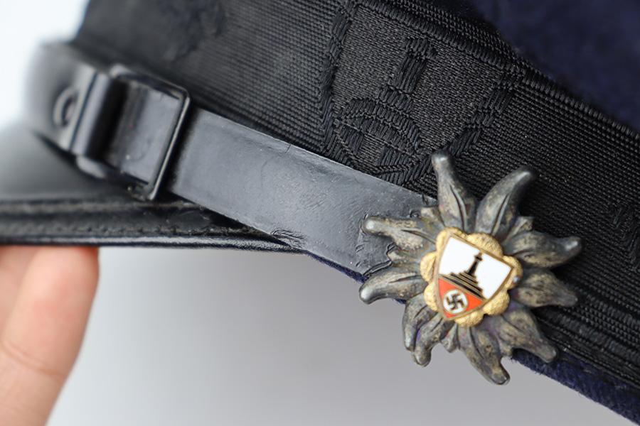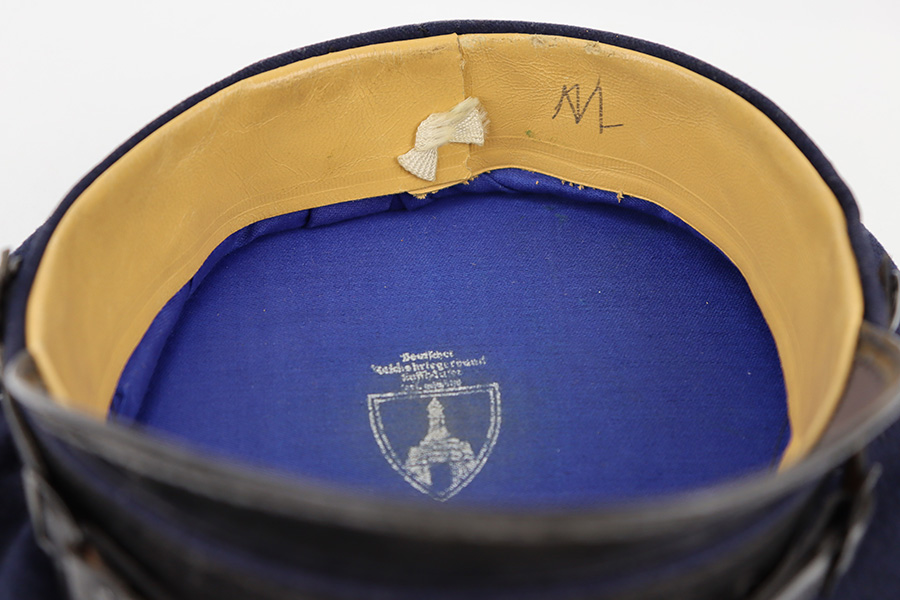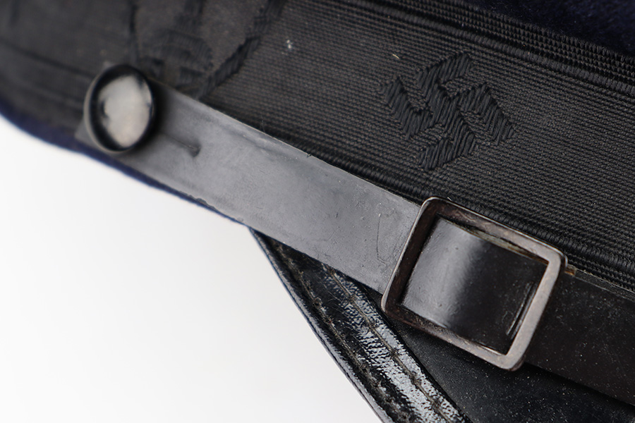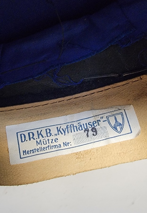 9/7/23 – This is an original WW2 German Veteran’s Association Visor Cap. Also known as the D.R.K.B. “Kyffhauser”. The visor cap is in excellent condition with very nice dark blue wool exterior crown, and nice black exterior headband. The exterior has some very mild surface wear but no holes or notable issues. The left side of the chin strap is attached with an eidelweiss pin, as shown. The chin strap and visor is black lacquered leather and in great condition. Clean interior headband, and lighter colored blue cloth material. The maker marking is still present and visible on the interior crown. Inside the leather headband is a Veteran’s Association tag, as shown. Size marked “79”.