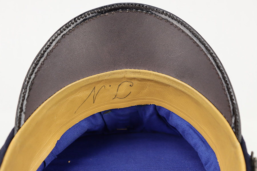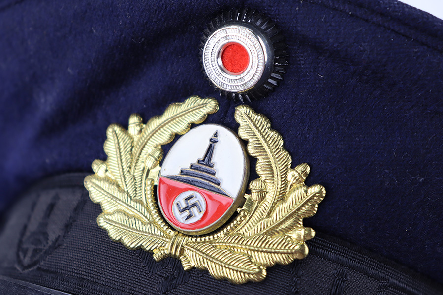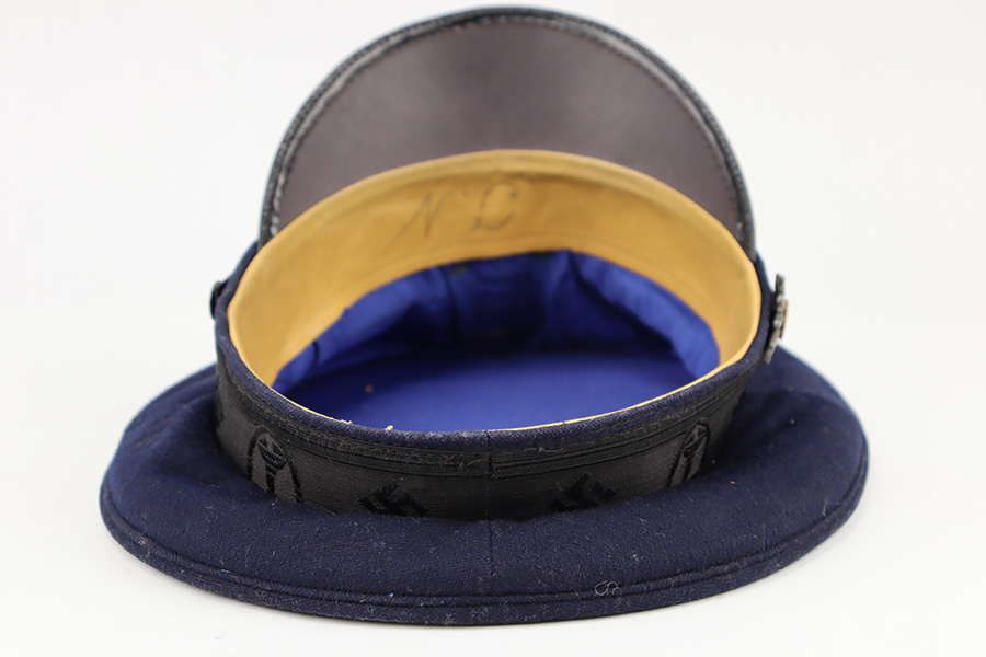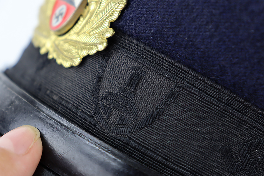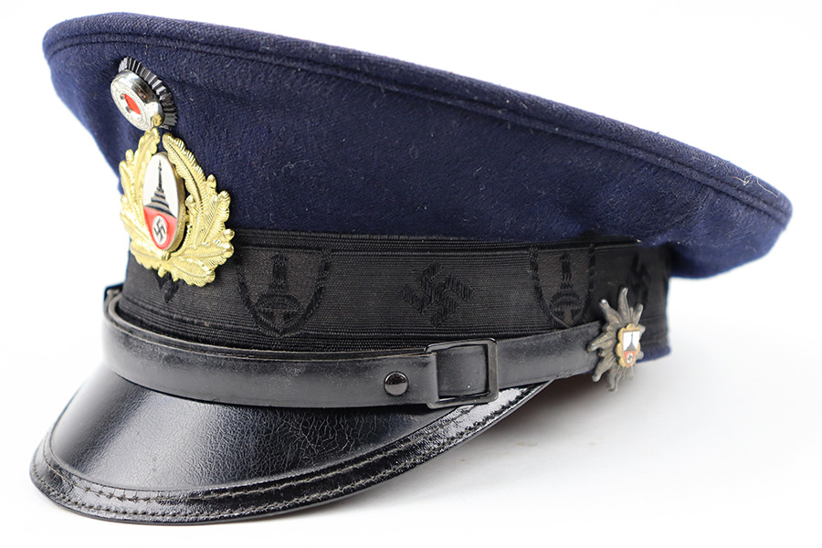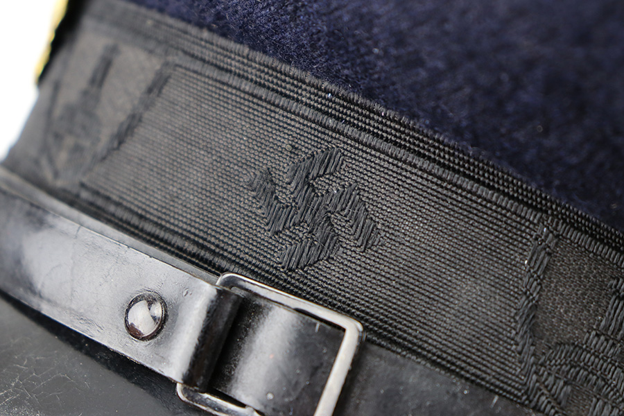 9/7/23 – This is an original WW2 German Veteran’s Association Visor Cap. Also known as the D.R.K.B. “Kyffhauser”. The visor cap is in excellent condition with very nice dark blue wool exterior crown, and nice black exterior headband. The exterior has some very mild surface wear but no holes or notable issues. The left side of the chin strap is attached with an eidelweiss pin, as shown. The chin strap and visor is black lacquered leather and in great condition. Clean interior headband, and lighter colored blue cloth material. The maker marking is still present and visible on the interior crown. Inside the leather headband is a Veteran’s Association tag, as shown. Size marked “79”.