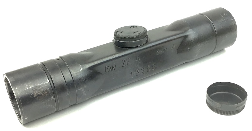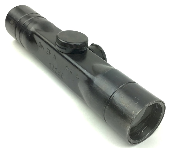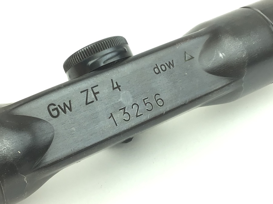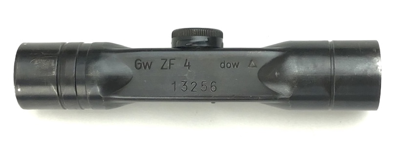 4/7/21 – This is an original ZF 4 scope for a WW2 era German rifle (K98, G43, K43). The scope is marked “Gw ZF 4 dow” with “13256” underneath. There’s also a triangle next to the “dow” stamp, which is an indication for military use. The scope has some light patina and minor edge wear but is in great overall condition. The optics are clear, but there is some very minor freckling. Overall a great piece.