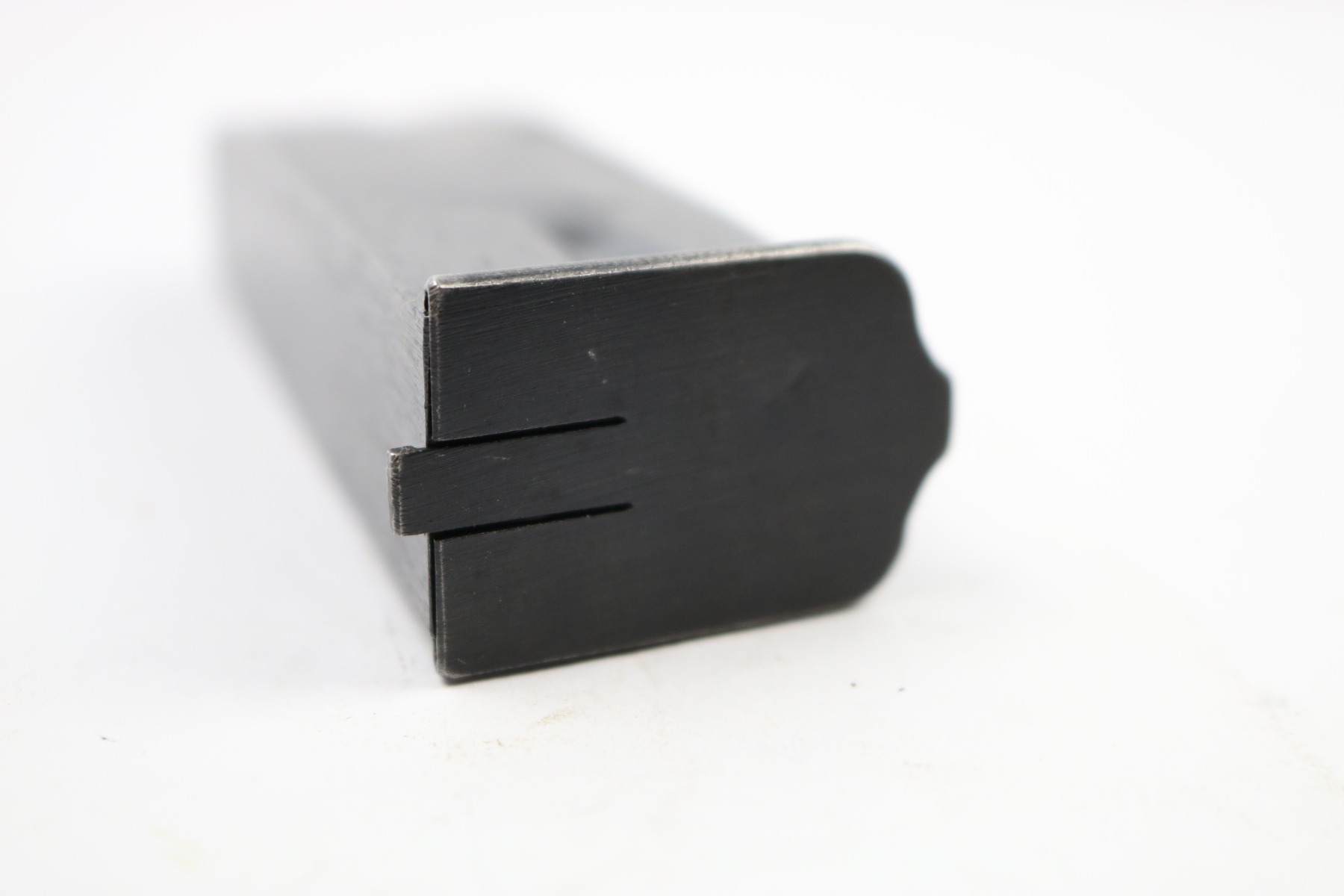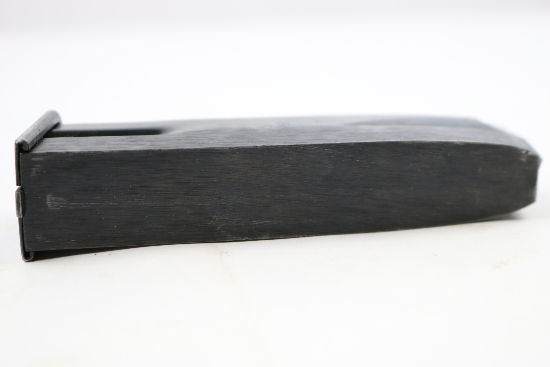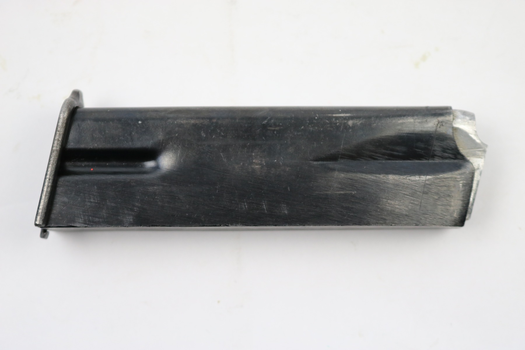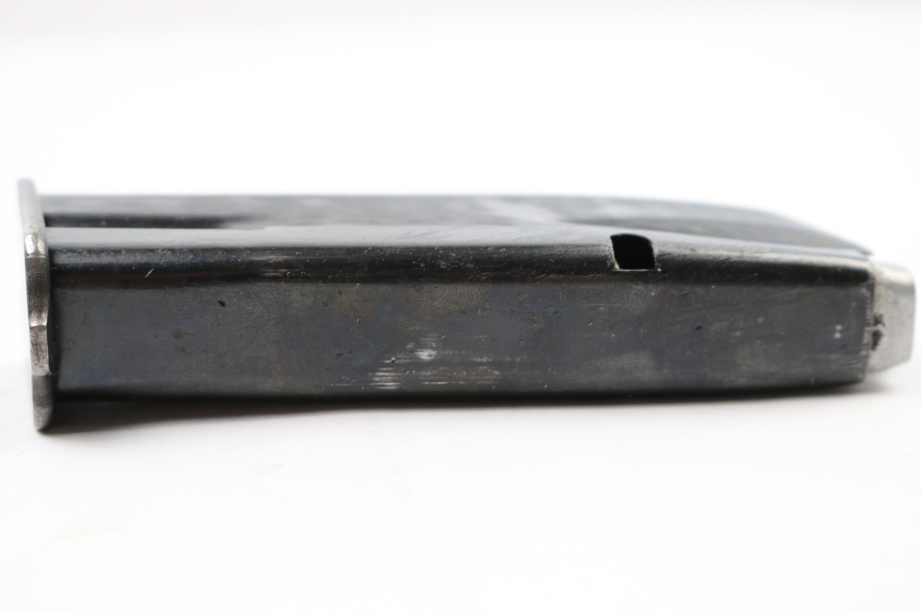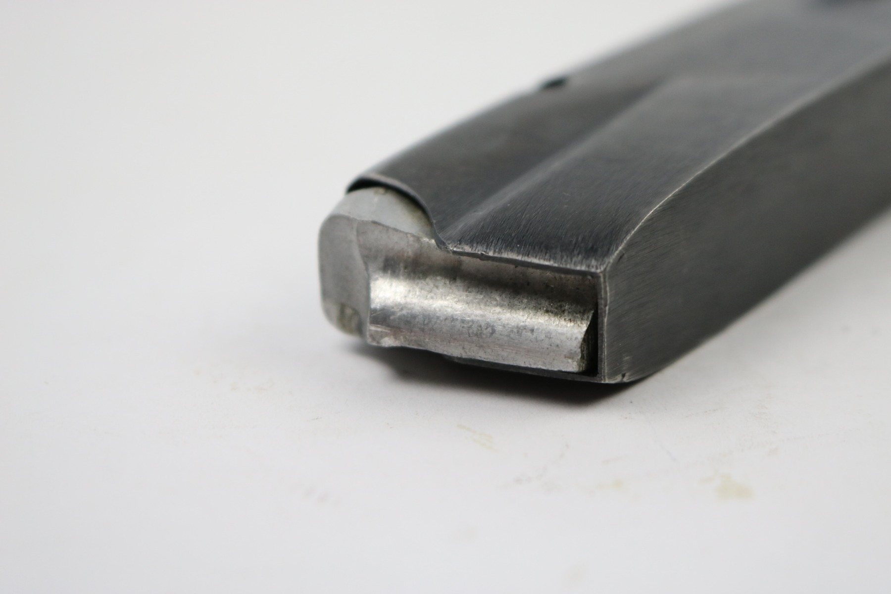 6/21/18 – This is an excellent Hi Power magazine from the 1940s. THe magazine has a blued  finish with minimal wear. Strong fully functional spring. No stamps or markings. 9mm with 14 round capacity – please don’t buy if you can’t own in your state.