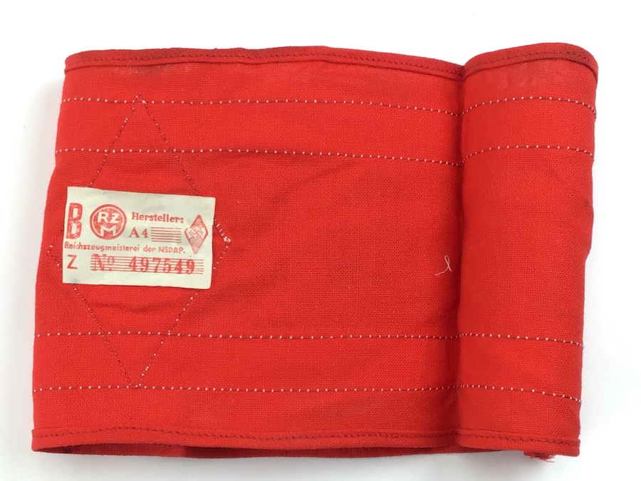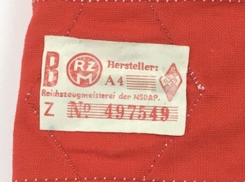 5/7/21 – Original and minty condition. Hitler Youth Armband. Colors are vibrant and stitching is secure and intact. RZM maker label attached to the internal with clear ink stamping. One edge of the label is not attached to the fabric, but it is still secure. Minor staining on top edge but hardly noticeable.