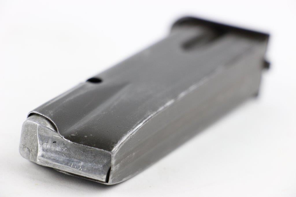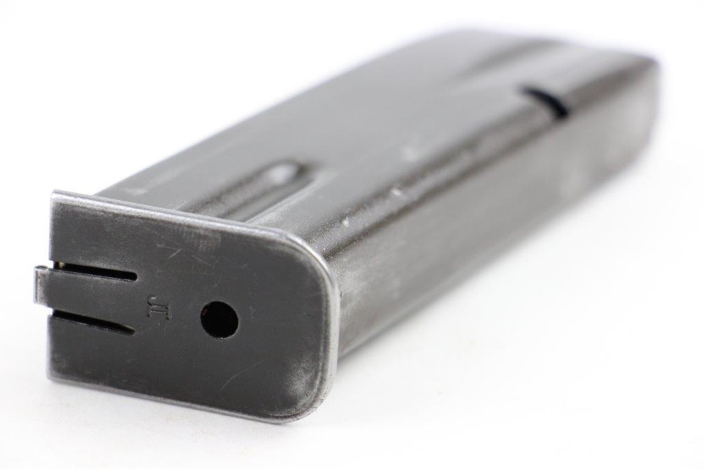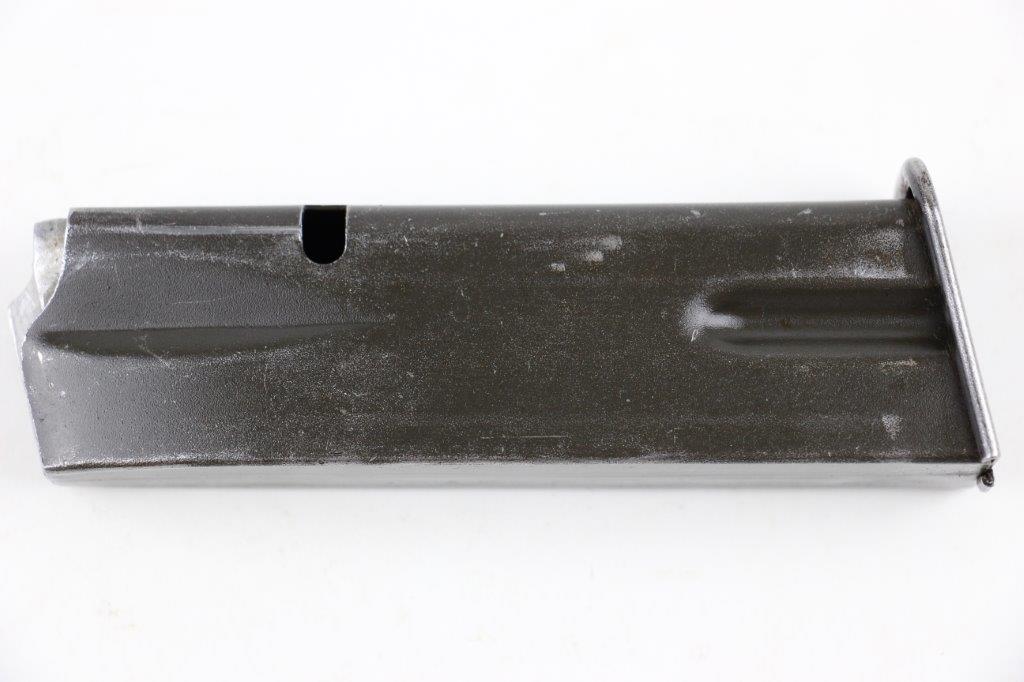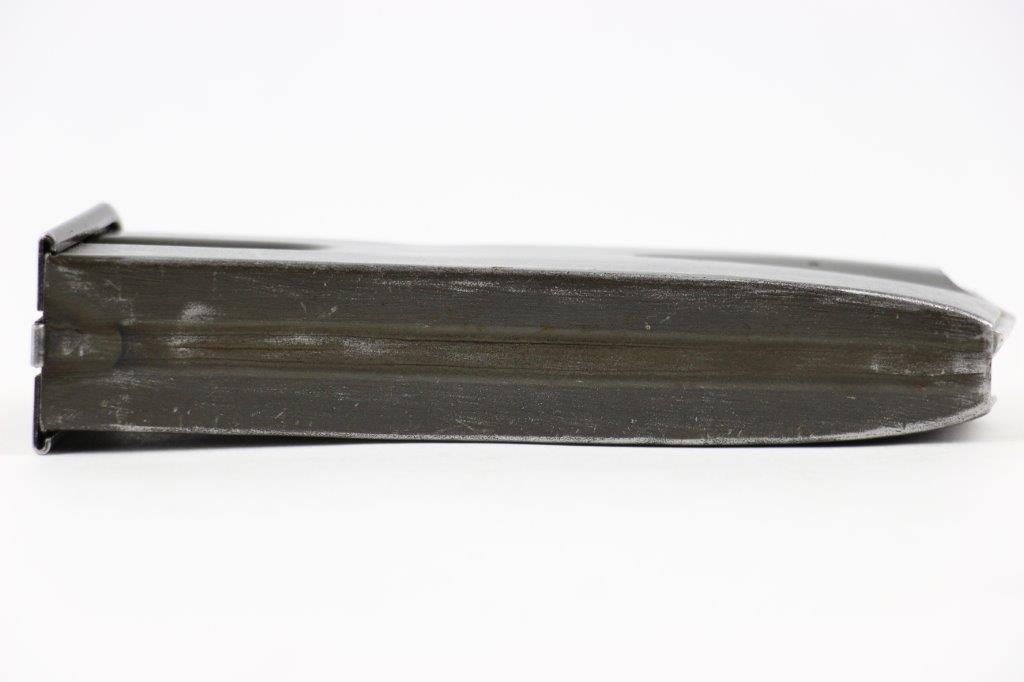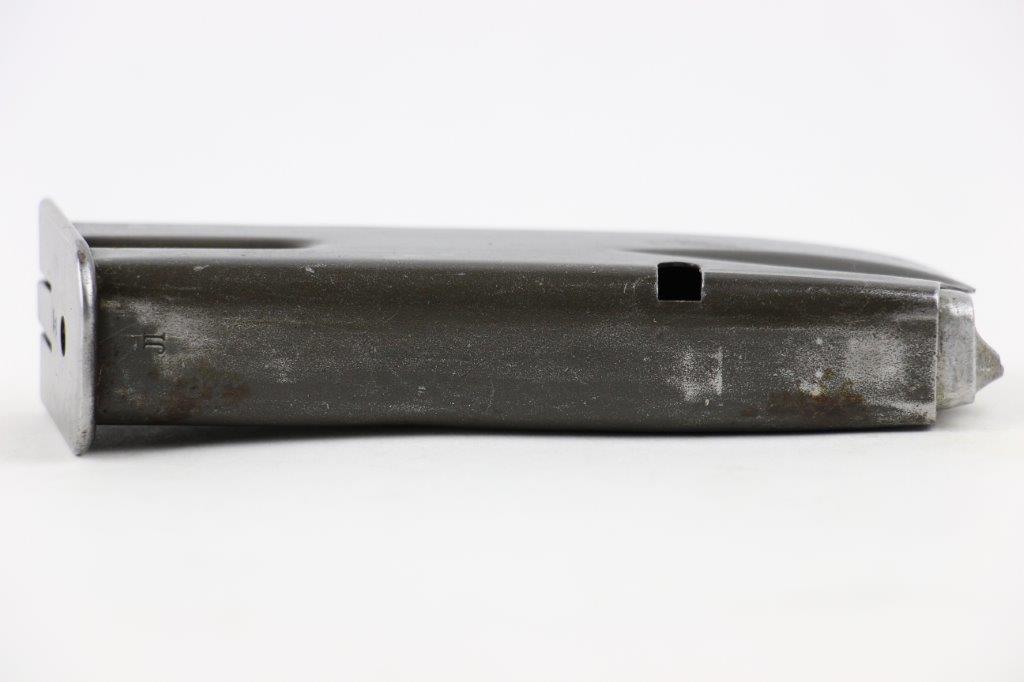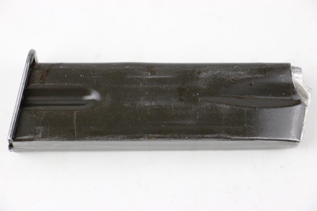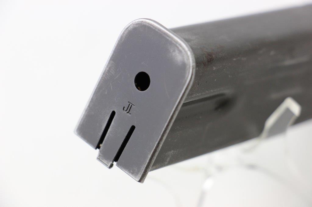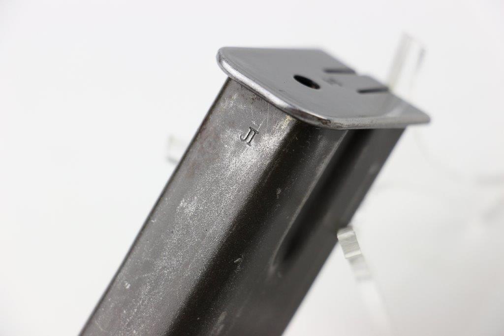 6/19/24 – This is an original WW2 era production Inglis High Power magazine. The magazine is in great overall condition with a wartime finish that shows honest use wear and mild finish loss. The base is blued and stamped “JI”. Another “JI” manufacturer stamp is found at the base of the front spine. No other markings. Strong, fully functional spring.