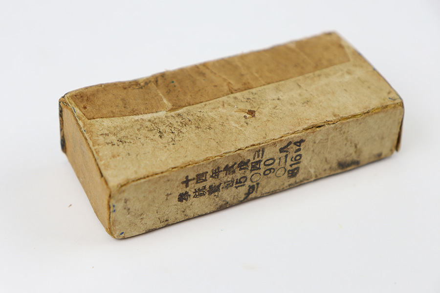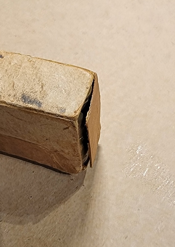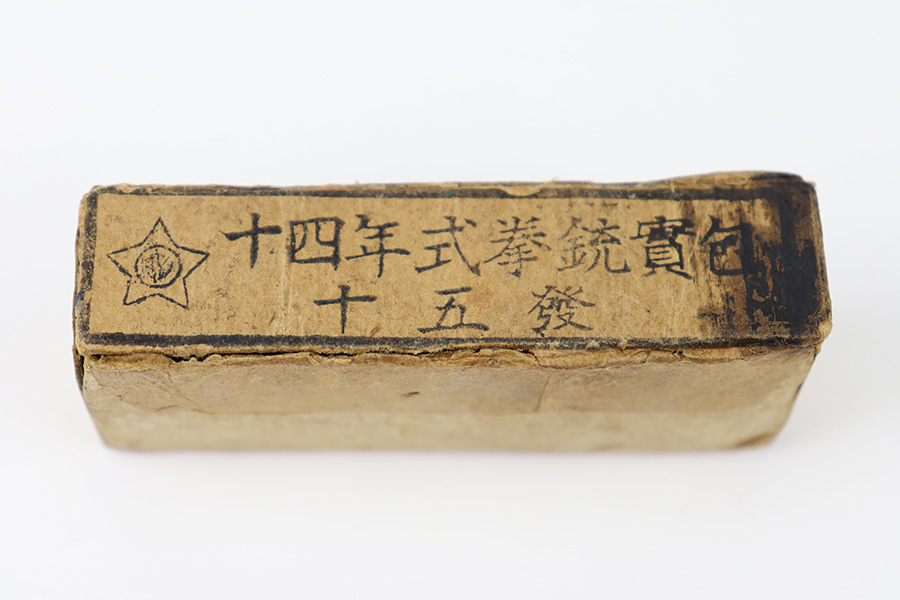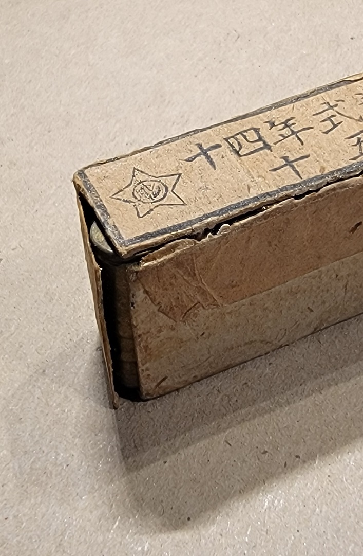 9/29/23 – This is an original box of 8mm Japanese Nambu pistol ammunition. There are 16 rounds, and the original box is still sealed. However, the side of the box is cracked along the seams, so the rounds are accessible. Ink stamp dates production to April of 1941.