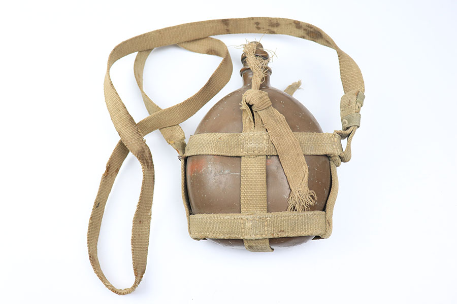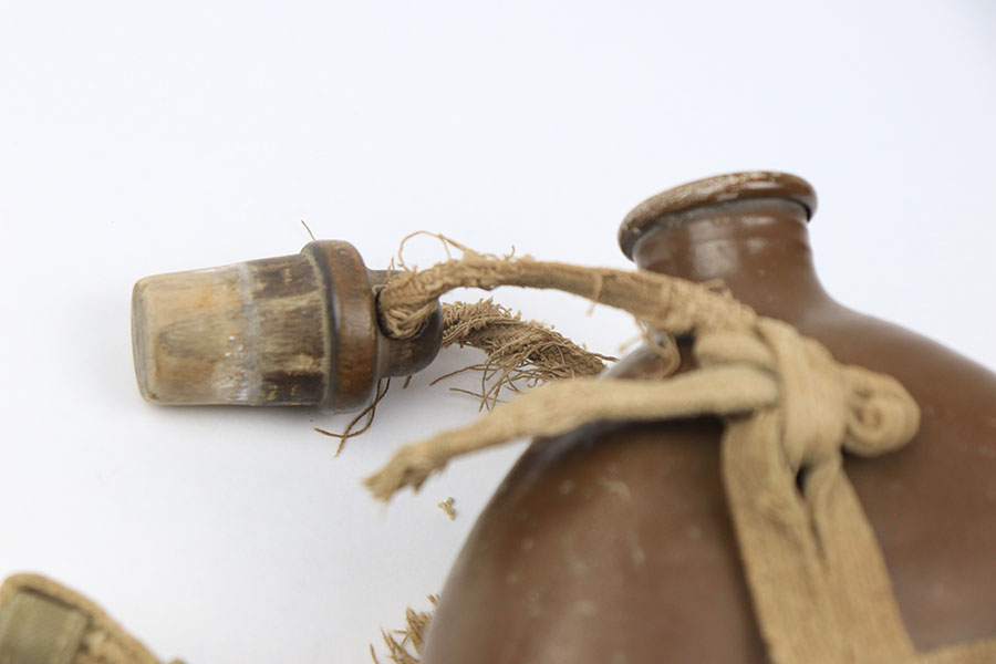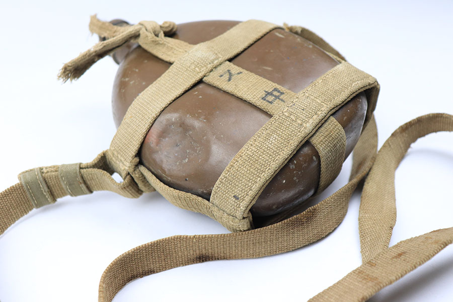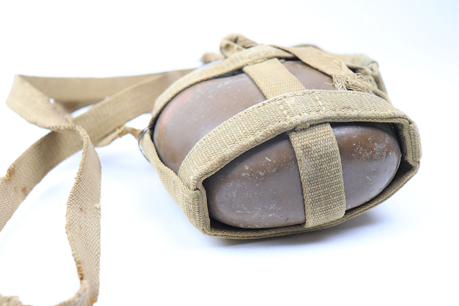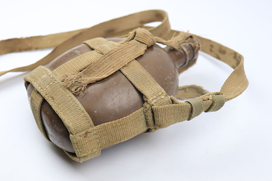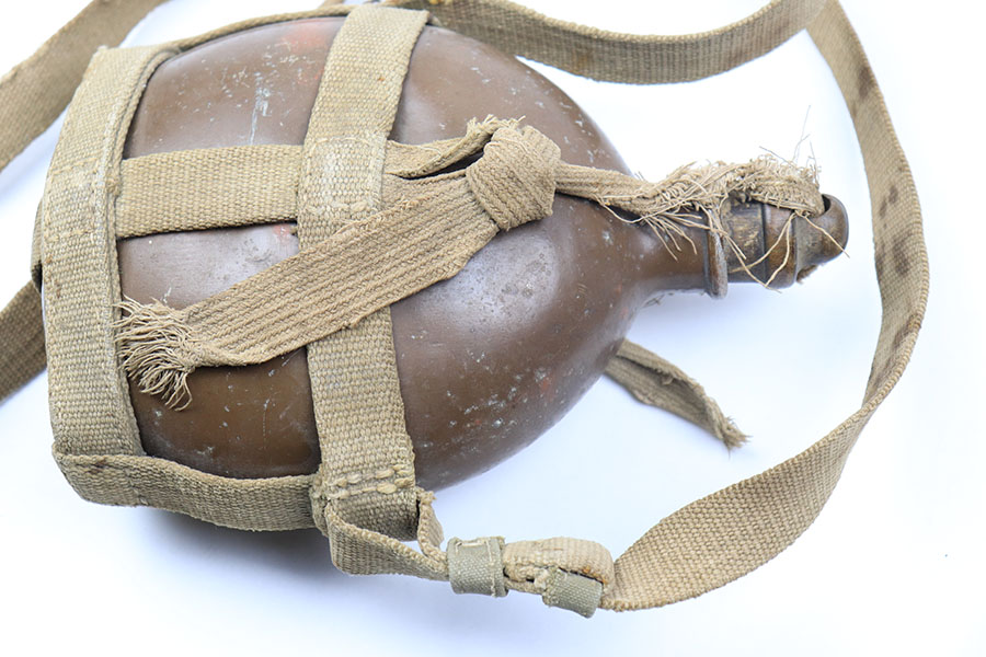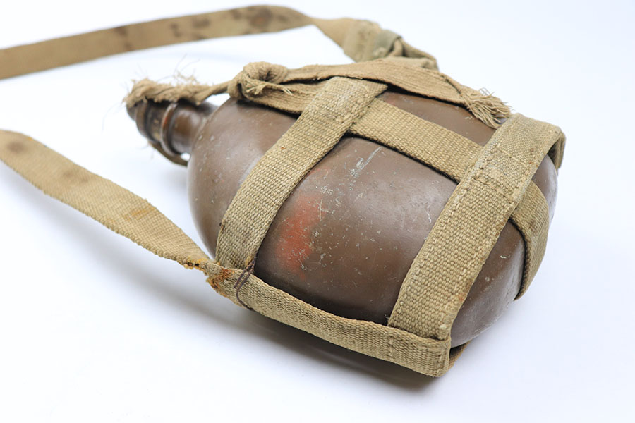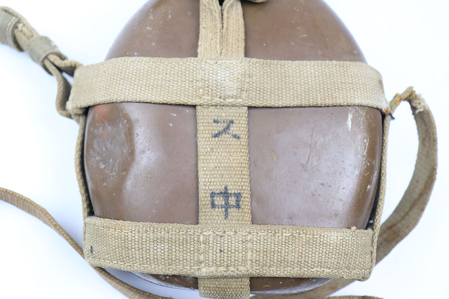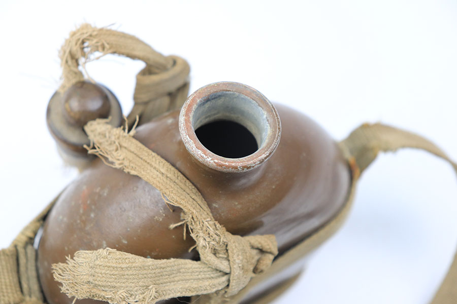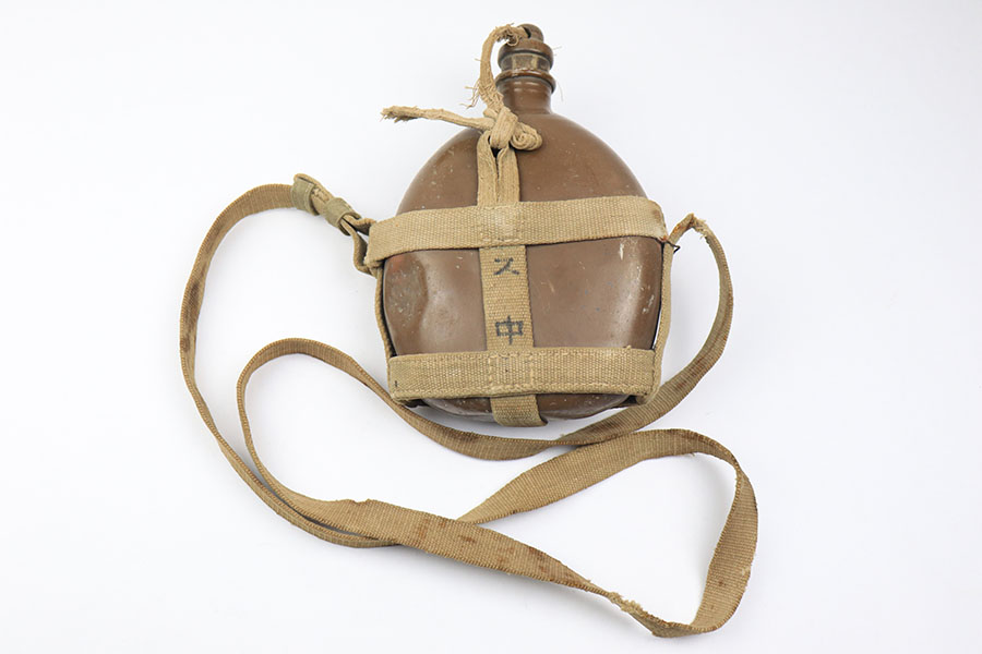 11/22/21 – This is a WW2 Japanese Field Canteen. The canteen has a brown painted finish and a wood stopper. There is a dent in the back of the canteen, but overall the canteen is in good condition with some mild signs of aging and use. The canvas shoulder strap is still in tact and original with Japanese characters on one side. There is some staining and fraying on the canvas but overall this is completely in tact and original.