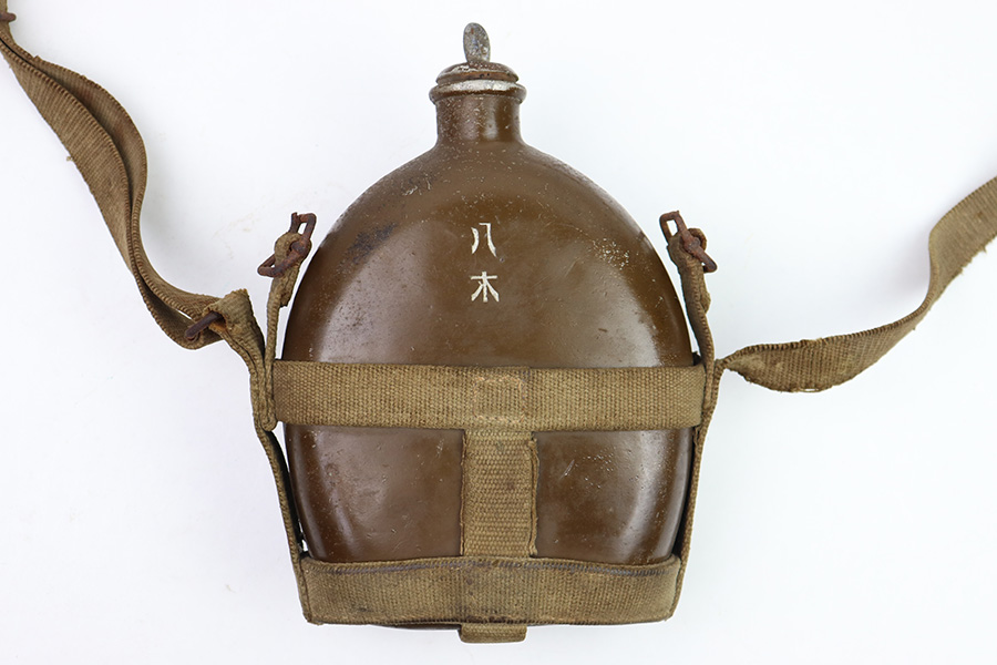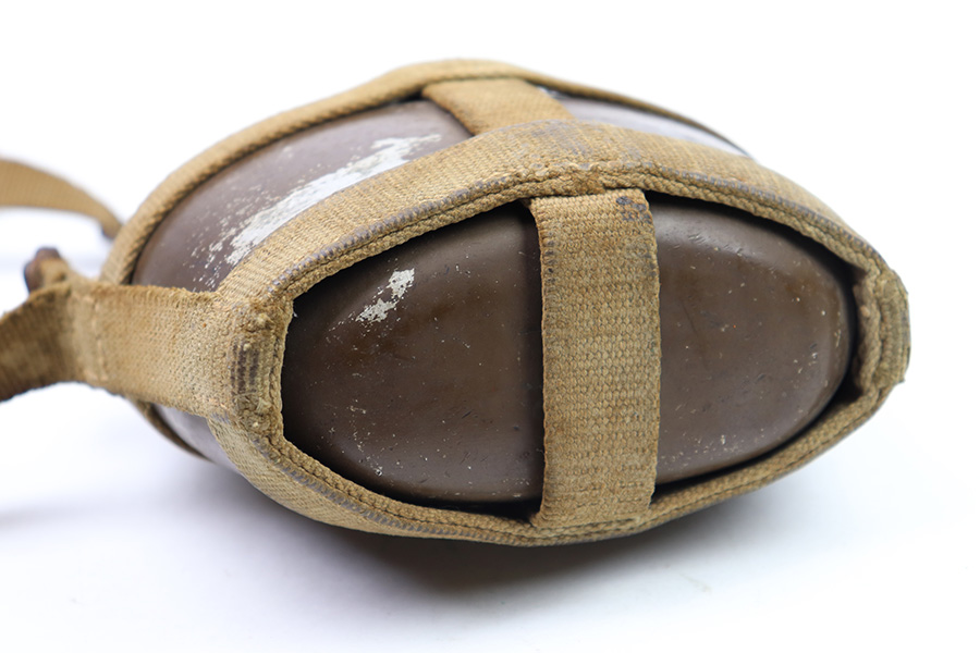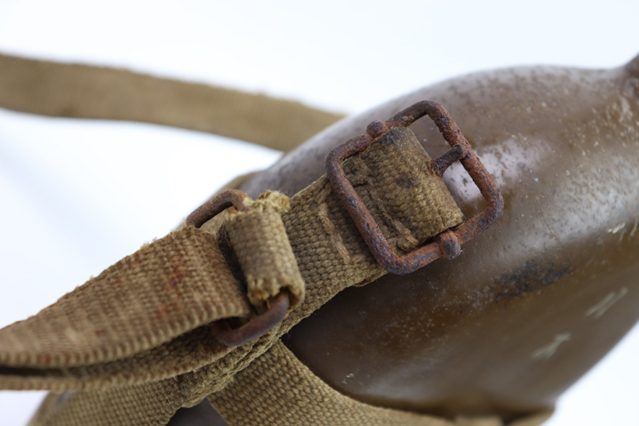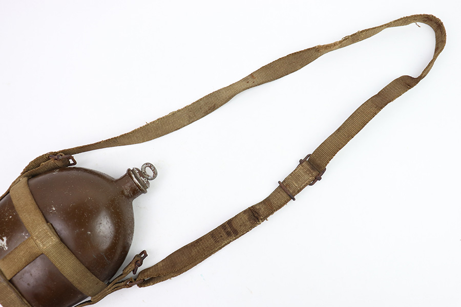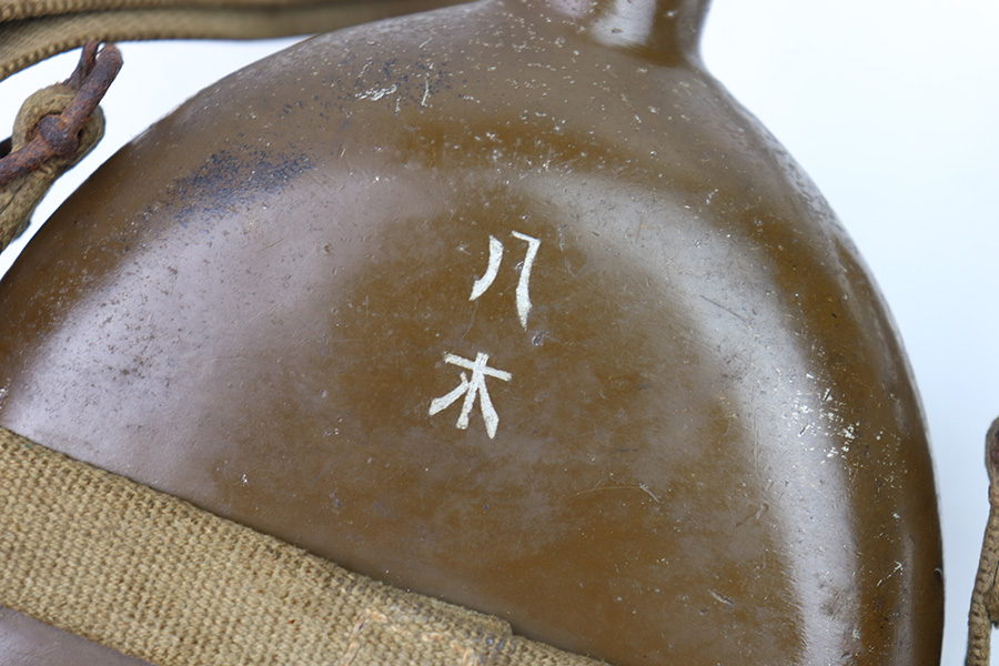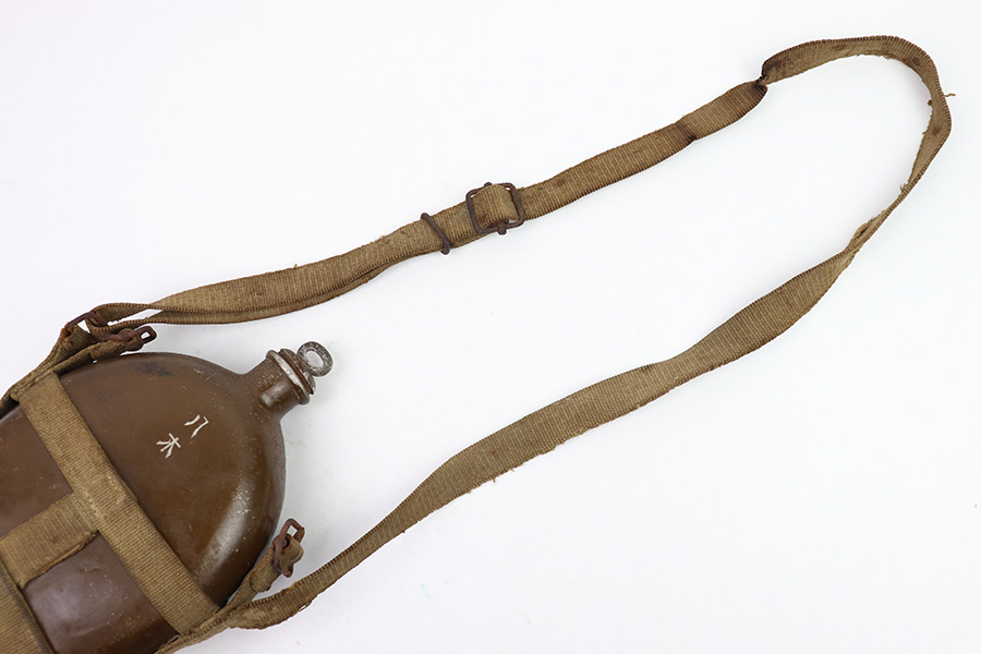 8/31/22 – This is an original WW2 Japanese Canteen. The canteen comes with a canvas harness as shown. The top cork is mostly intact and secures properly. The shell has some surface patina and mild paint loss but no dents or major issues. The canvas harness has a few rips and some fraying, but is still intact without any complete separations.