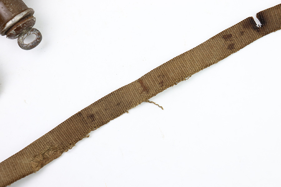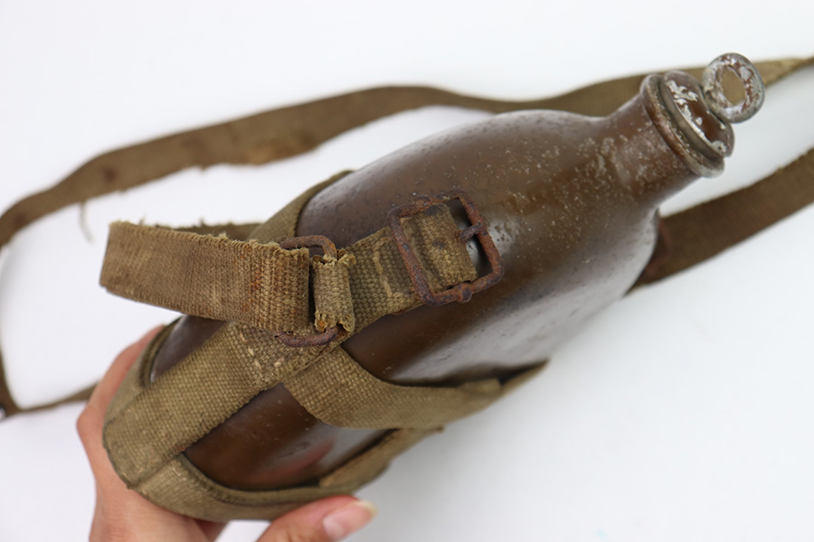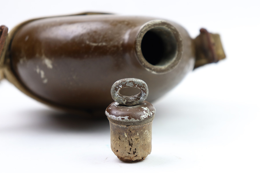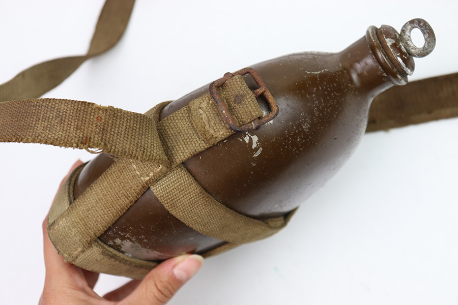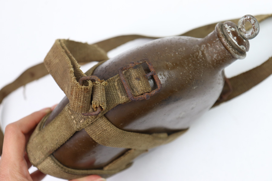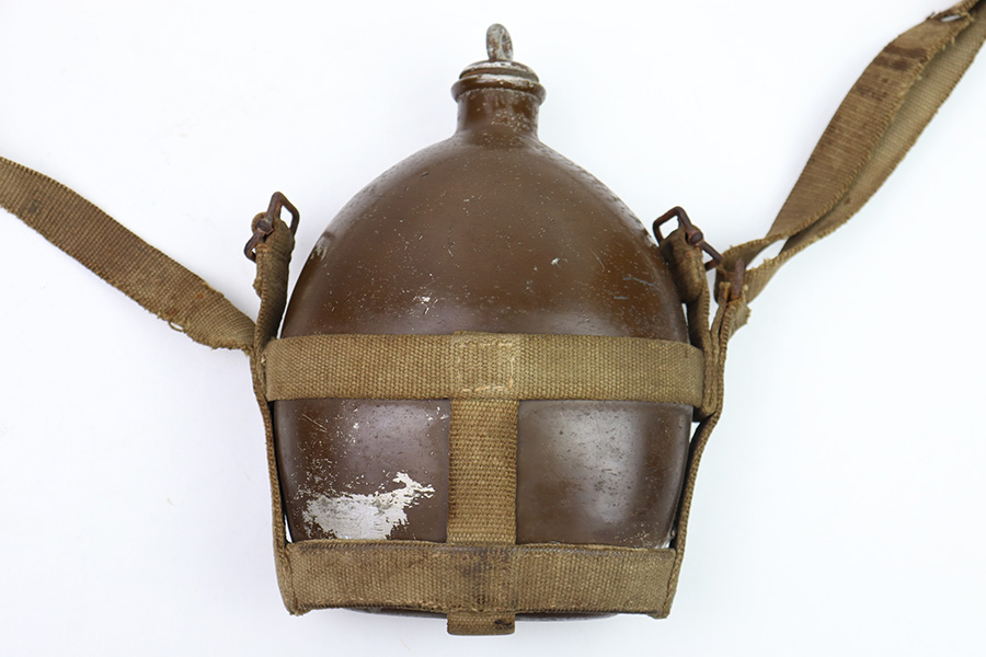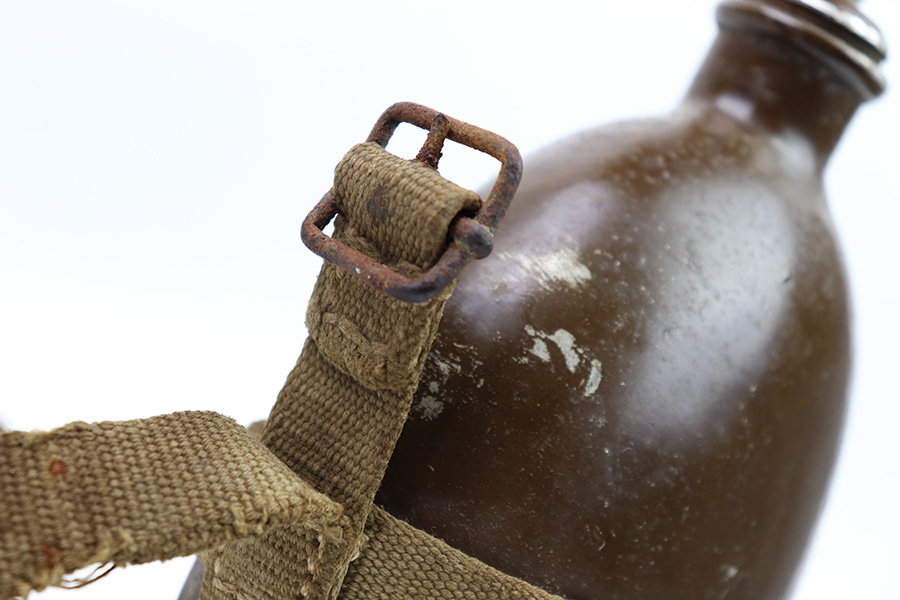 8/31/22 – This is an original WW2 Japanese Canteen. The canteen comes with a canvas harness as shown. The top cork is mostly intact and secures properly. The shell has some surface patina and mild paint loss but no dents or major issues. The canvas harness has a few rips and some fraying, but is still intact without any complete separations.