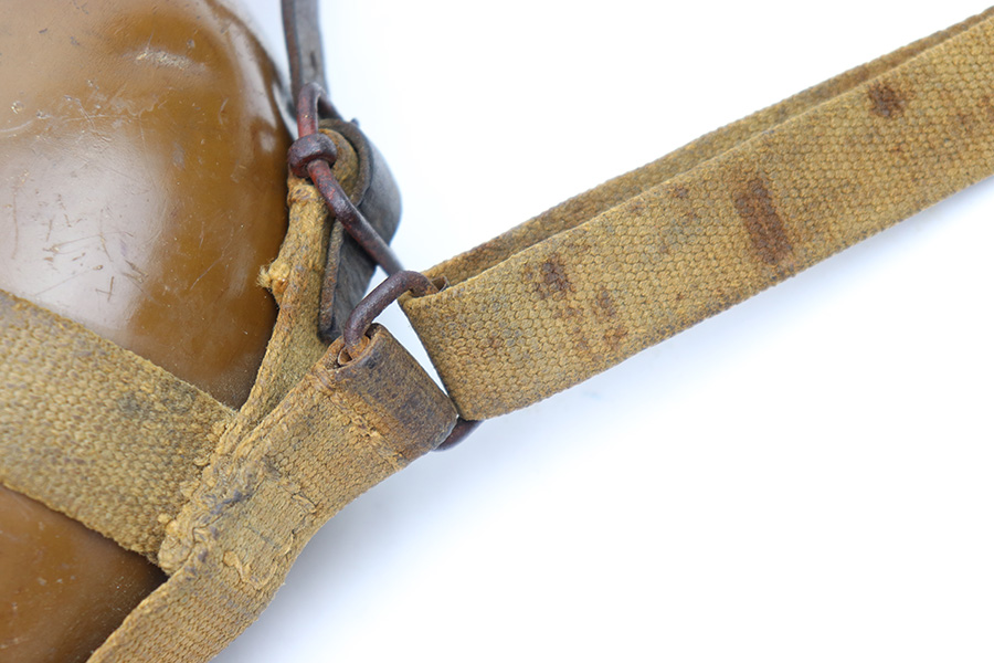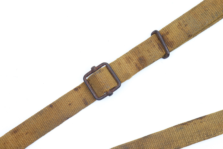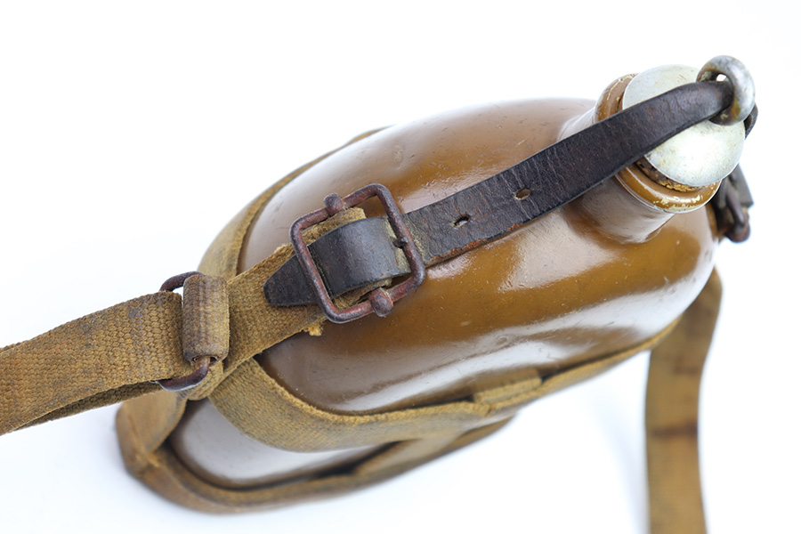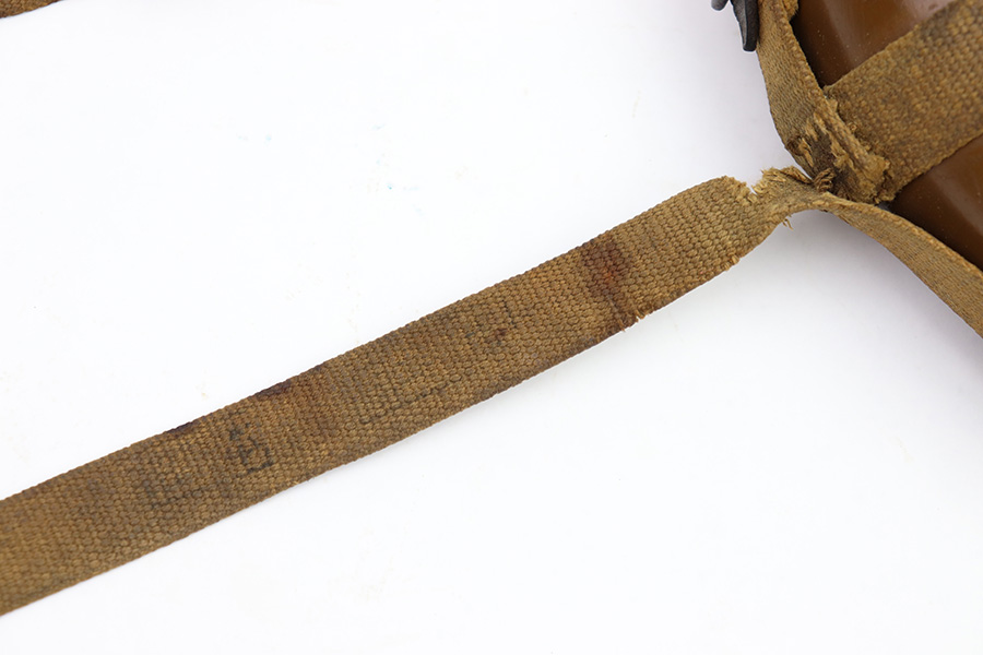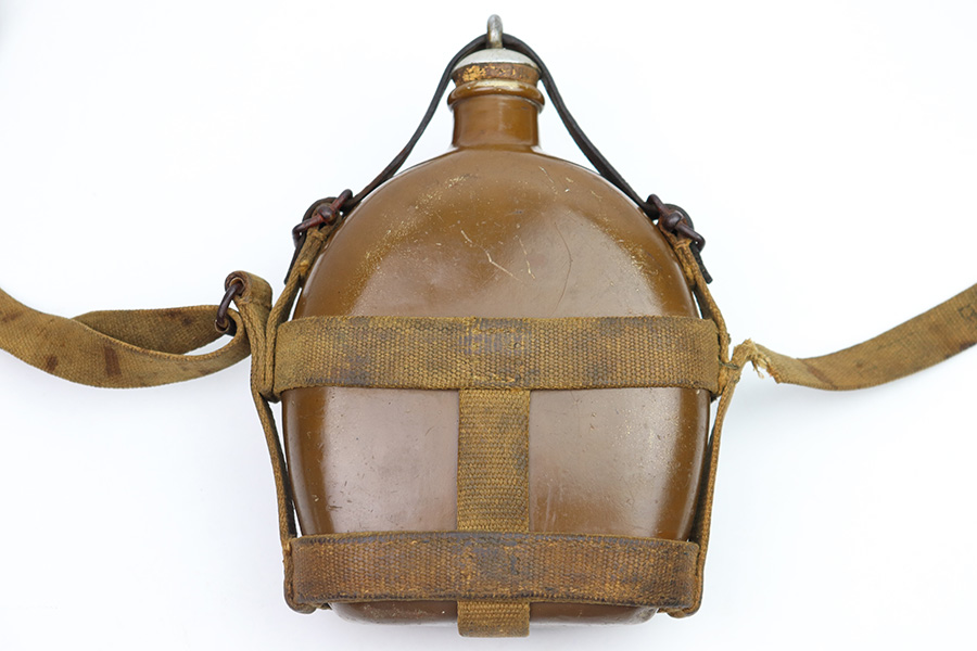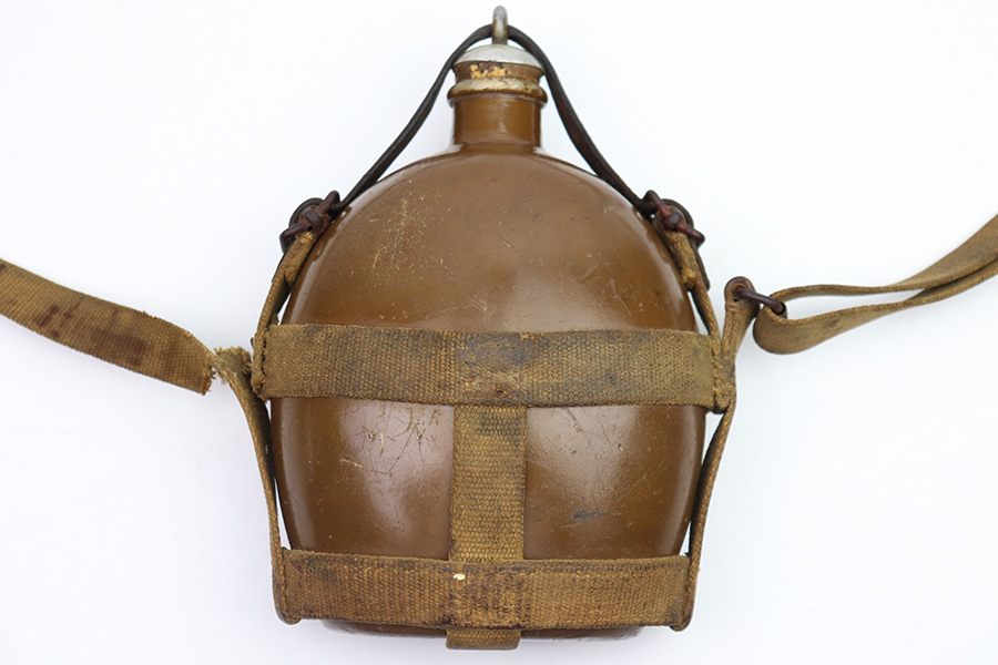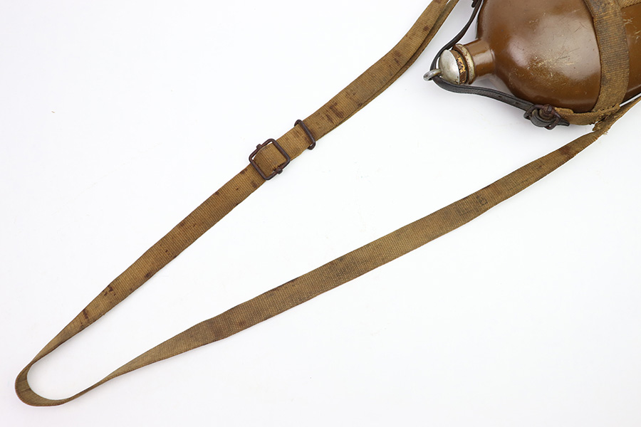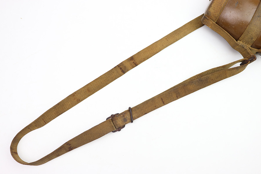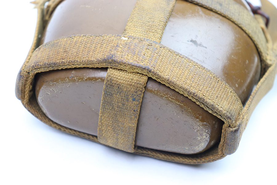9/26/22 – This is an original WW2 Japanese field canteen. Comes with a canvas carrying harness and shoulder sling as shown. There’s some discoloration from aging and previous use but no major issues. Complete with a top leather locking strap. Most of the original paint on the canteen is intact. Great overall condition.