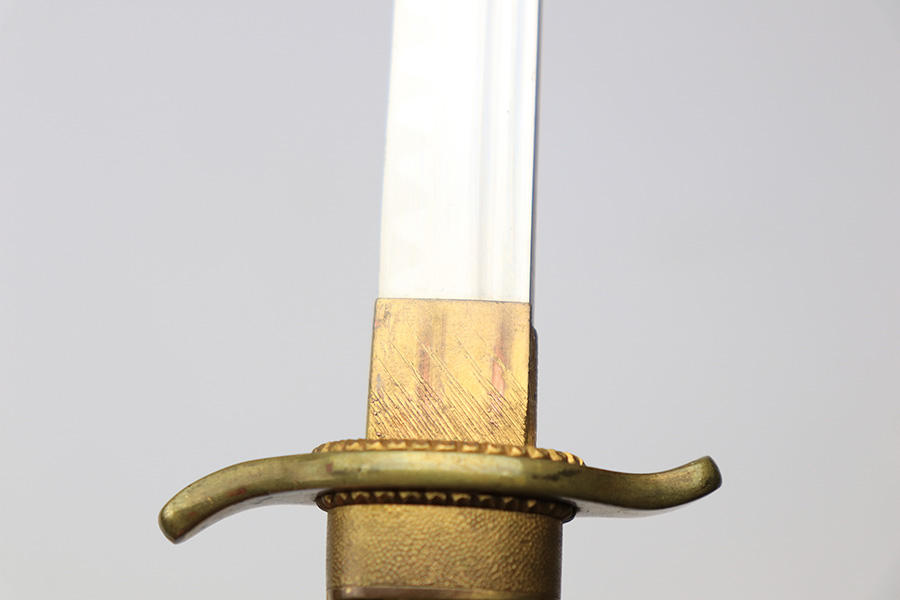 4/1/22 – This is an Imperial Japanese Naval Dirk. These were carried in the place of swords by many Japanese Naval Officer’s during WW2. The blade is in excellent condition with a factory-made tempered edge. The edge is semi-sharp and shows no signs of sharpening. There’s a few small spots of wear on the blade, but overall the condition is excellent. The handle, hand guard, and pommel are all in tact and excellent as well. Measures about 13 inches long (not in scabbard). Comes with an original scabbard that’s also excellent with no notable issues.