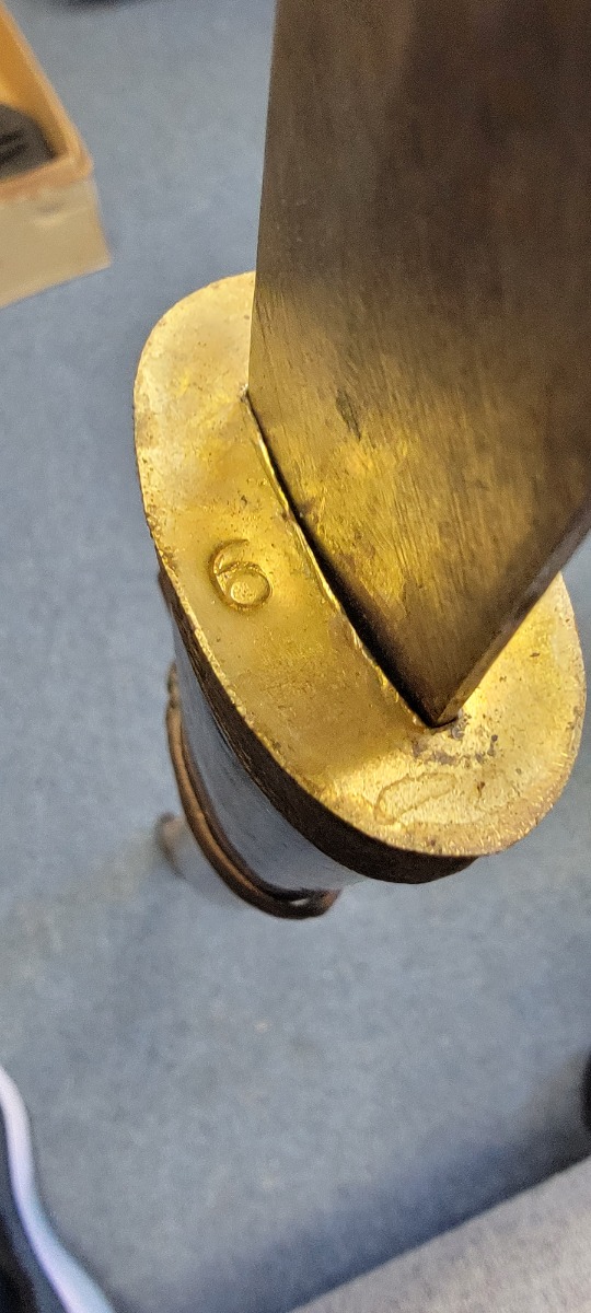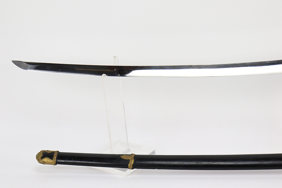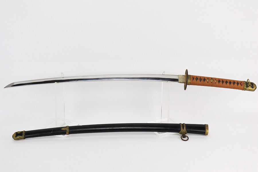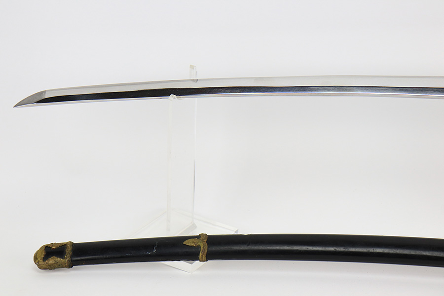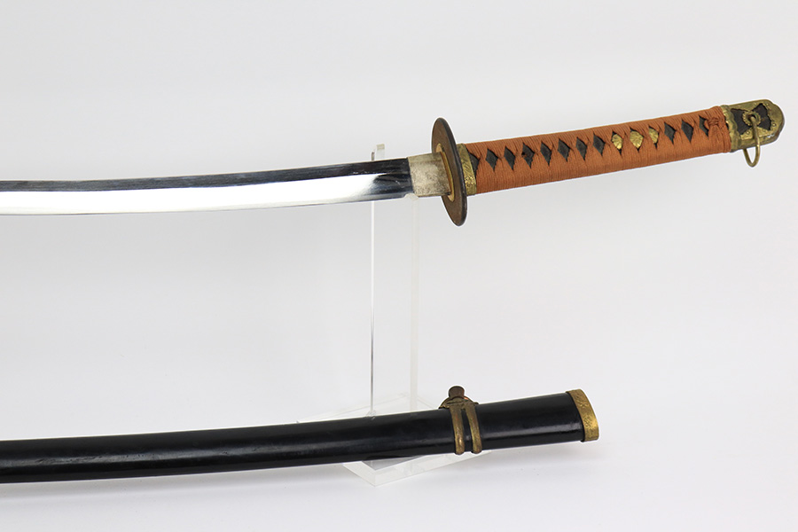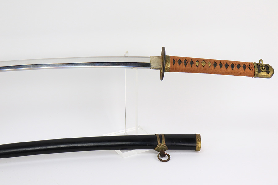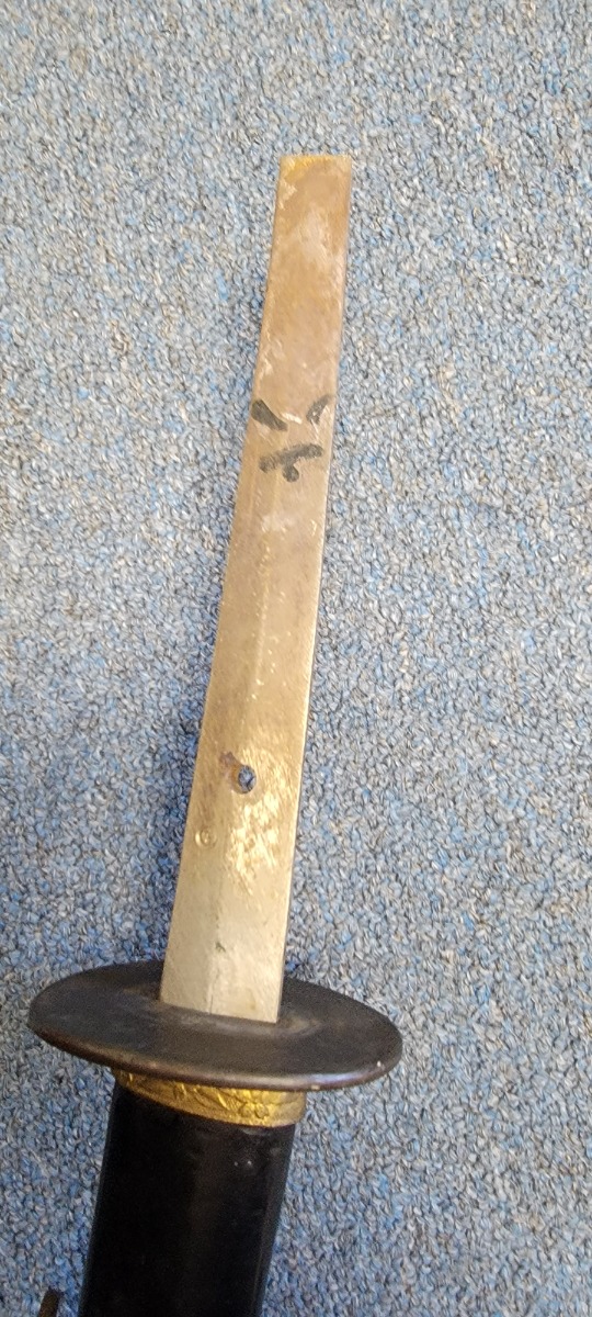 5/10/22 – This is an original WW2 Japanese Naval Officer’s Sword. The is shiny and unsharpened, in great overall condition. There are a few small blemishes and minor surface scratches but this is mostly normal scabbard wear. The blade edge is approximately 24 inches long with a 1 inch ricasso. Overall length is approx. 35 inches (without the scabbard). There is one very small nick in the blade edge, but the factory “replica” tempered finish is still visible throughout the edge line. The wrapped handle is in great condition as well with nice fittings that show mild patina. The fittings are matching numbered “6” as shown. The wood scabbard is in great condition with excellent black painted finish throughout, and some minor chipping and damage near the toe, but this isn’t severe. A very nice factory-made Japanese Navy Officer katana.