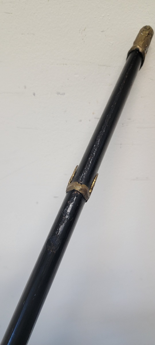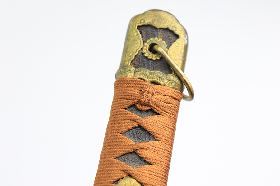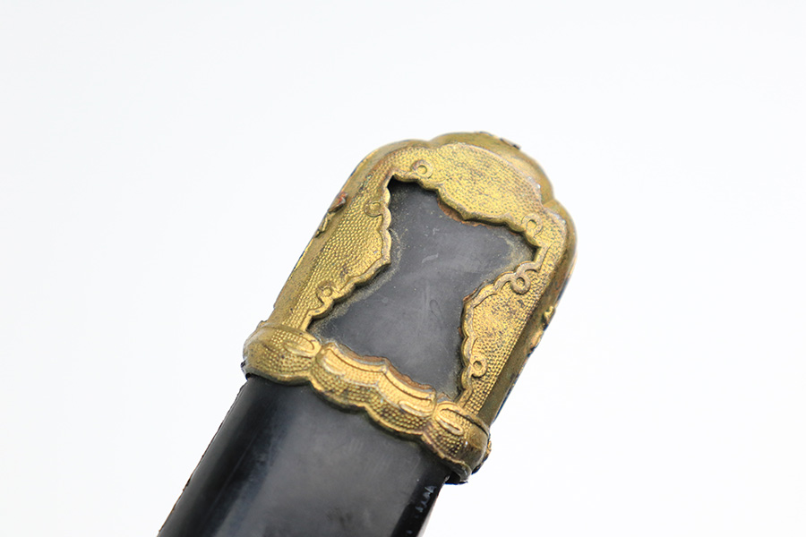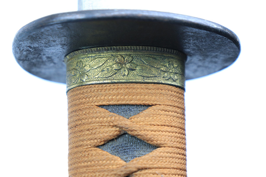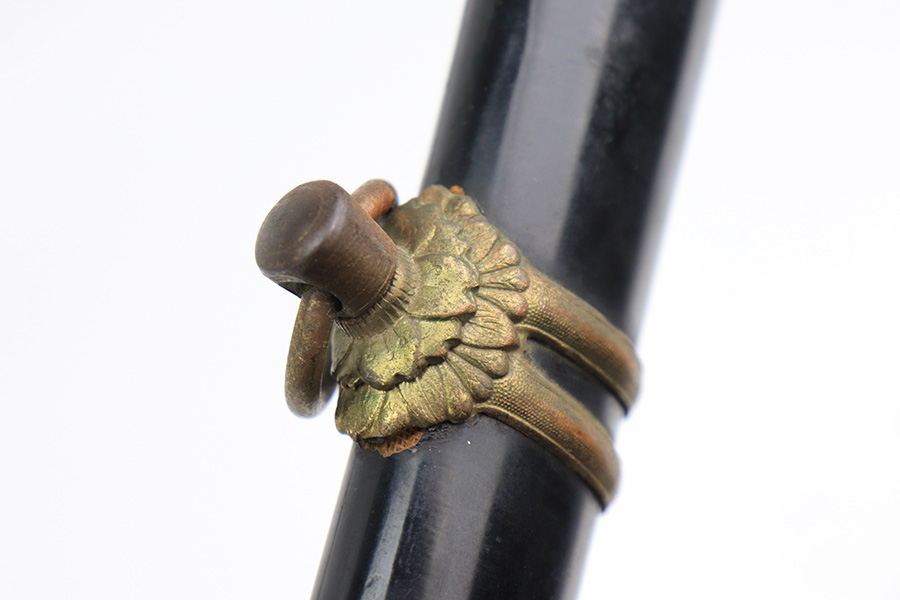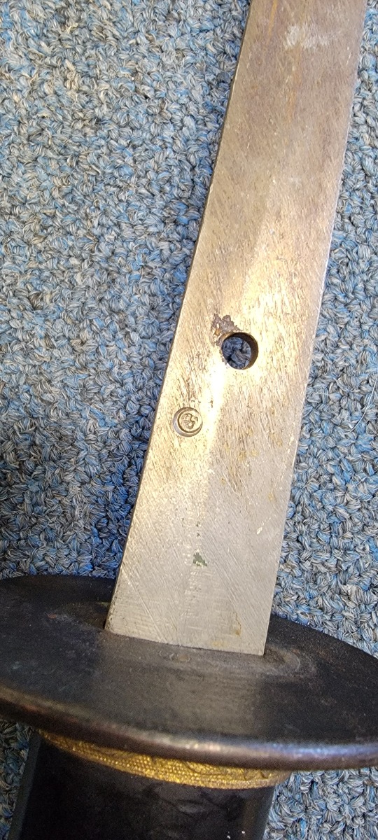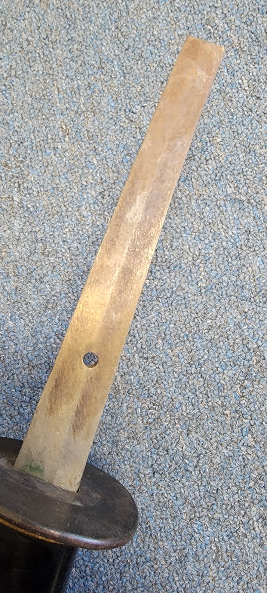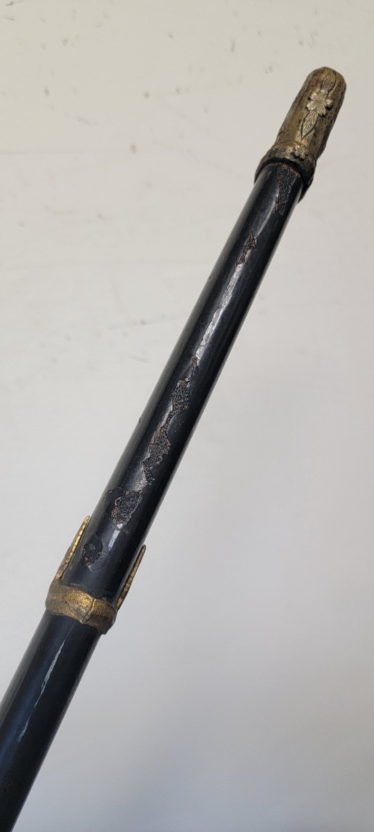 5/10/22 – This is an original WW2 Japanese Naval Officer’s Sword. The is shiny and unsharpened, in great overall condition. There are a few small blemishes and minor surface scratches but this is mostly normal scabbard wear. The blade edge is approximately 24 inches long with a 1 inch ricasso. Overall length is approx. 35 inches (without the scabbard). There is one very small nick in the blade edge, but the factory “replica” tempered finish is still visible throughout the edge line. The wrapped handle is in great condition as well with nice fittings that show mild patina. The fittings are matching numbered “6” as shown. The wood scabbard is in great condition with excellent black painted finish throughout, and some minor chipping and damage near the toe, but this isn’t severe. A very nice factory-made Japanese Navy Officer katana.
