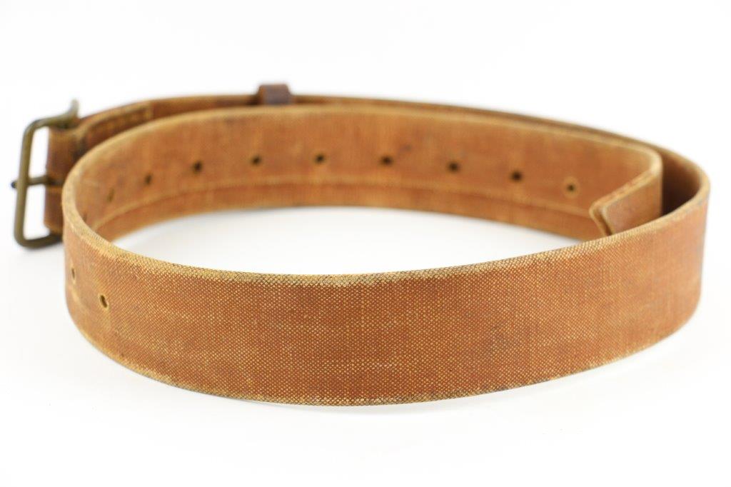 6/24/24 – This is an original WW2 Japanese Uniform Belt made from rubberized canvas material. The belt fastening buckle has olive green field paint with light patina and paint loss throughout. The rubberized canvas has light surface wear and aging throughout. Mild pliability and great condition overall. The stitching is all tight and original. One original leather adjustment loop attached as well. No markings or stamps.