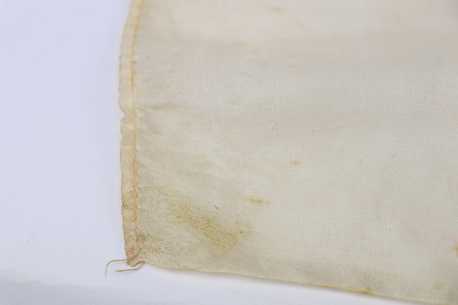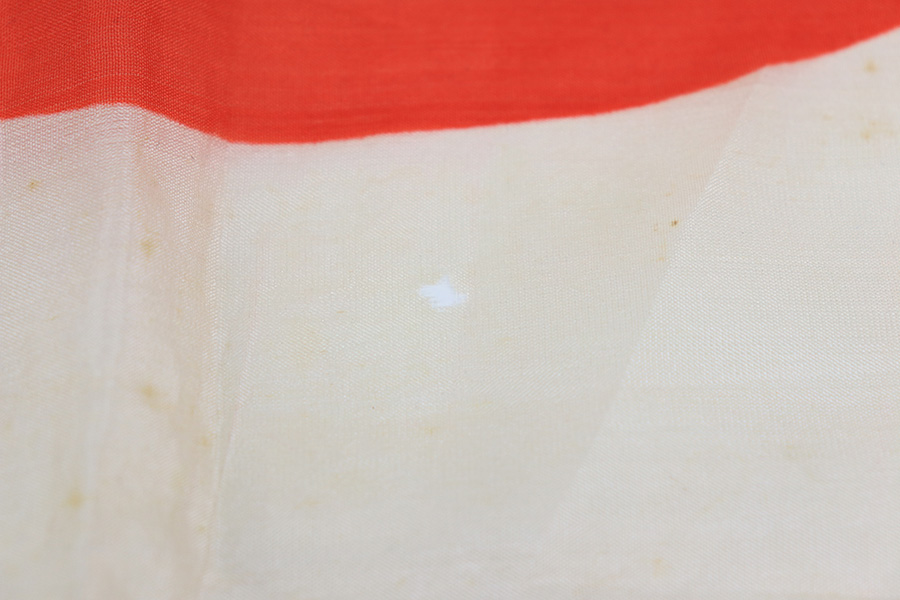 1/19/22 – This is a WW2 era Japanese Silk flag in great condition. The flag is double sided and made from delicate silk. The silk is thin but still completely in tact. There are a few very small holes in the silk but overall this piece is in great shape. Minimal staining. two of the corners have the original leather hanging tabs as shown. Measures about 36 x 25.5 inches.