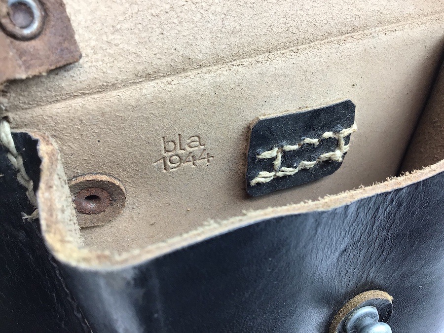 11/9/22 – Original and minty condition, WWII German Army G43 / K43 magazine pouch. Maker and date stamped “bla” 1944 on the inside of right pouch. Black supple leather, brown loops. Appears un-issued condition – very clean and crisp throughout.