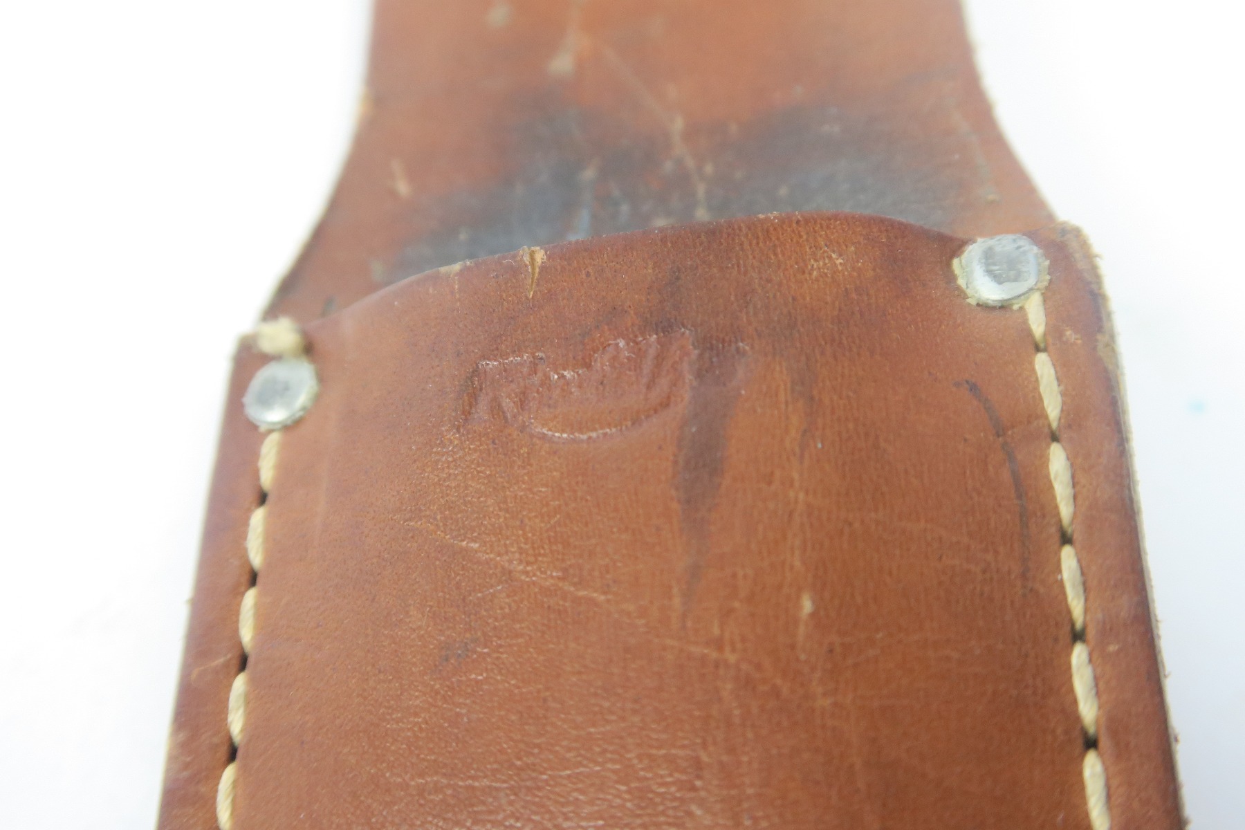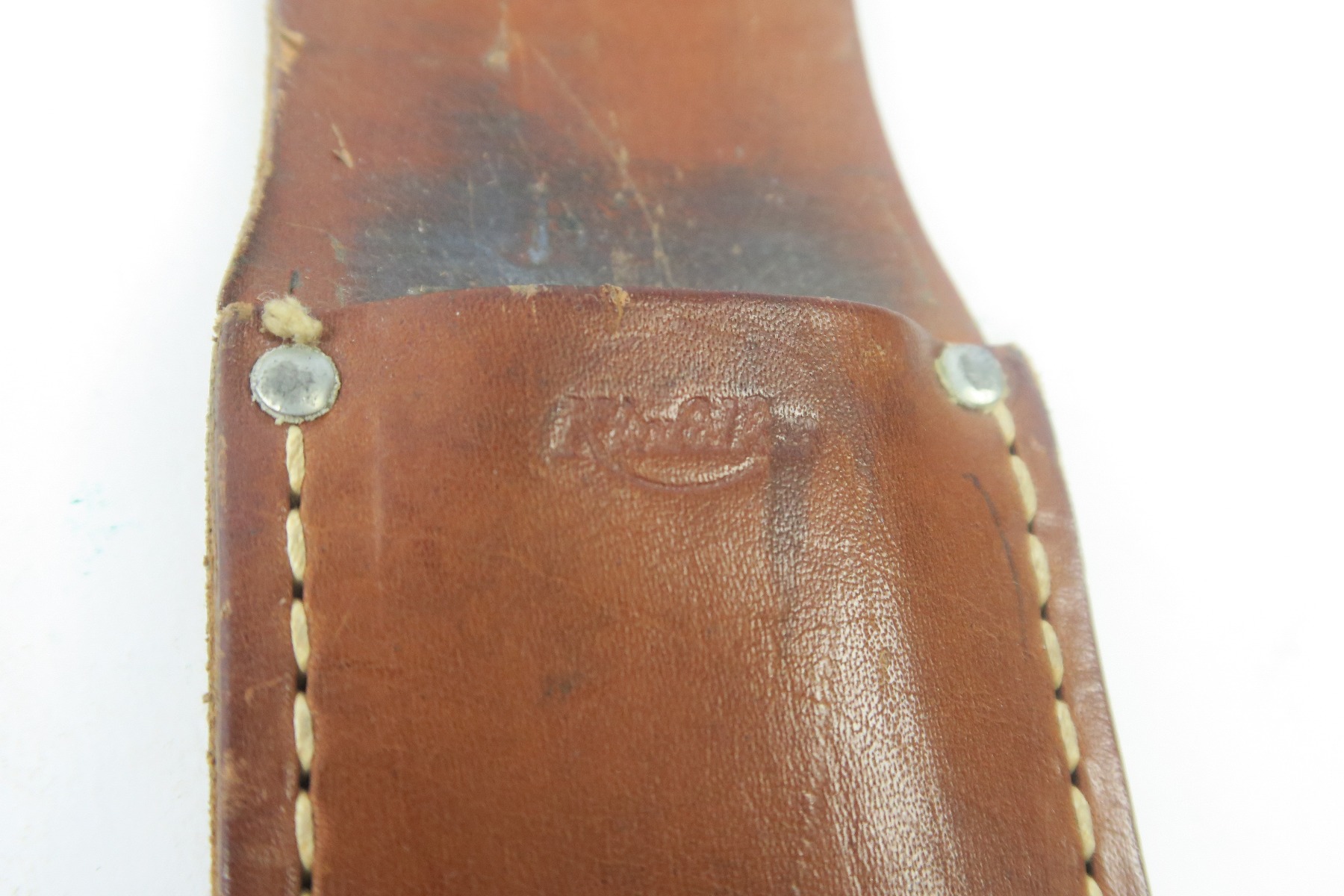 7/24/17 – This is an original Kinfolks USA knife made during the 1940s. The blade is chromed and shiny, with a shallow blood well. The blade is very sharp, and shows minor signs of sharpening as well. The blade is in excellent condition with very minimal wear and light scratch marks from previous sharpening. One side of the blade is maker stamped. The handle is excellent. The scabbard is also excellent, with the original Kinfolks maker stamp still on the leather (although faint).