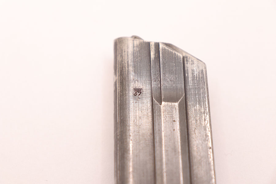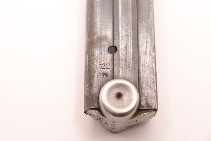10/28/20 – This is an original WW2 production Navy Luger magazine. The base of the magazine is aluminum and serial numbered. There is also a Navy property stamp on the base “N 5082 x”. It is serialized “5046”. The magazine tube is blued and stamped “122”, “P.08”, and has two eagle/37 proof stamps. The magazine is in great condition with a strong spring and no rust or pitting.