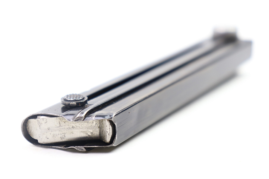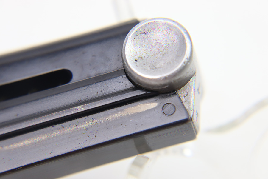 9/23/22 – This is an original WW2 German Navy Luger magazine made by Mauser. The base of the magazine is aluminum, and has a Kriegsmarine property stamp above the serial number and eagle/63 military proof stamp. Great overall condition with some mild surface patina and light finish loss on the tube. The spring is strong and functional.