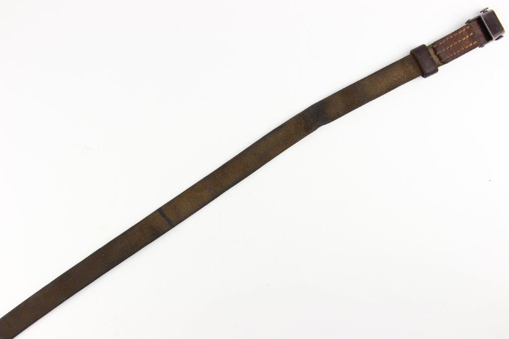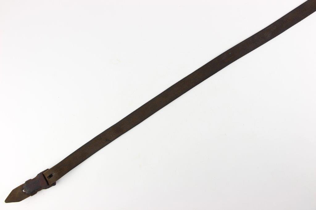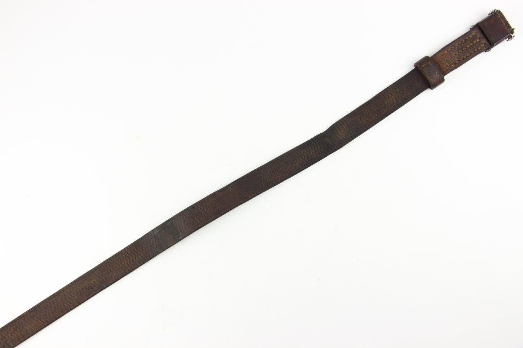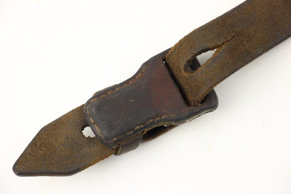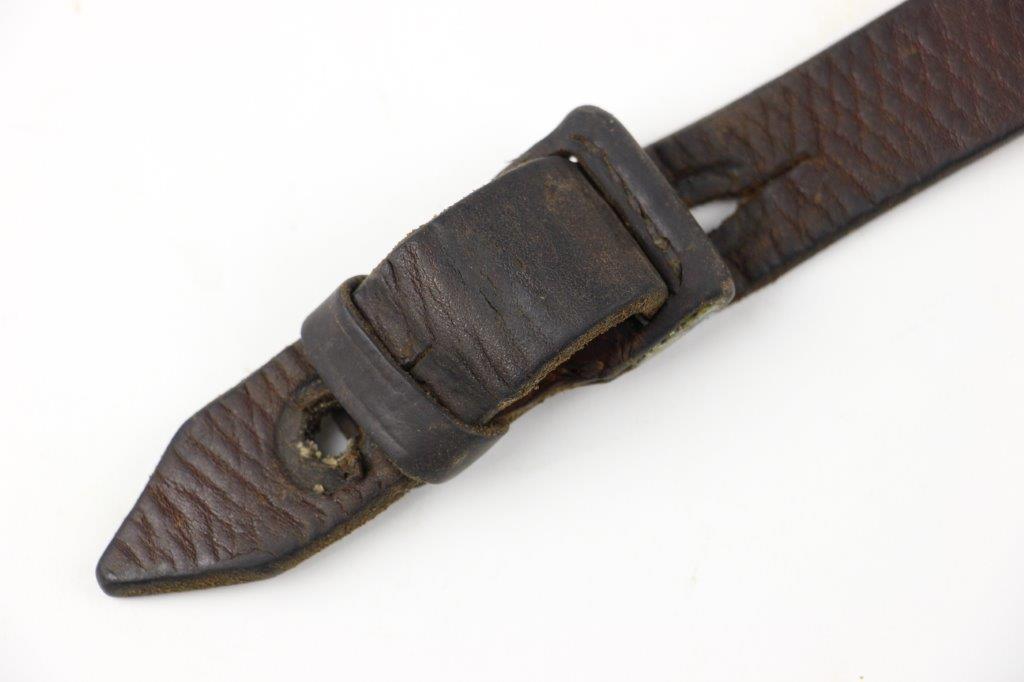 10/12/24 – This is an original WW2 German K98 leather rifle sling. No visible markings or stamps, but great overall condition with natural age and pliability but no cracking or significant damage to the leather. Original keeper is included and attached. The sling retains an original leather adjustment loop as well.