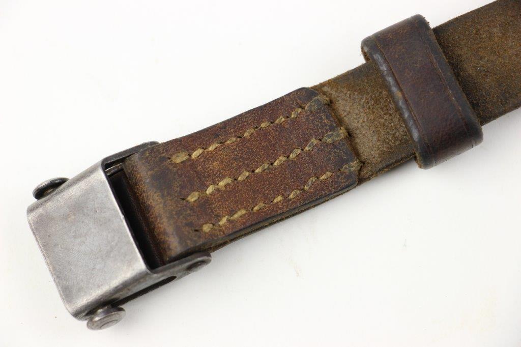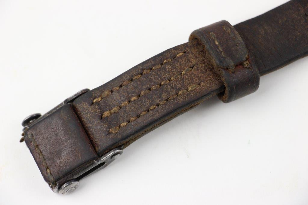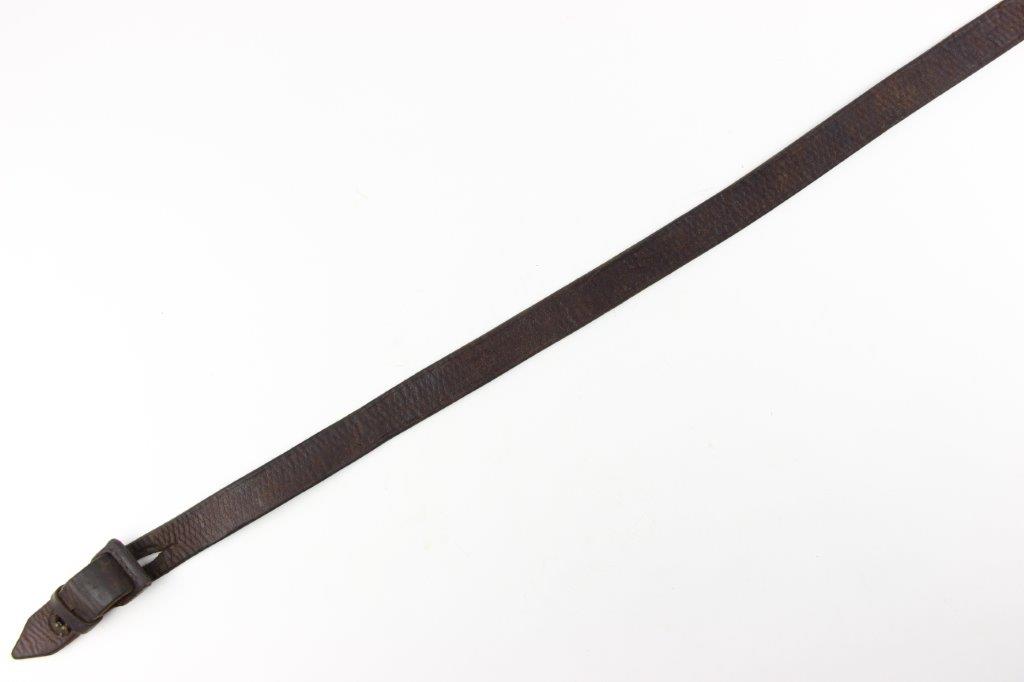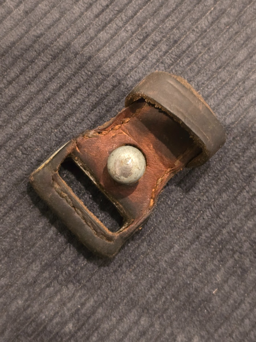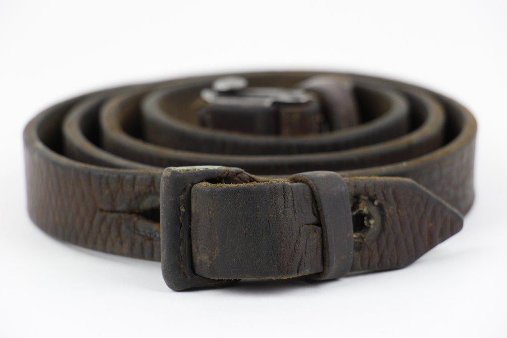 10/12/24 – This is an original WW2 German K98 leather rifle sling. No visible markings or stamps, but great overall condition with natural age and pliability but no cracking or significant damage to the leather. Original keeper is included and attached. The sling retains an original leather adjustment loop as well.
