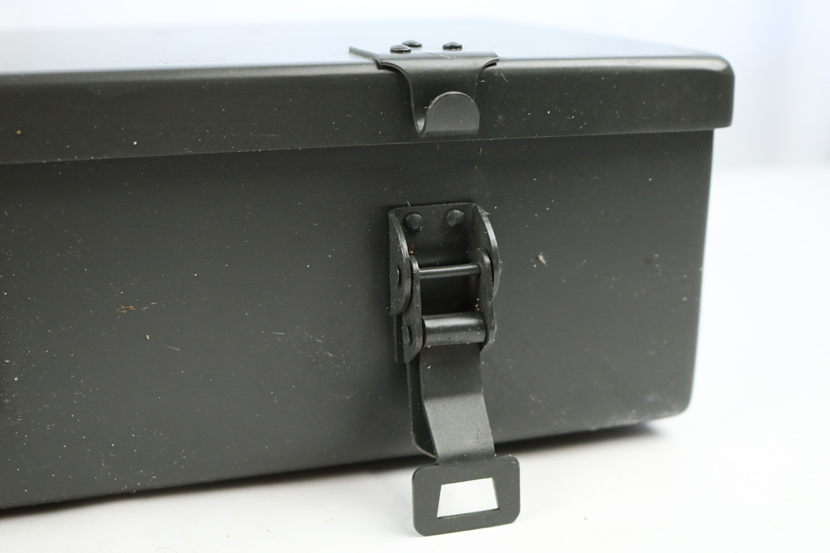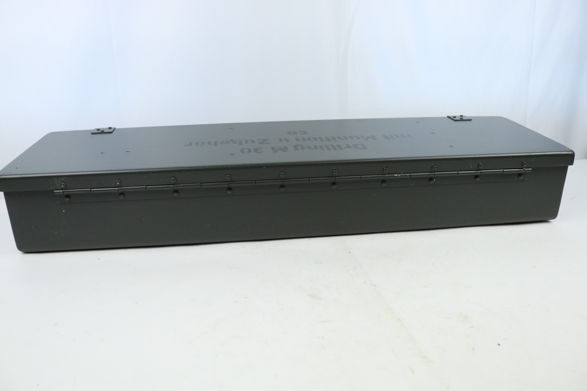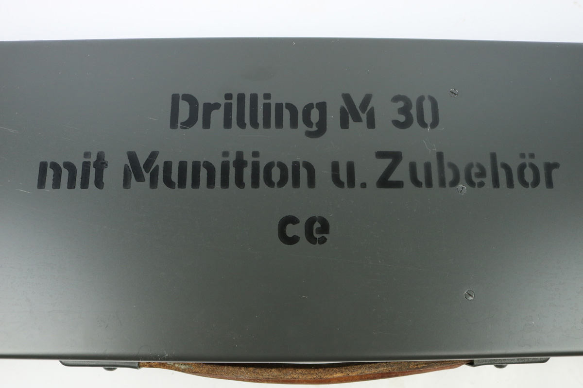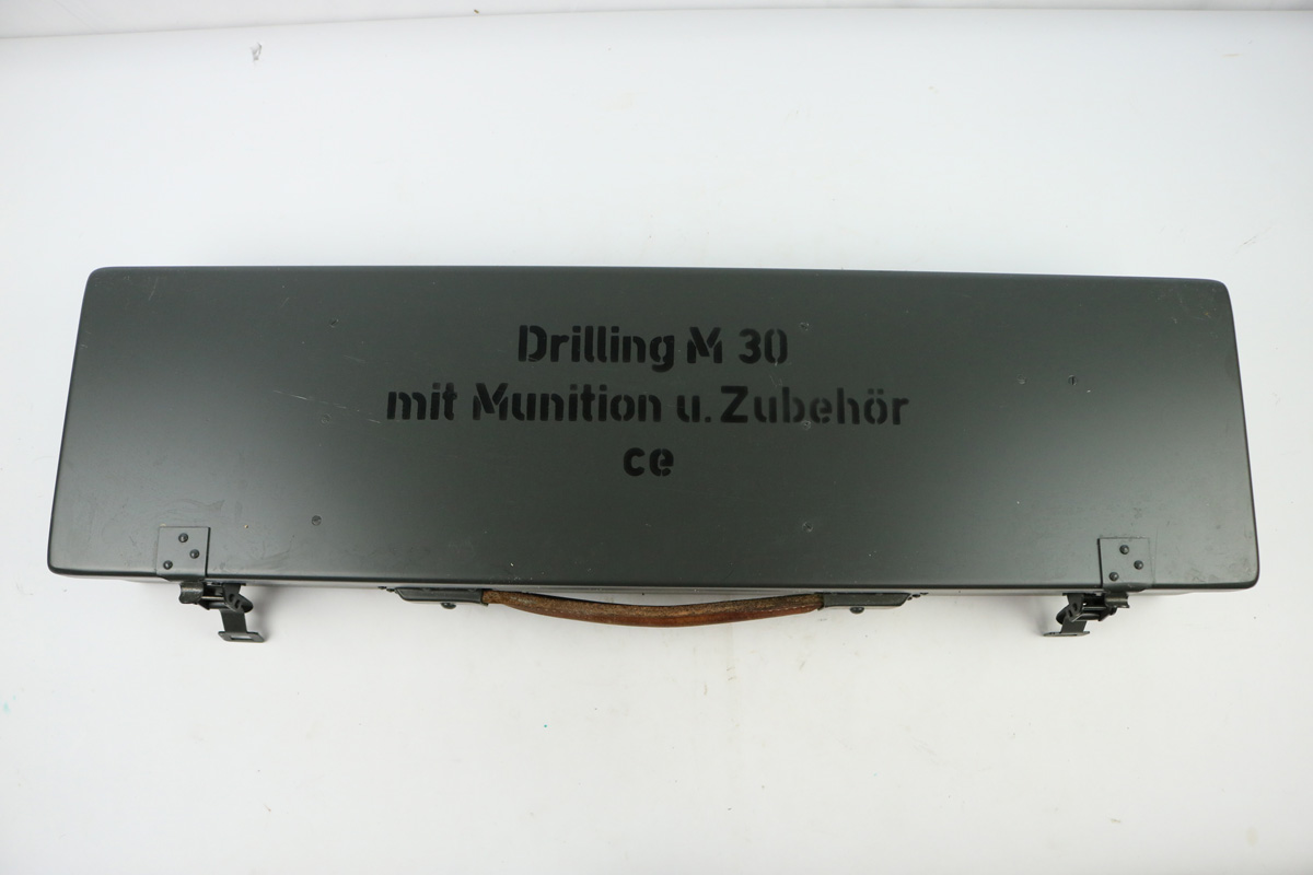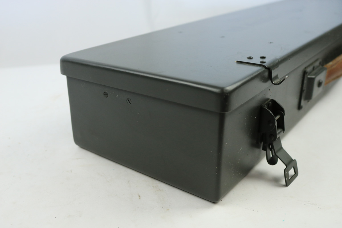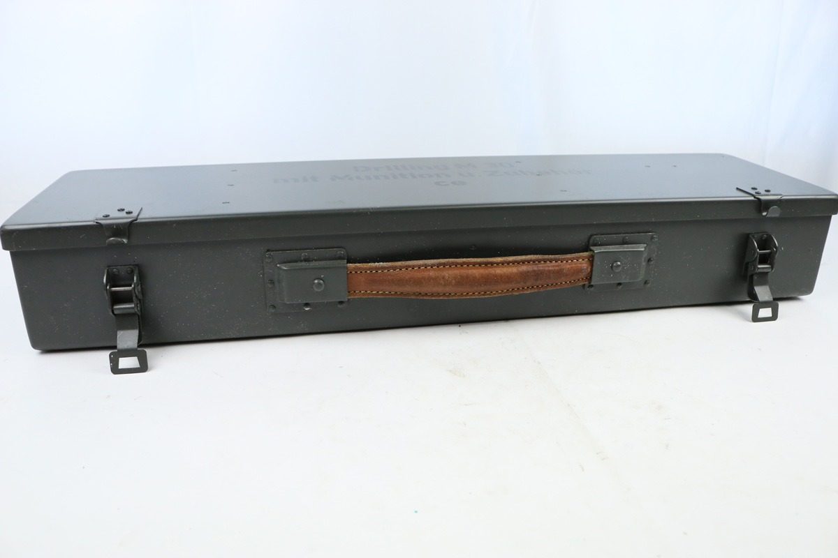 8/31/18 – This is an original WW2 Luftwaffe Drilling Rifle case that has been repainted. The result is a Drilling M 30 metal case in like-new condition. The only wear is some scuffing / residue on the lower right side of the base. This white residue is shown in photos and could likely be cleaned off. The rest of the case is excellent – as shown in photos. These are very scarce cases and make use as a great display piece for your collection or place holder for a WW2 Luftwaffe drilling.