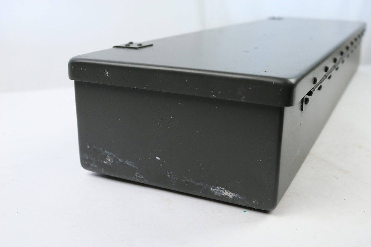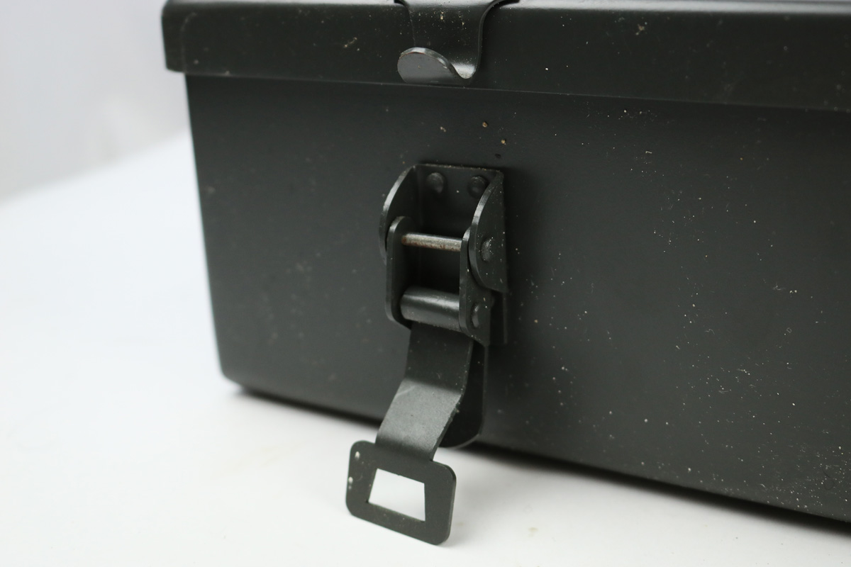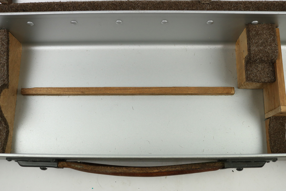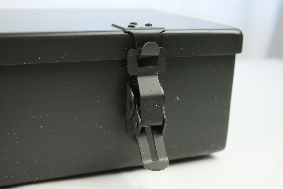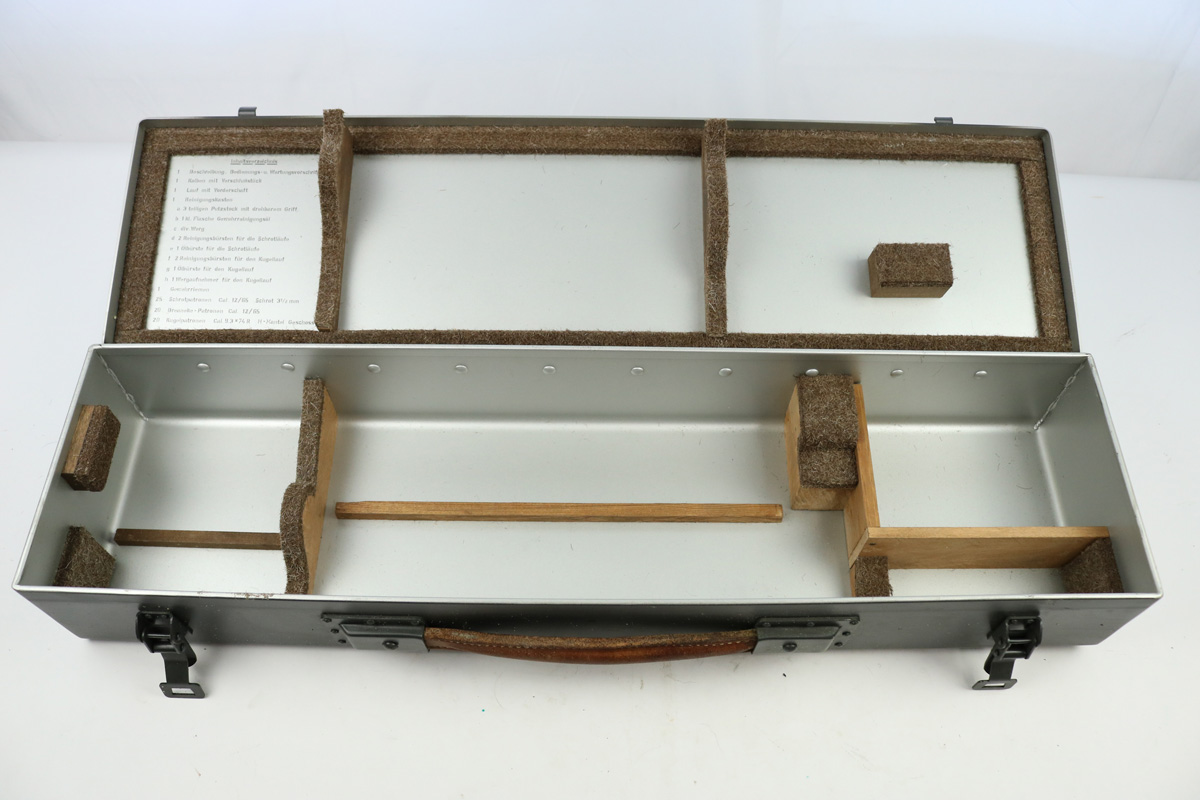 8/31/18 – This is an original WW2 Luftwaffe Drilling Rifle case that has been repainted. The result is a Drilling M 30 metal case in like-new condition. The only wear is some scuffing / residue on the lower right side of the base. This white residue is shown in photos and could likely be cleaned off. The rest of the case is excellent – as shown in photos. These are very scarce cases and make use as a great display piece for your collection or place holder for a WW2 Luftwaffe drilling.