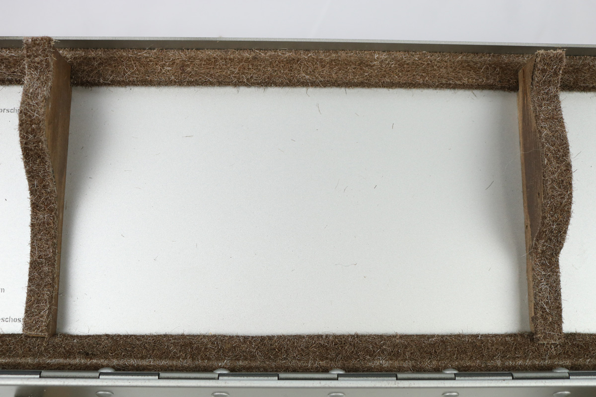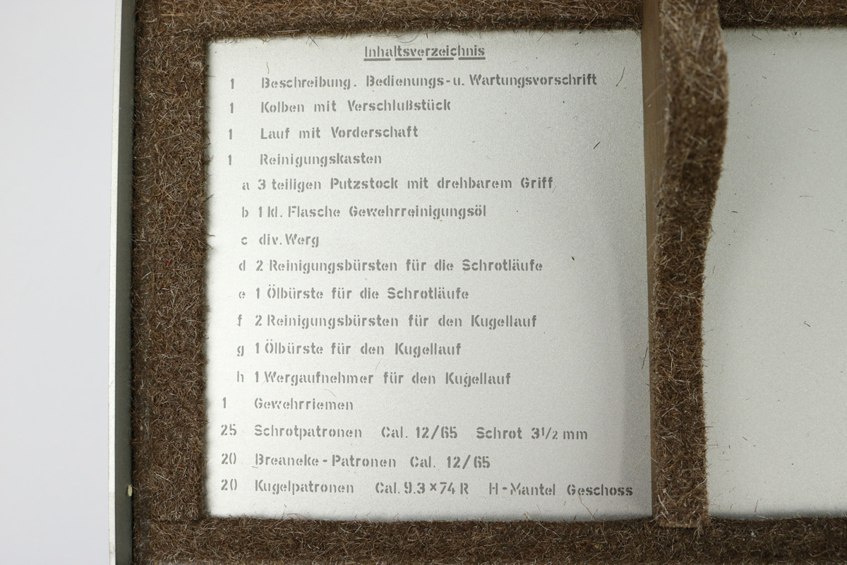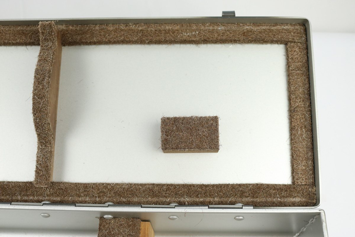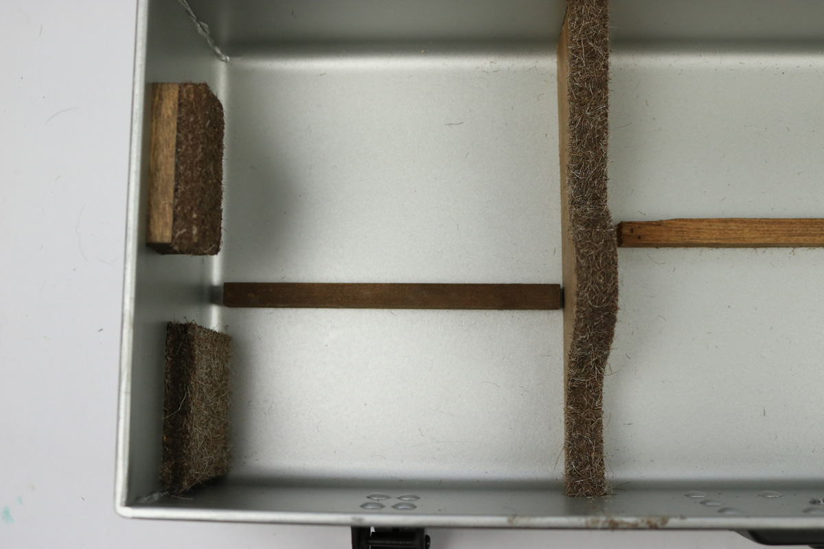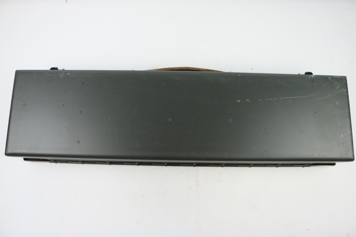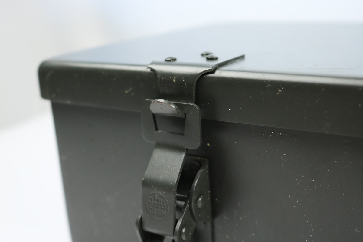 8/31/18 – This is an original WW2 Luftwaffe Drilling Rifle case that has been repainted. The result is a Drilling M 30 metal case in like-new condition. The only wear is some scuffing / residue on the lower right side of the base. This white residue is shown in photos and could likely be cleaned off. The rest of the case is excellent – as shown in photos. These are very scarce cases and make use as a great display piece for your collection or place holder for a WW2 Luftwaffe drilling.