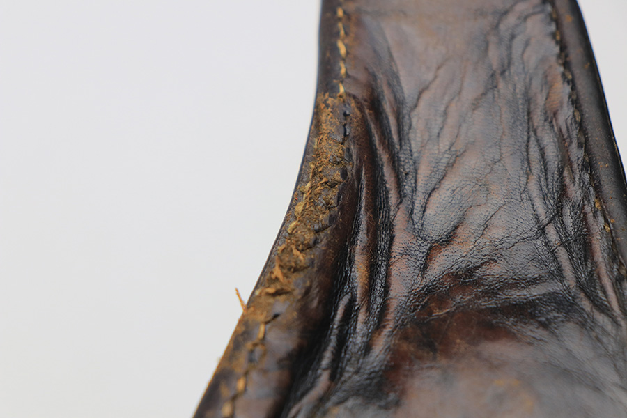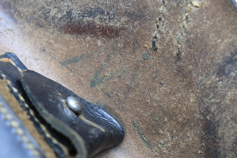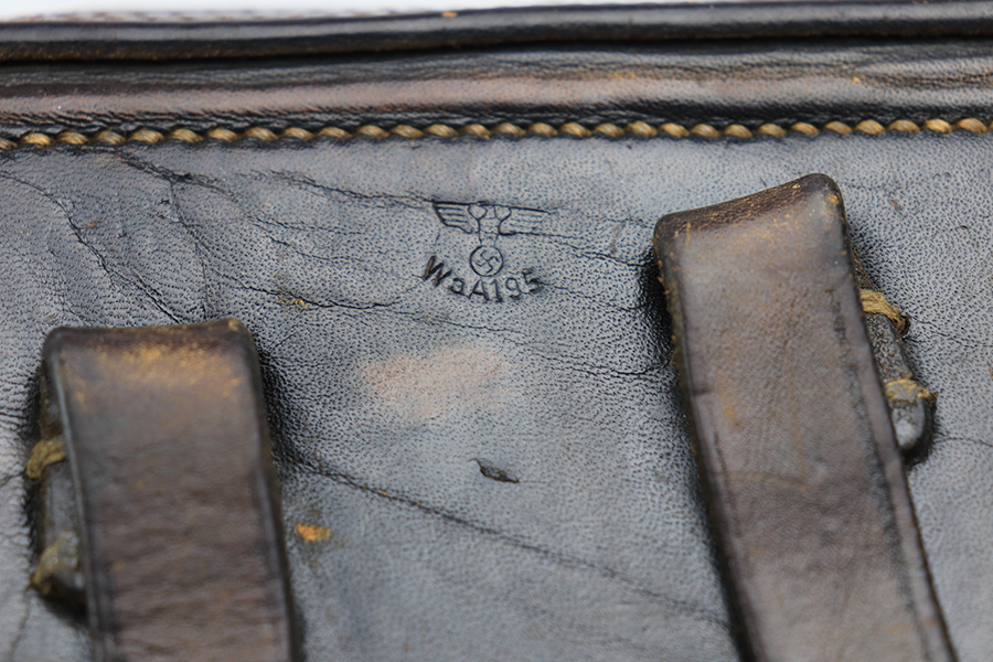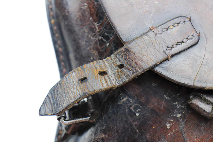 1/13/22 – This is a WW2 original Luger holster. The holster has a VERY faint maker stamp, date, and waffen proof on the back leather, but the waffen proof is the only clearly visible stamp. The maker and date are extremely faint, and we think the date is 1940 but we aren’t sure. The leather has some surface cracking and wrinkling along with typical signs of aging and use. The stitching is all in tact except for a few loose stitches along the side of the holster near the toe – see photos.