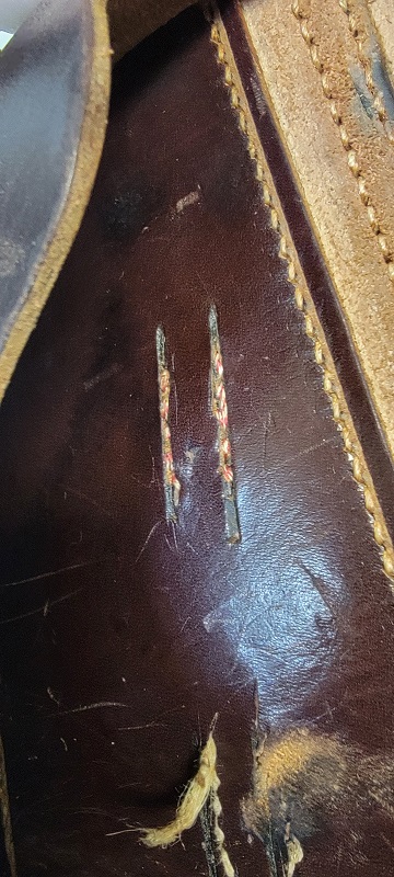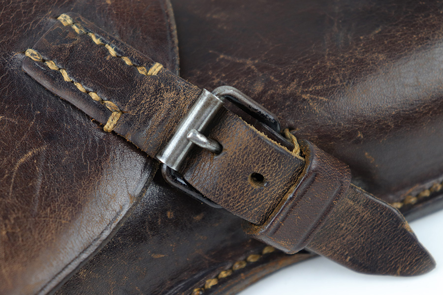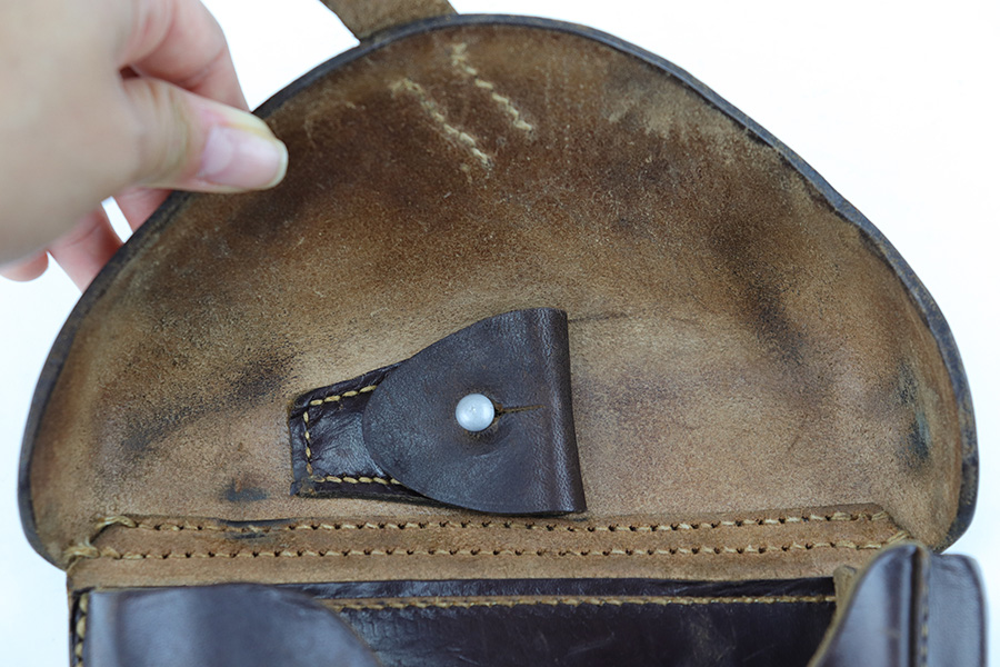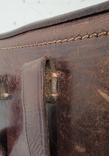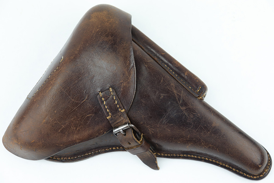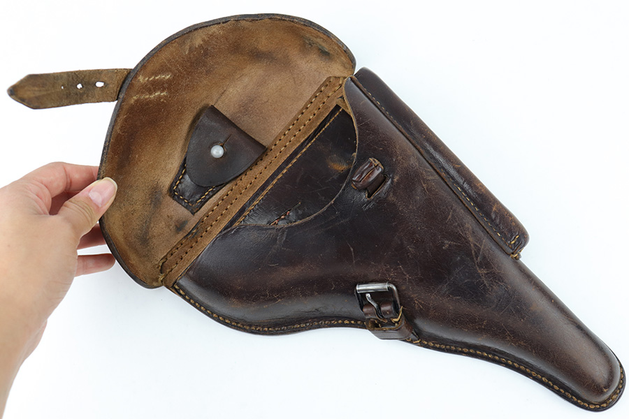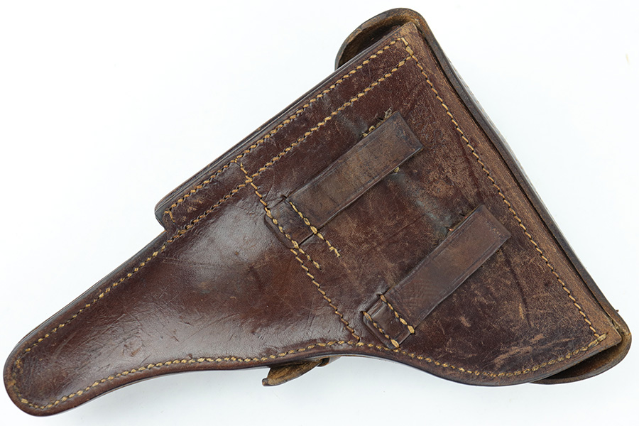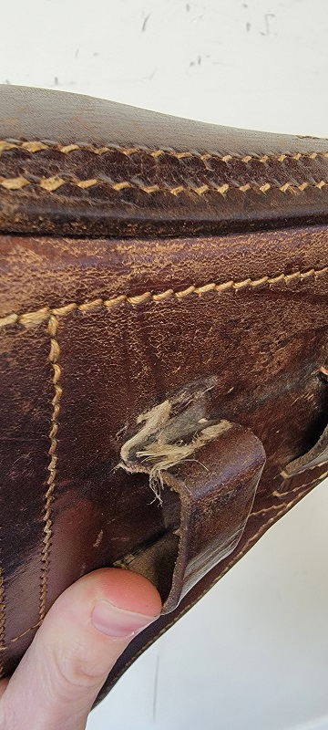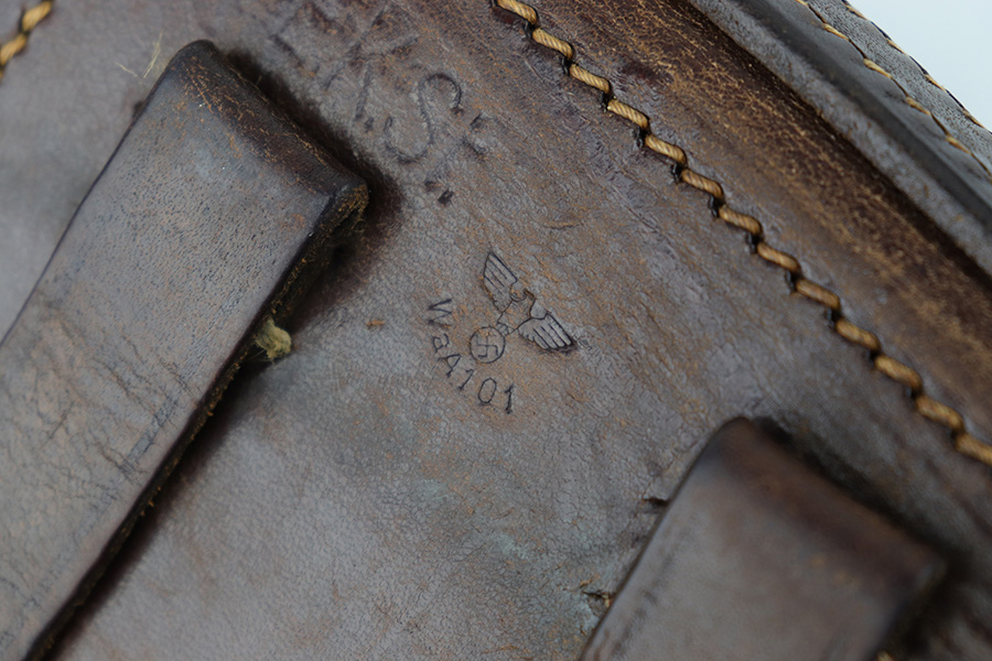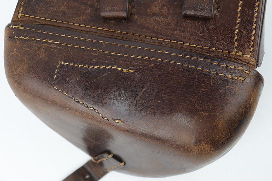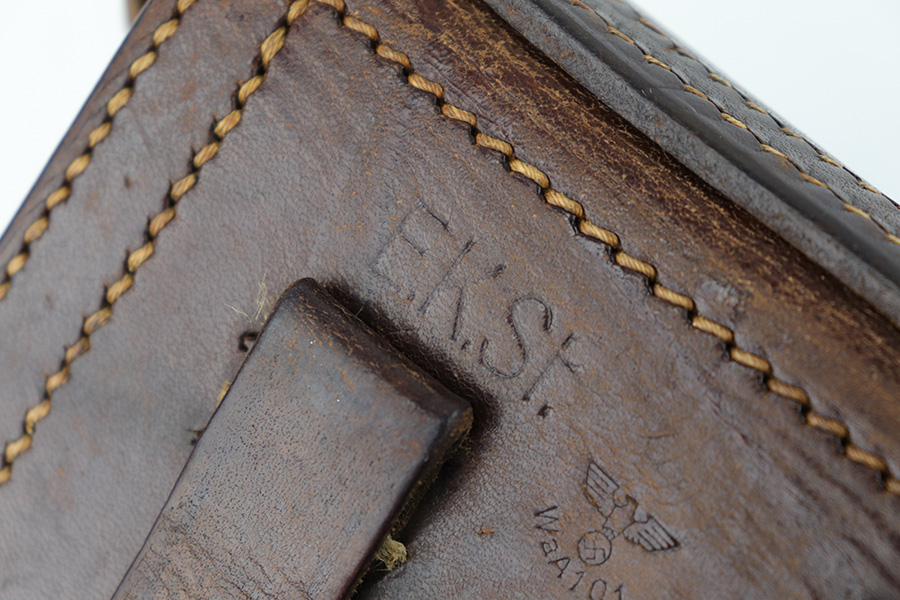 6/15/23 – This is an original WW2 production luger holster. The holster is in great overall condition with very nice brown leather. The lather has some mild surface scuffs and light pliability with a clean interior. The back leather is stamped with a fairly uncommon maker “E.K. St.” and a waffen military proof stamp. There’s no visible date, but other examples we’ve found from this maker date 1938-1940. The stitching is all tight and original, and in great condition except for on the upper portion of the belt loops. The right belt loop is re-stitched at the top of the loop, while the left belt loop is missing one line of stitching. Otherwise this example is in near-excellent condition.