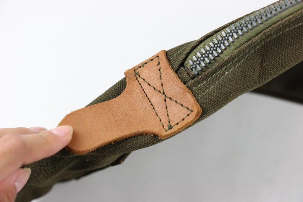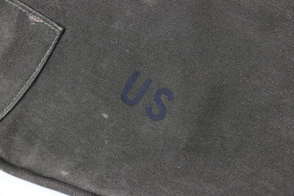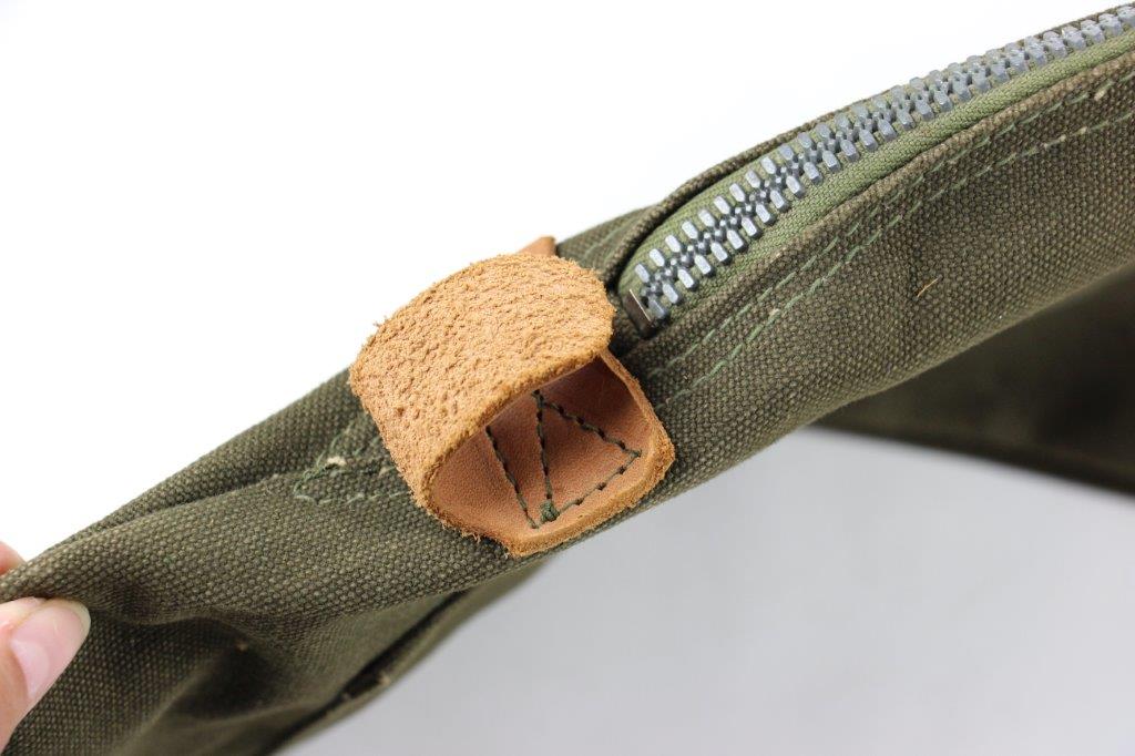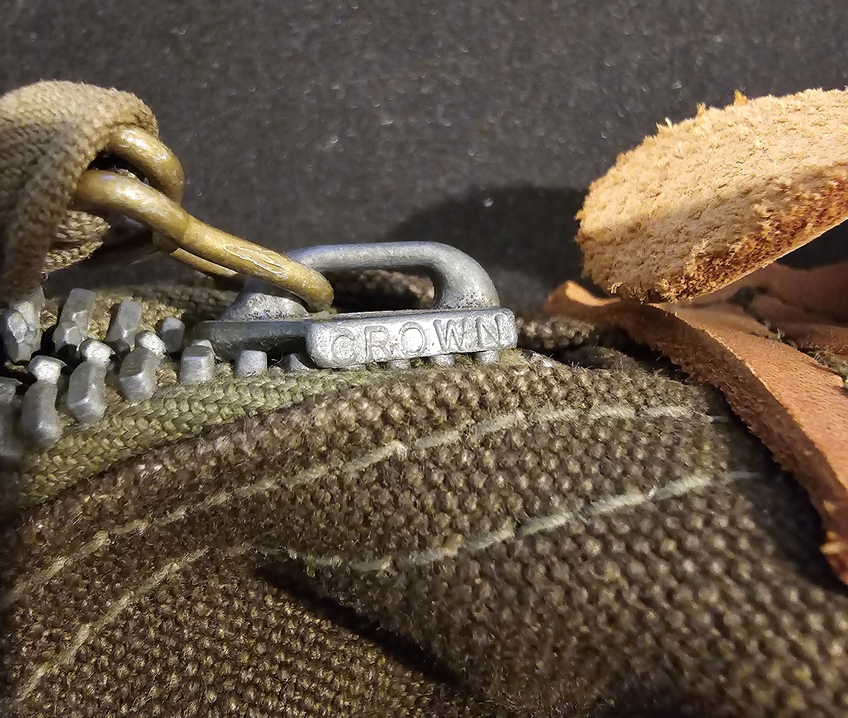 8/20/24 – This is an original WW2 US M1 Carbine Rifle Carry / Transport Case. The case is made from thick olive green canvas material and is ink stamped “US” on the exterior. One of the leather tabs on the end of the zipper opening is missing, as shown in photos. The other tab is excellent. Nonmagnetic zipper assembly which is marked “CROWN / USA” on either side. No interior ink stamp for maker or date, but the style and natural age indicates WW2 production. Original canvas weave carry strap attached and in excellent condition.